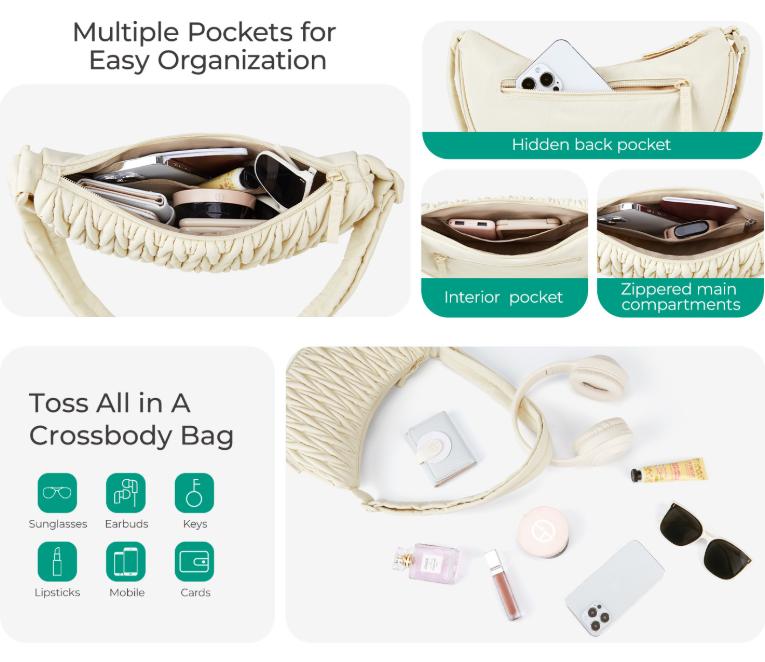 - Smart Organization: Thoughtfully designed with multiple pockets to keep your essentials organized. Includes a spacious zippered main compartment, an interior slip pocket for smaller items, and a discreet hidden back zippered pocket for valuables like your phone or cards.