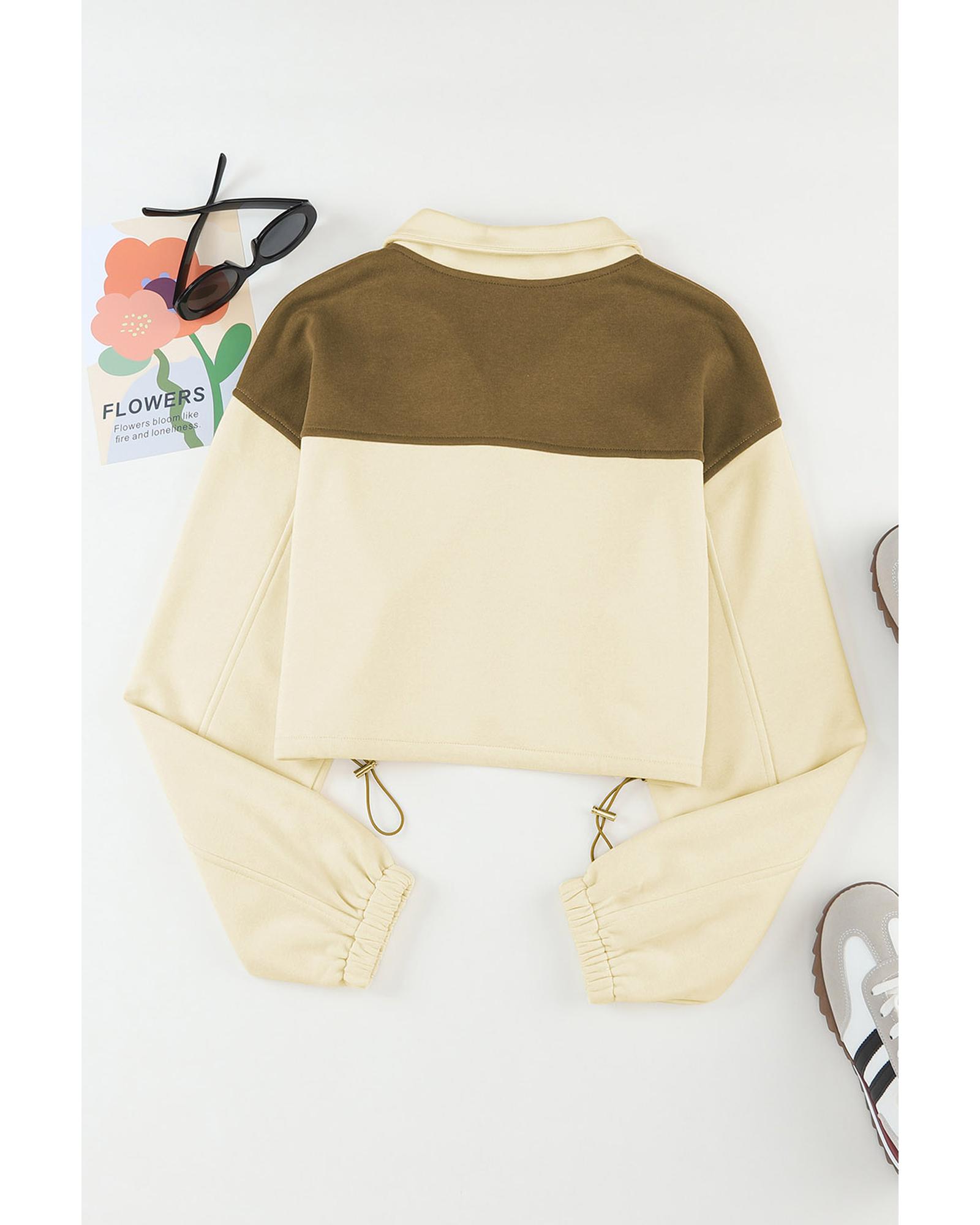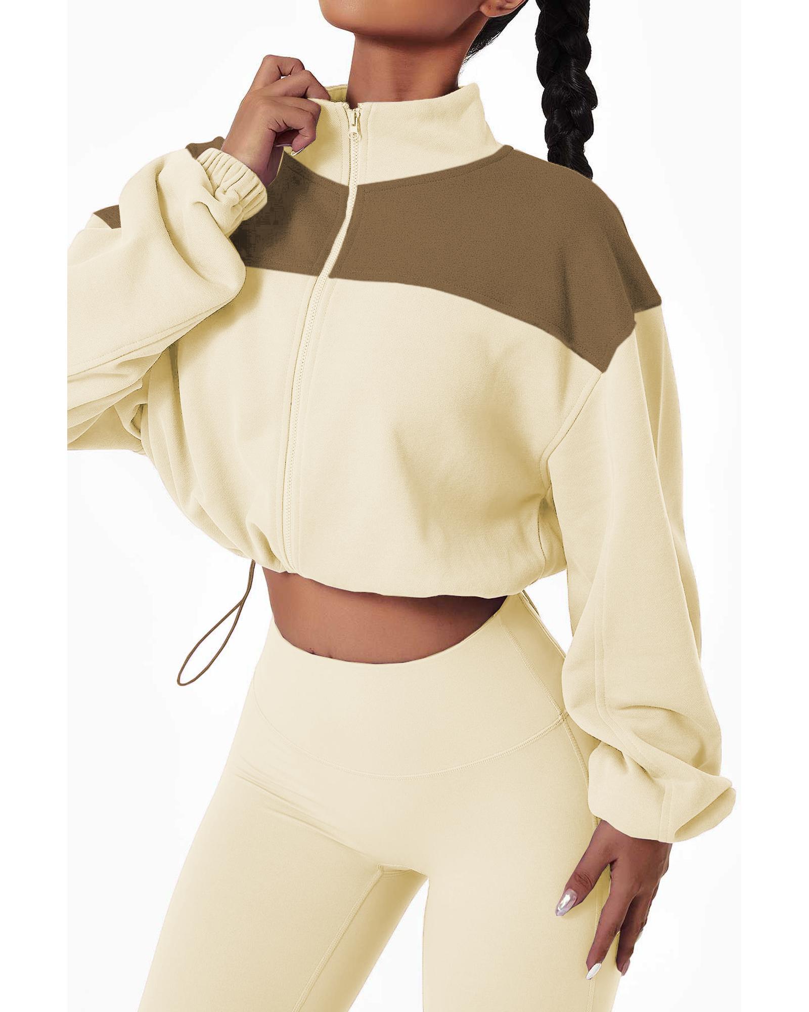 Beige Color Block Drawstring Cropped Athleisure Jacket – M