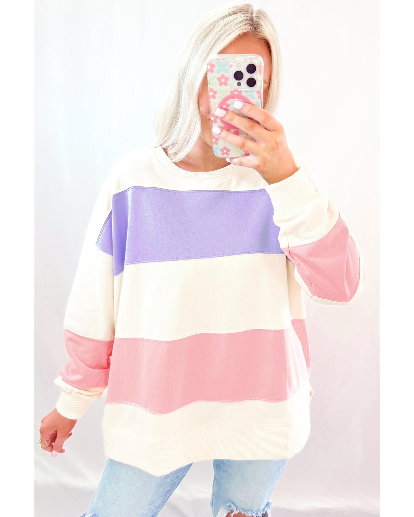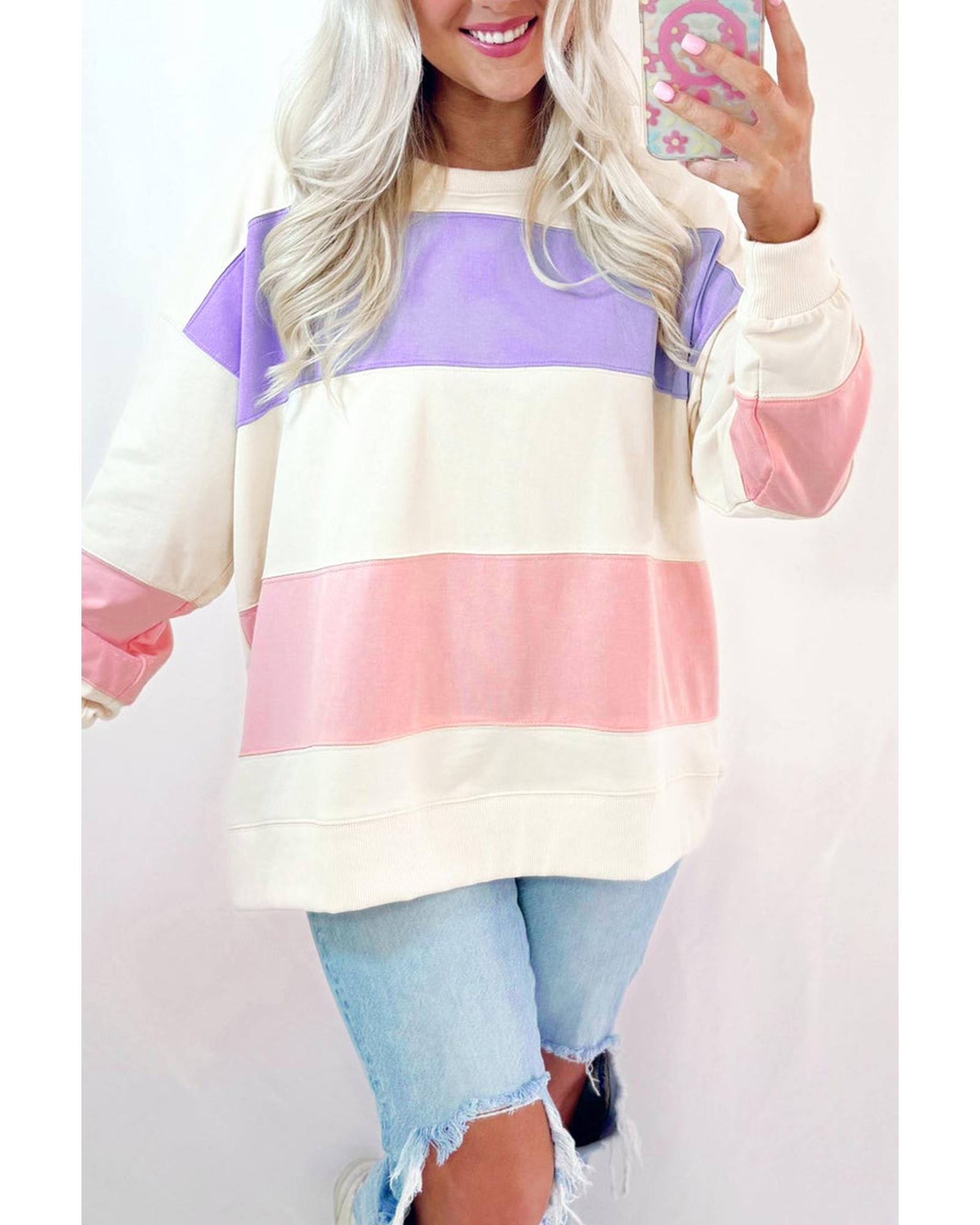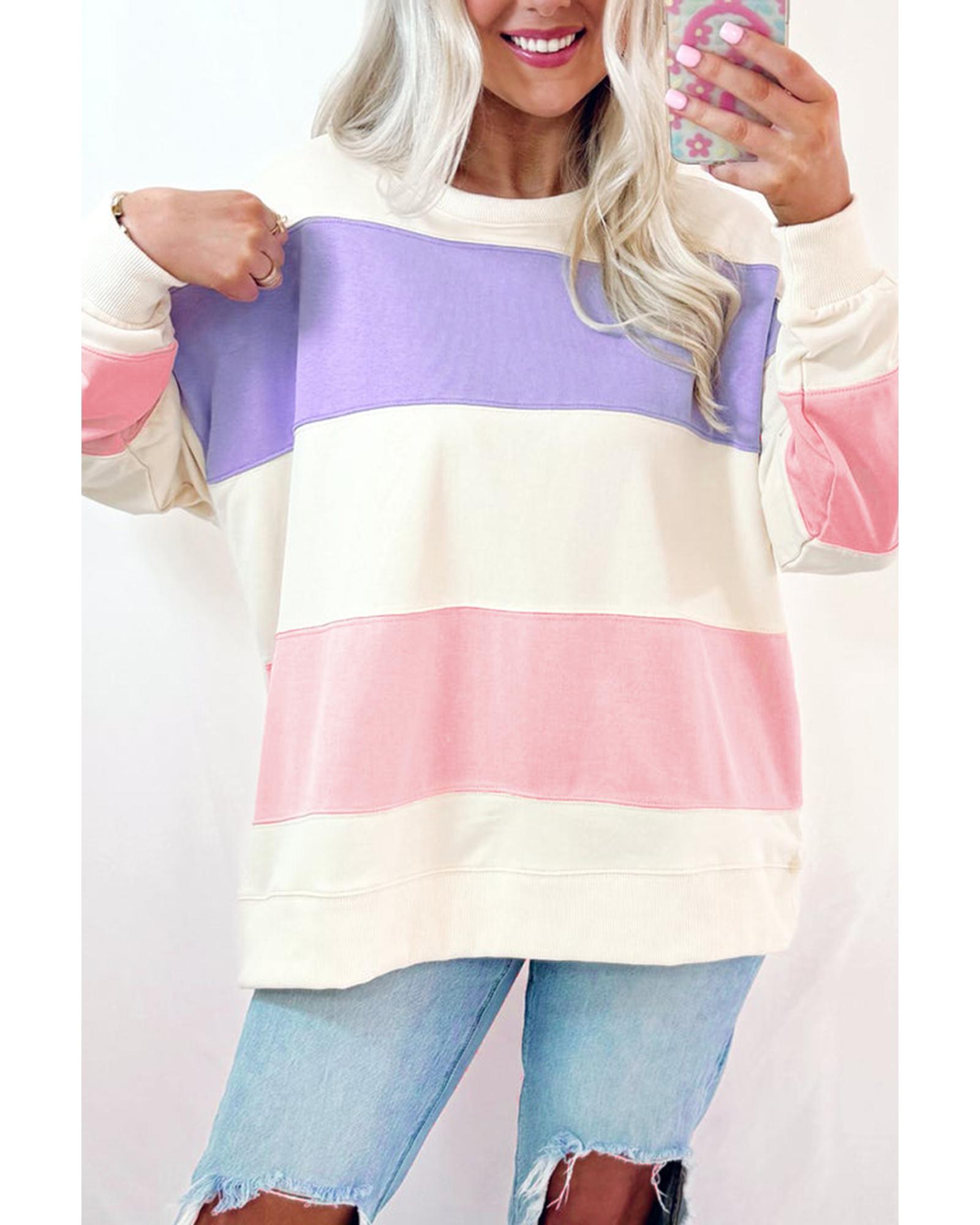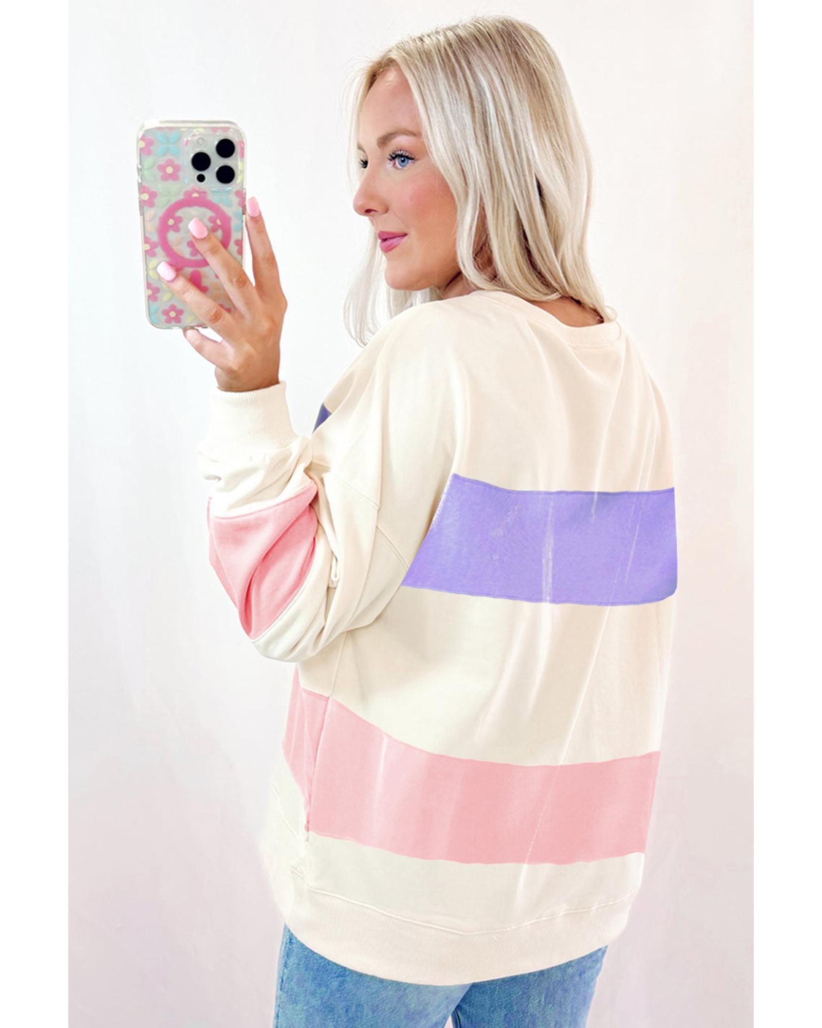 Beige Colorblock Patchwork Drop Shoulder Crewneck Sweatshirt – L