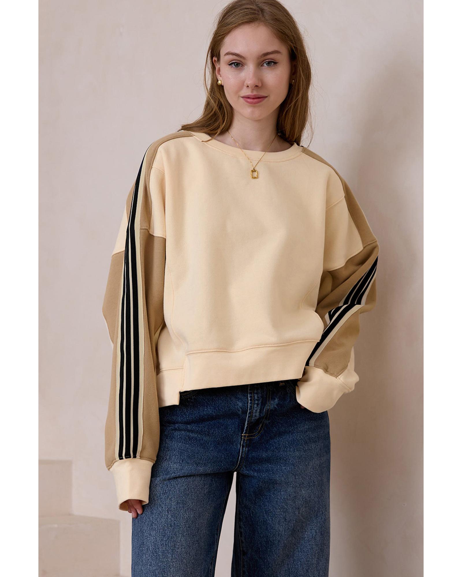 Beige Contrast Striped Patchwork Drop Shoulder Loose Sweatshirt – S
