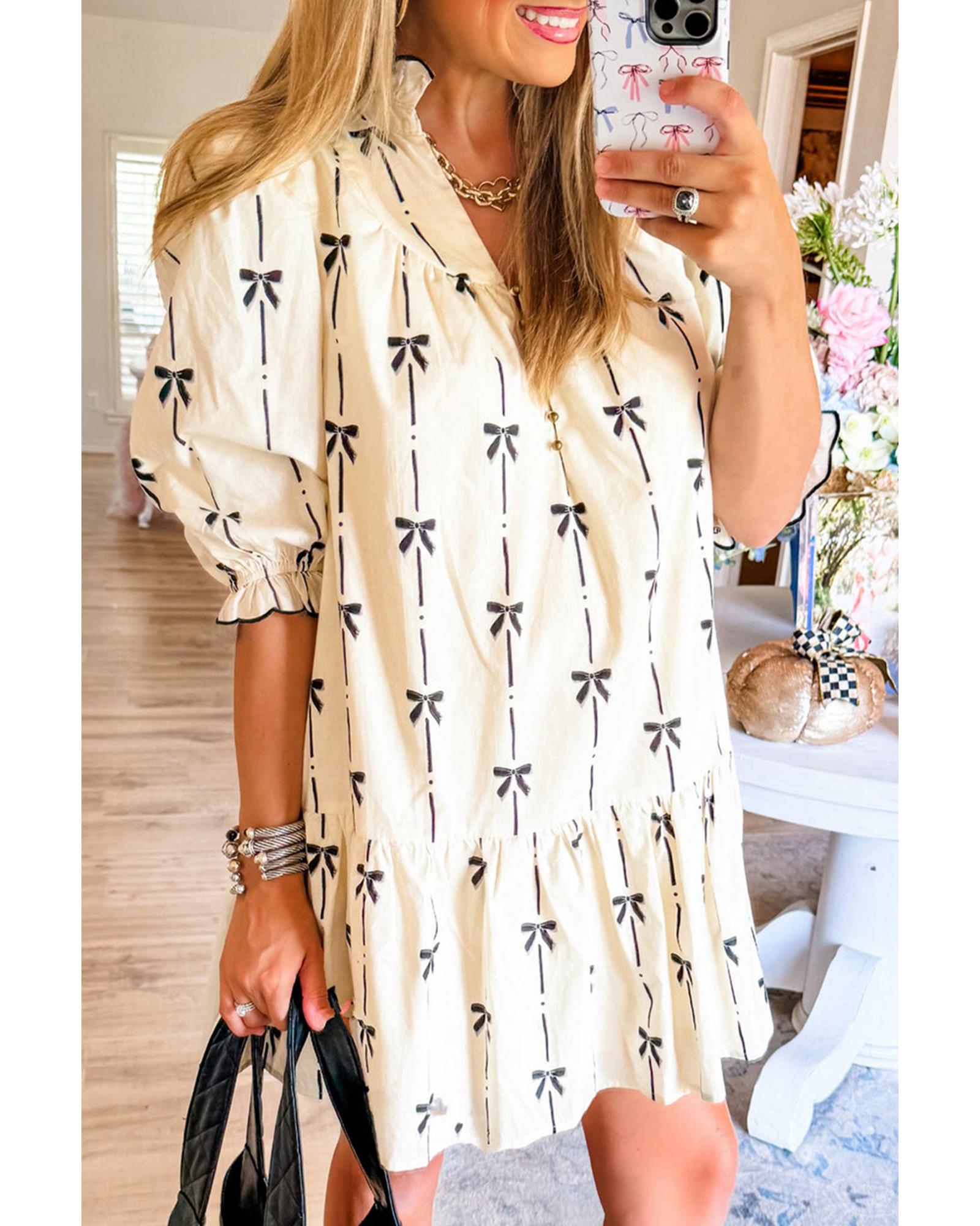 Beige Cute Bowknot Printed Bubble Sleeve V Neck Mini Dress – L
