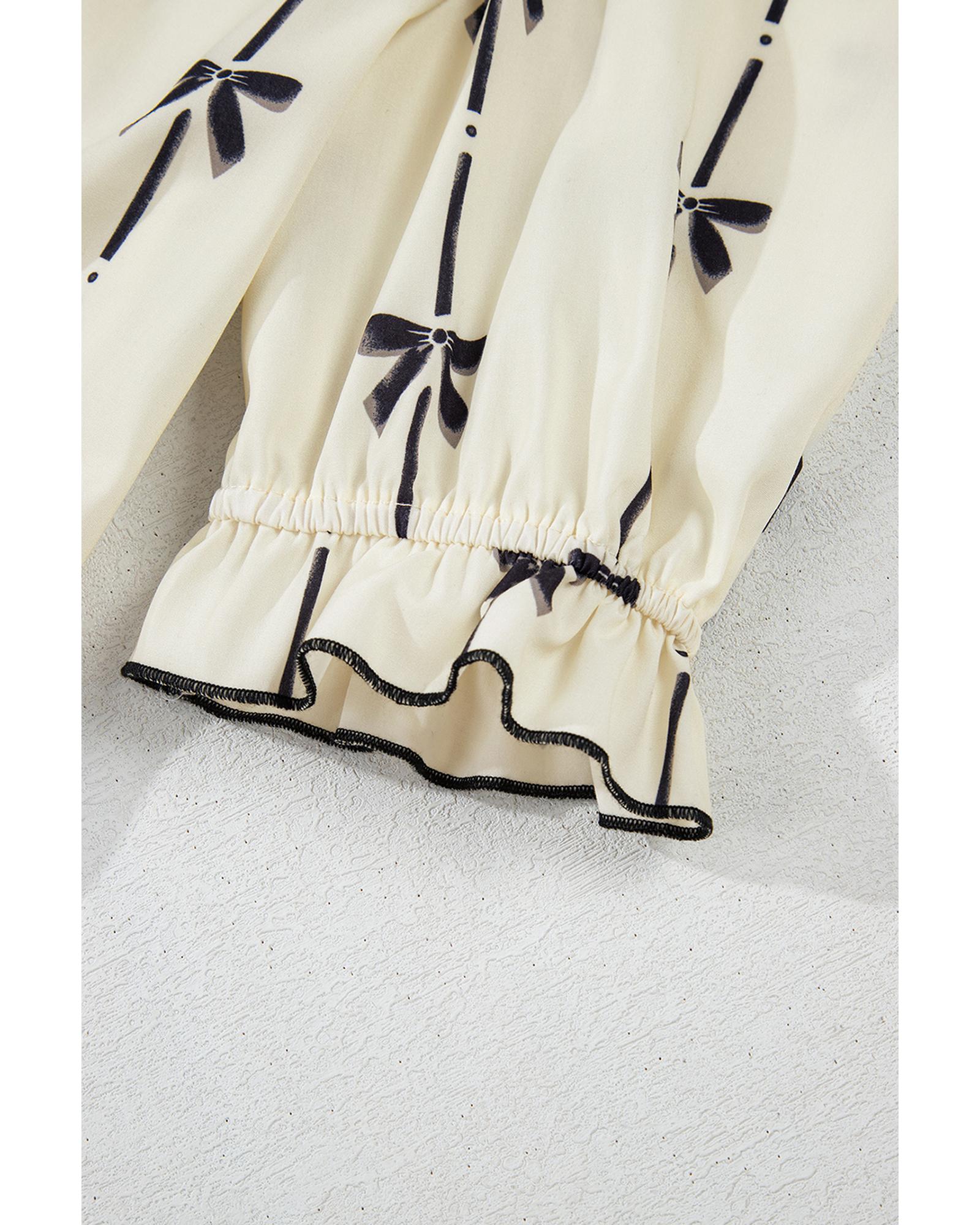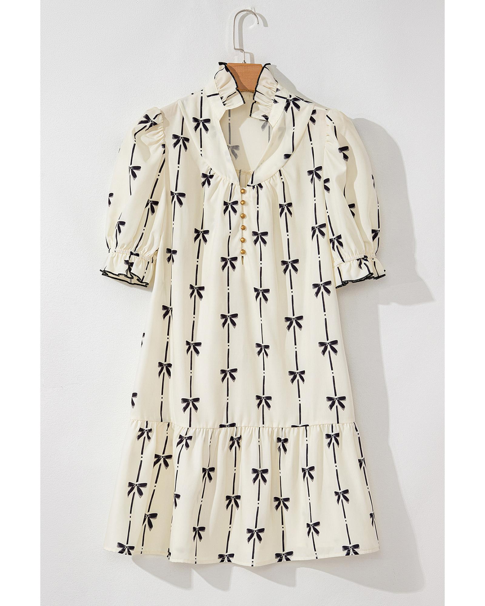 Beige Cute Bowknot Printed Bubble Sleeve V Neck Mini Dress – M