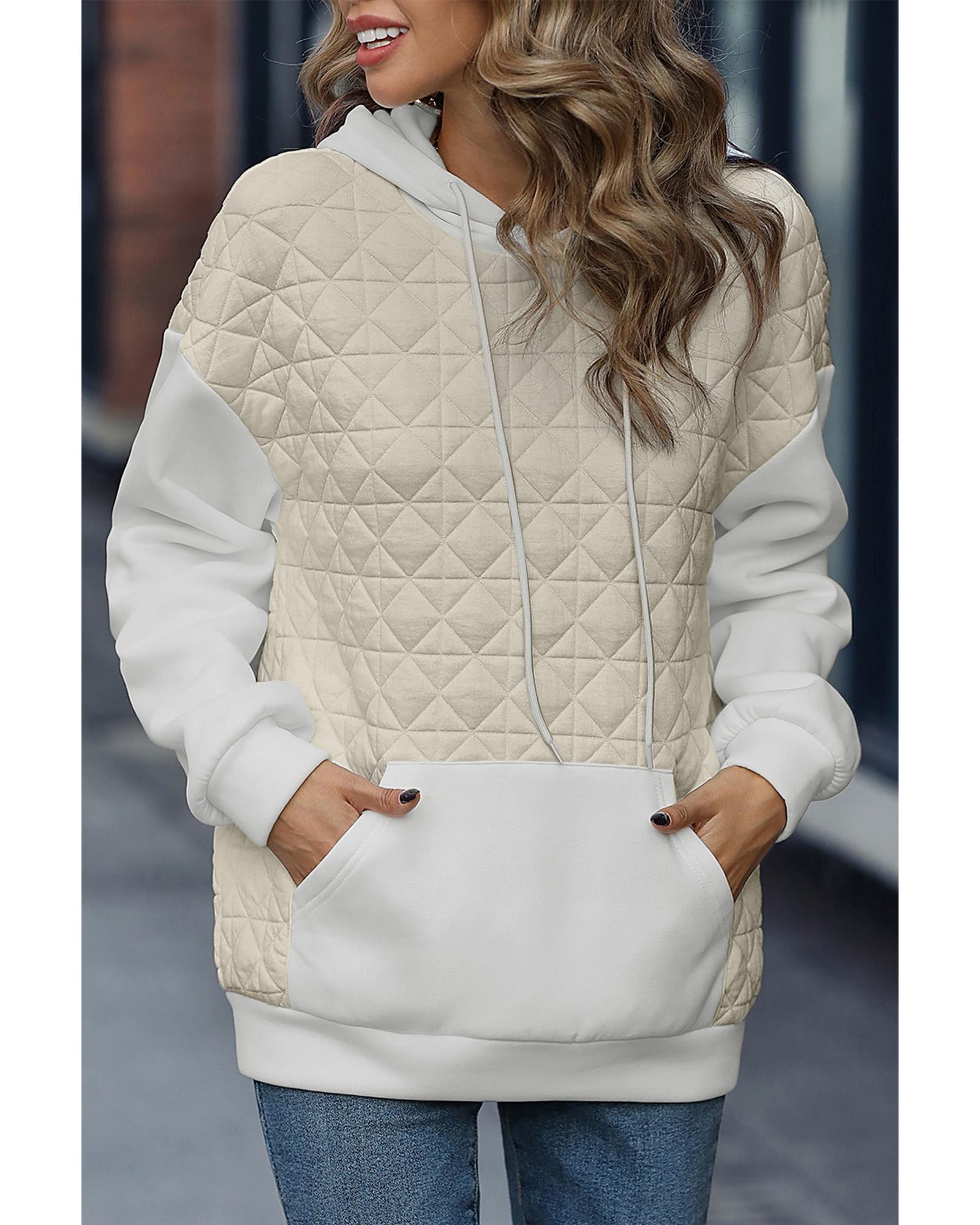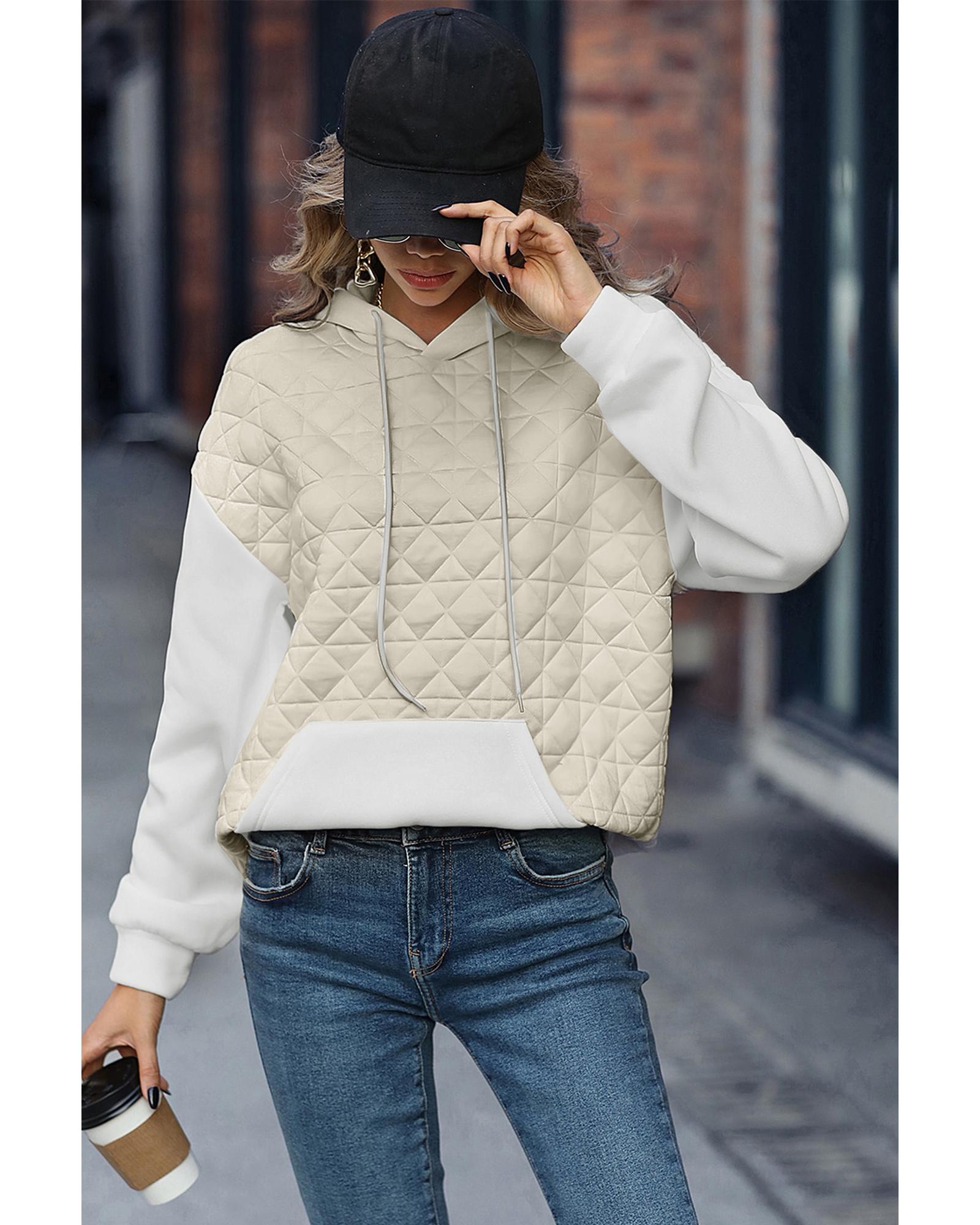 Beige Drop Shoulder Quilted Patchwork Kangaroo Pocket Hoodie – S