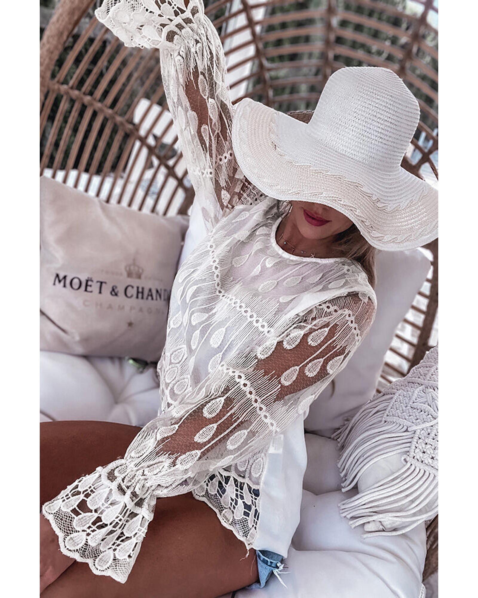 Beige Embroidered Mesh Flounce Sleeve Blouse – M