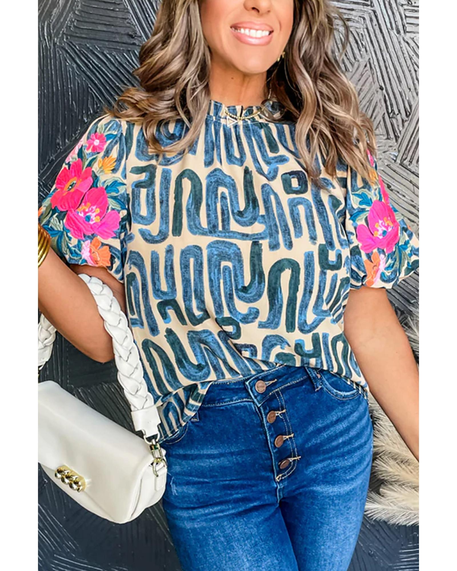Beige Embroidered Puff Sleeve Frilled Neck Printed Top – L
