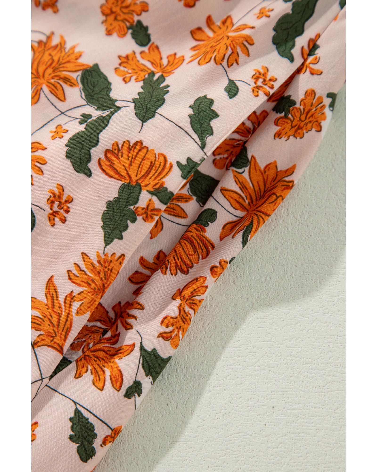 • Beige Floral Deep V Neck Smocked Bust Bubble Sleeve Babydoll Dress