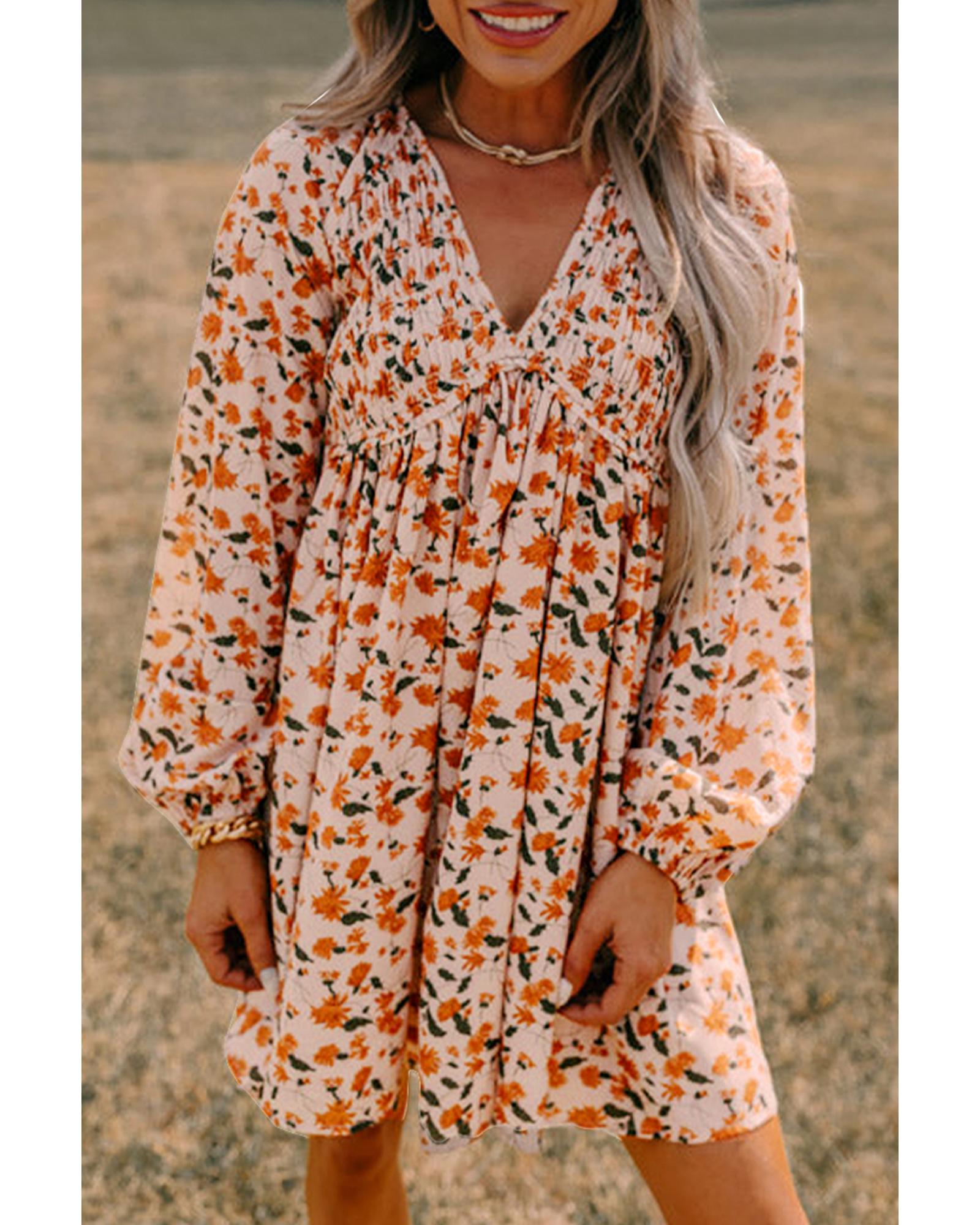 - Beige Floral Deep V Neck Smocked Bust Bubble Sleeve Babydoll Dress