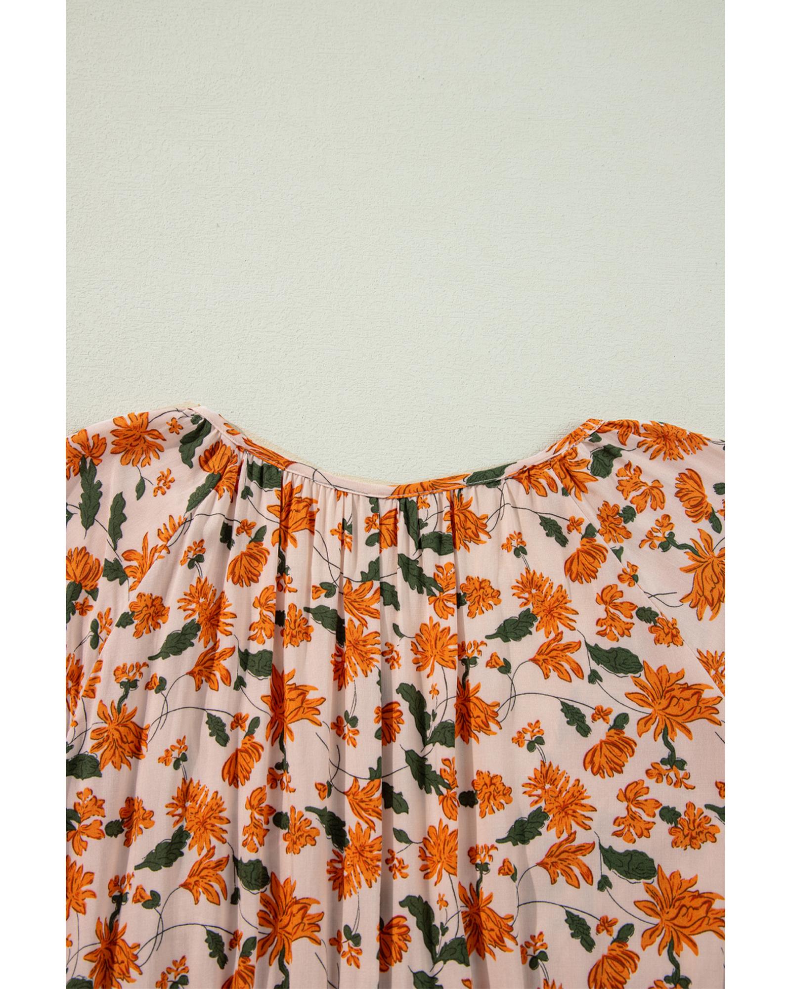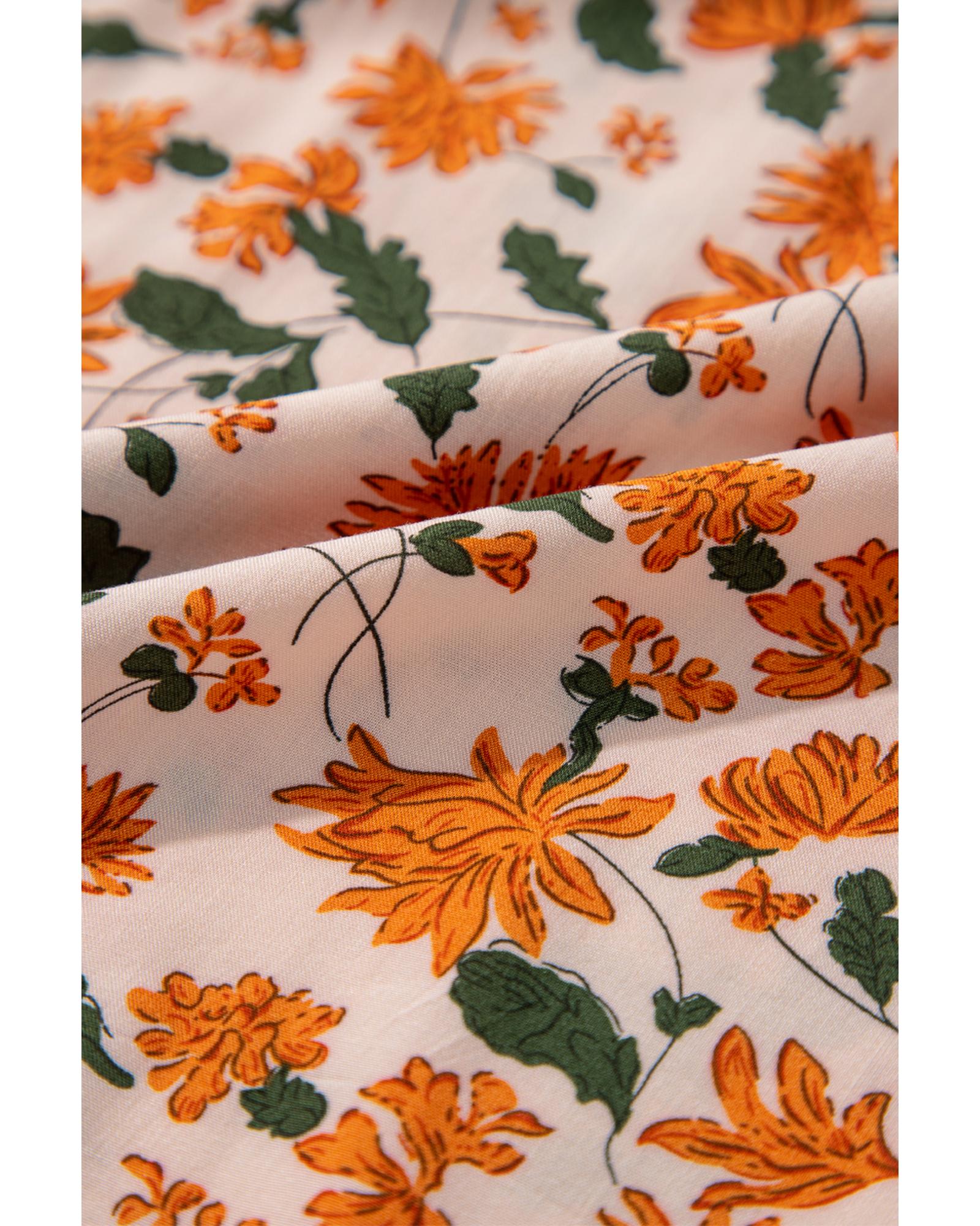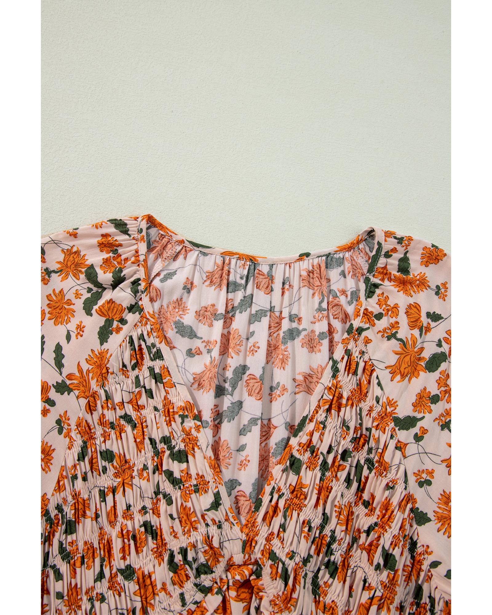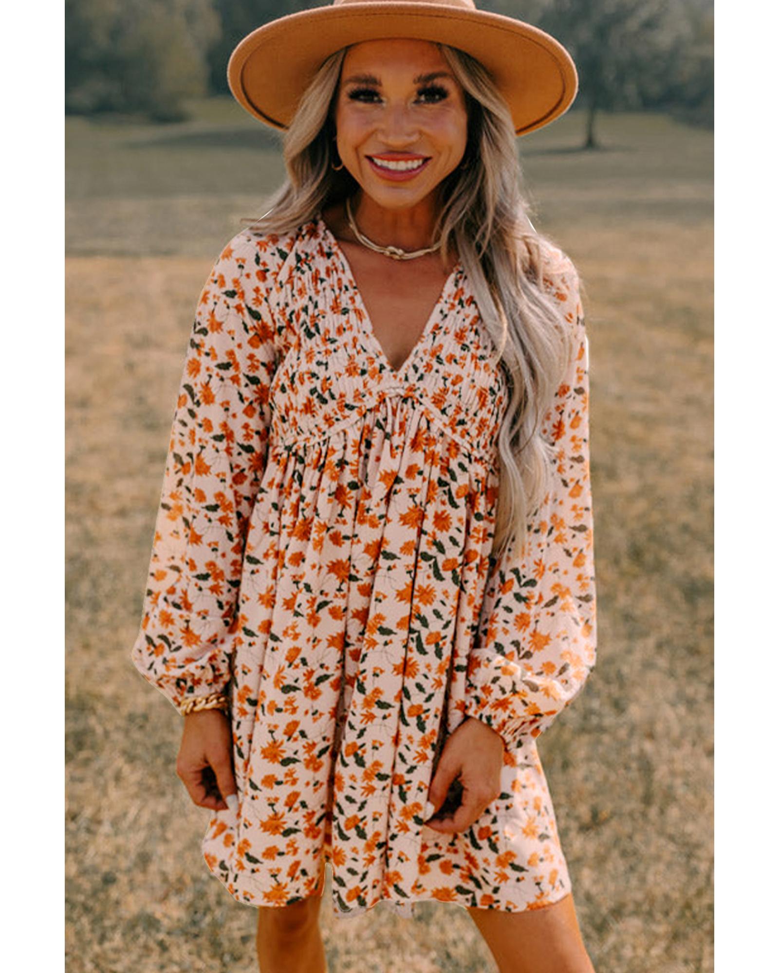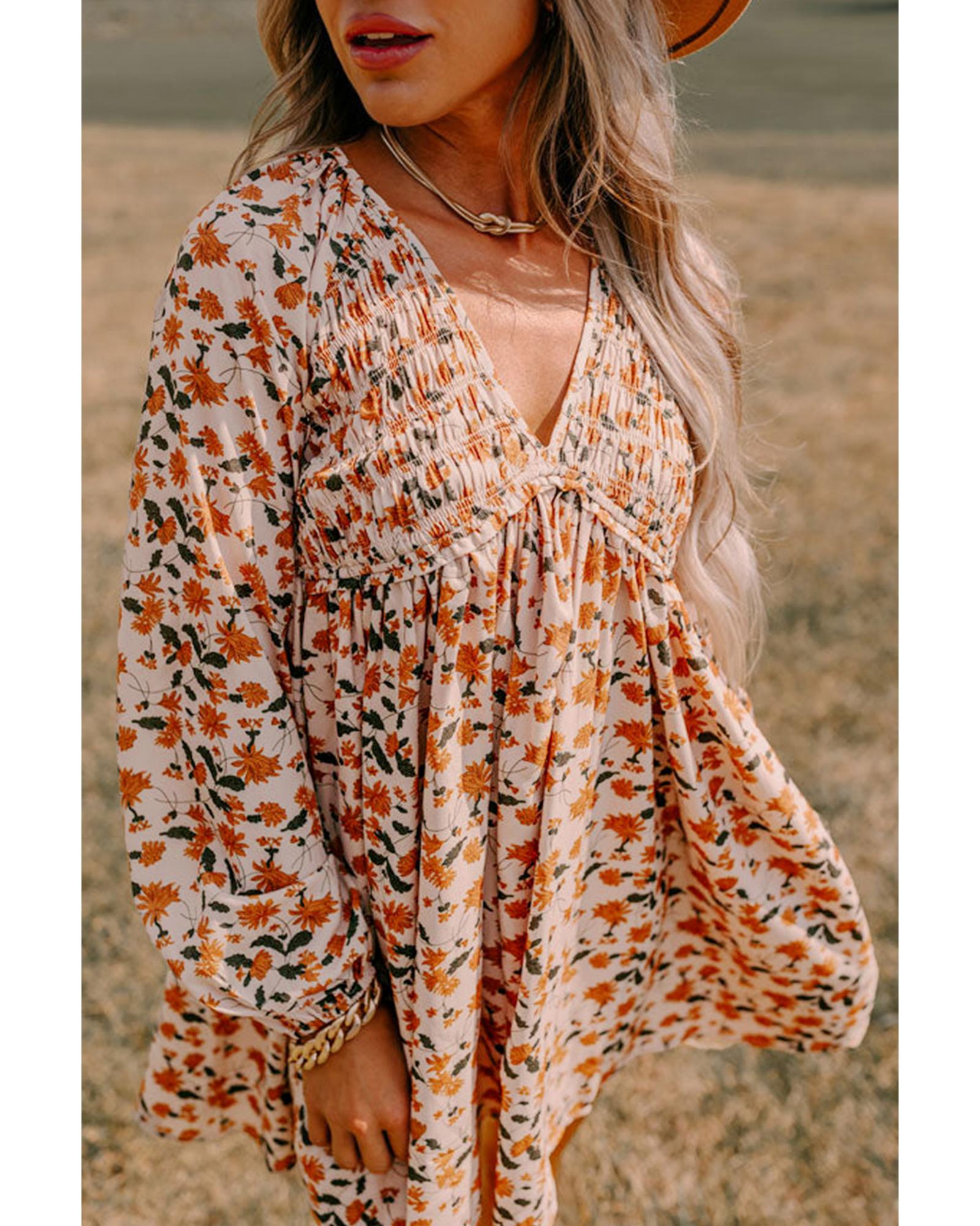 - Beige Floral Deep V Neck Smocked Bust Bubble Sleeve Babydoll Dress