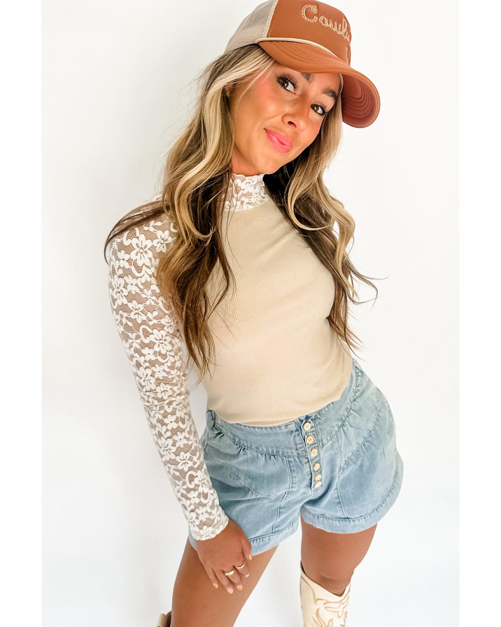 - Beige floral lace patchwork top