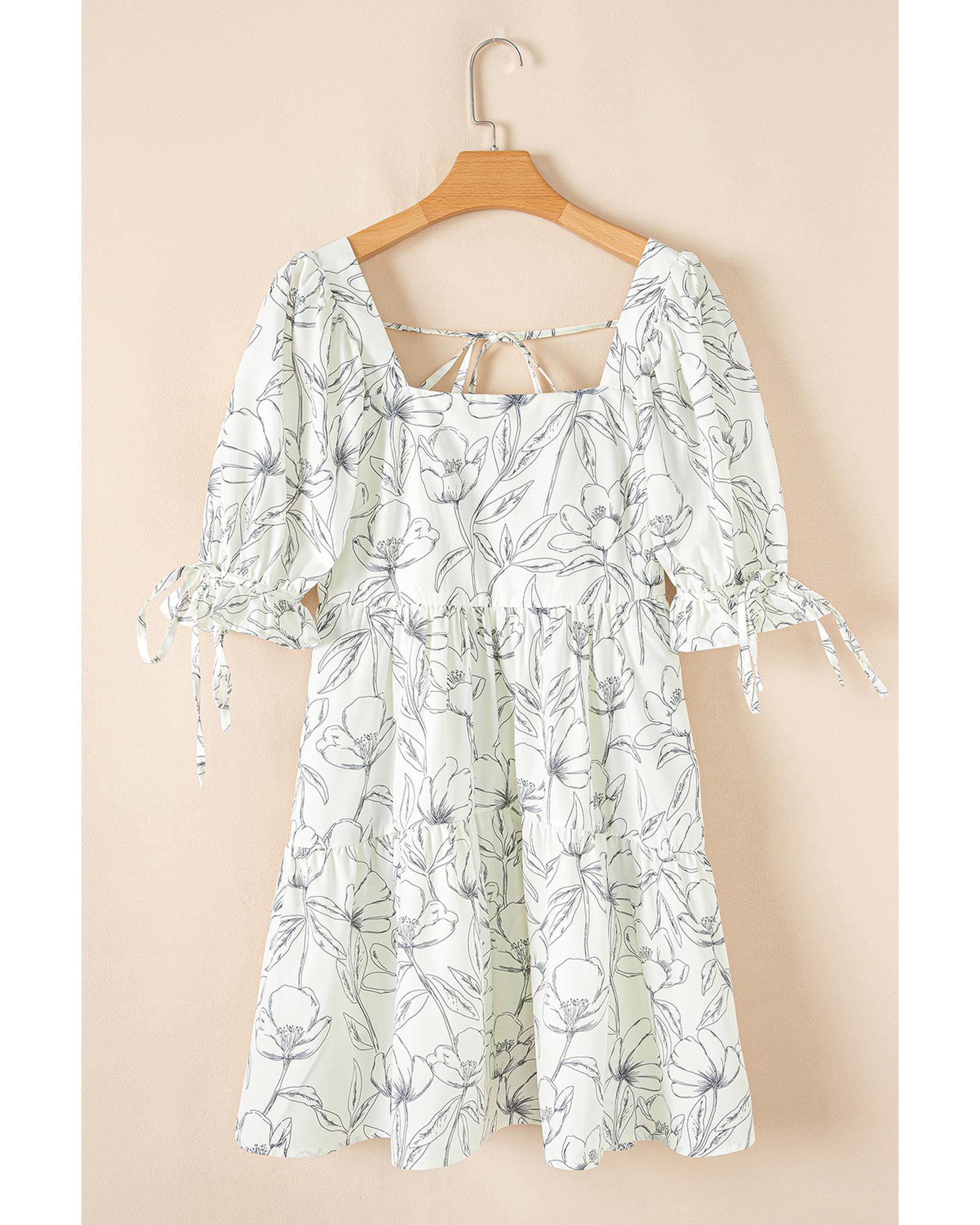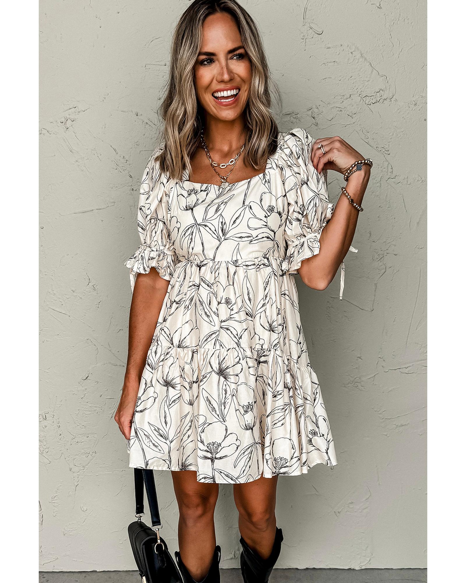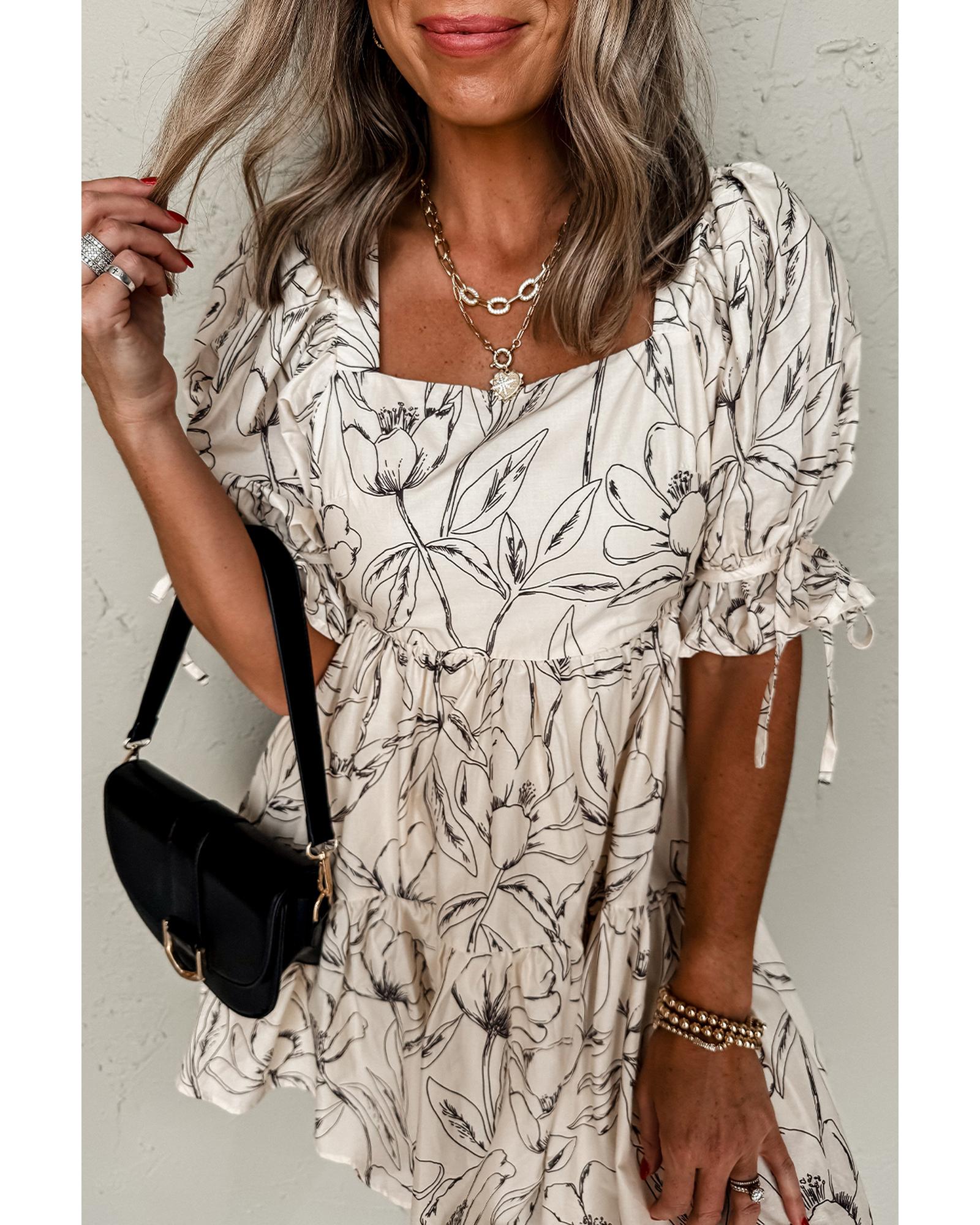 Beige Floral Print Square Neck Shirred Back Puff Sleeve Mini Dress – M