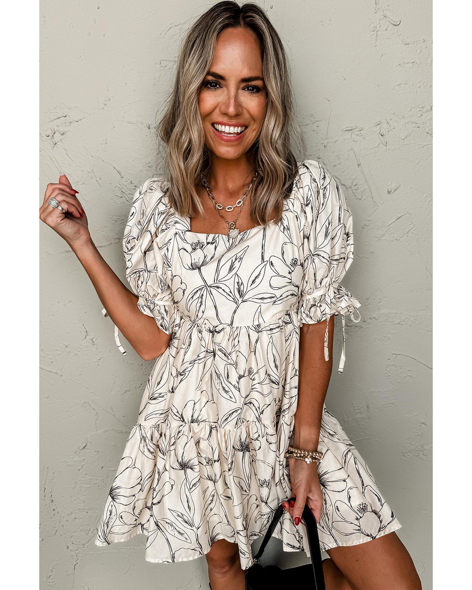 Beige Floral Print Square Neck Shirred Back Puff Sleeve Mini Dress – S
