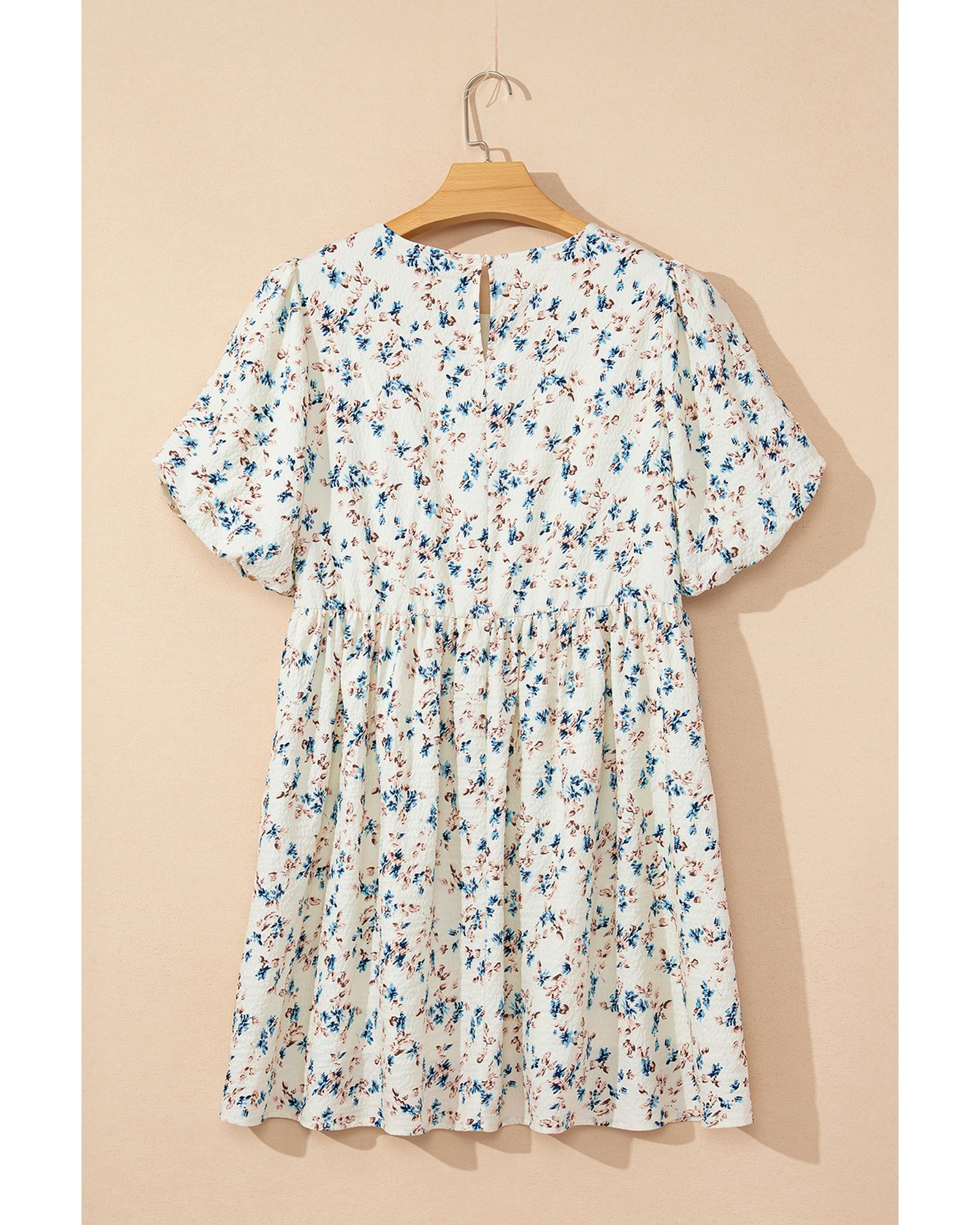 • Beige Floral Puff Short Sleeve Empire Waist Mini Dress