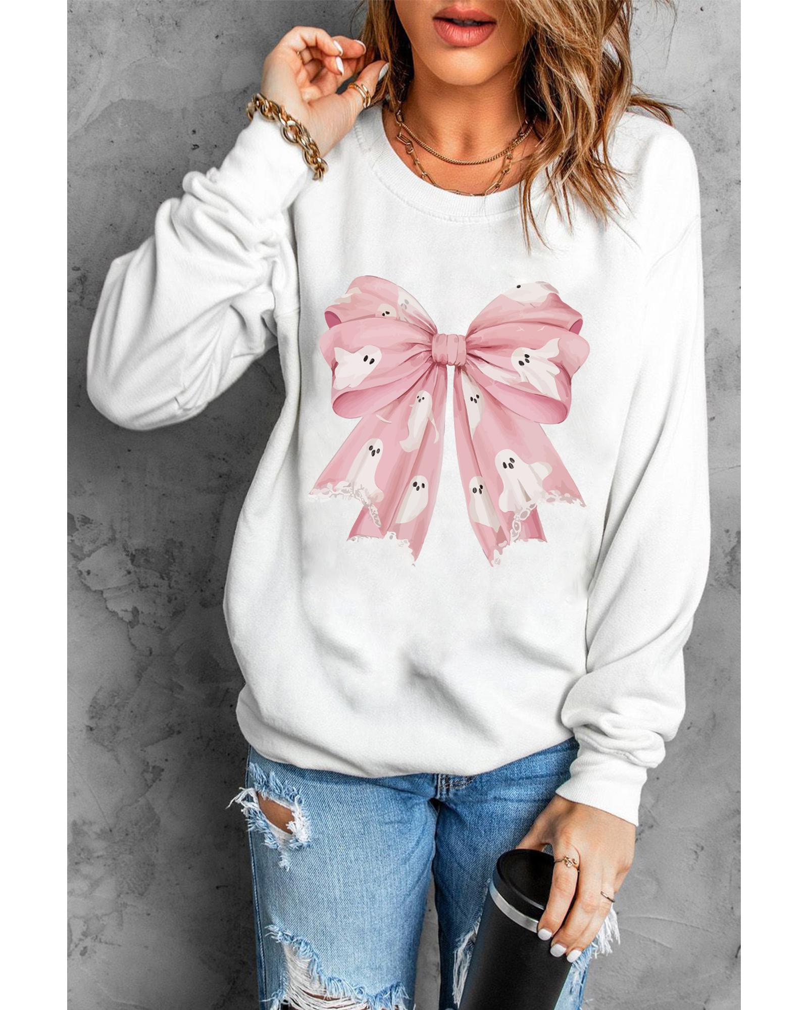 - Beige Ghost Bowknot Graphic Crew Neck Drop Shoulder Sweatshirt