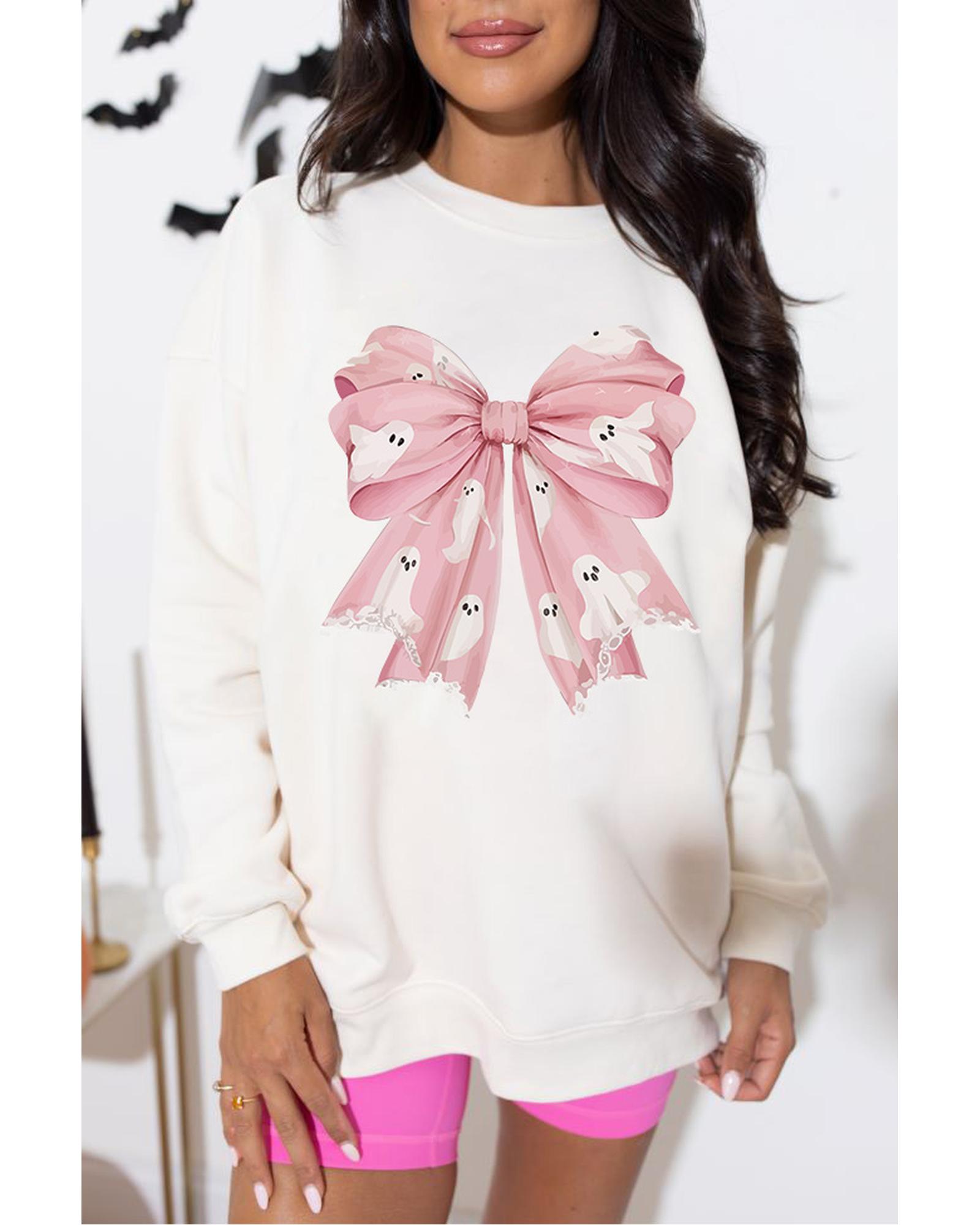 Beige Ghost Bowknot Graphic Crew Neck Drop Shoulder Sweatshirt – S