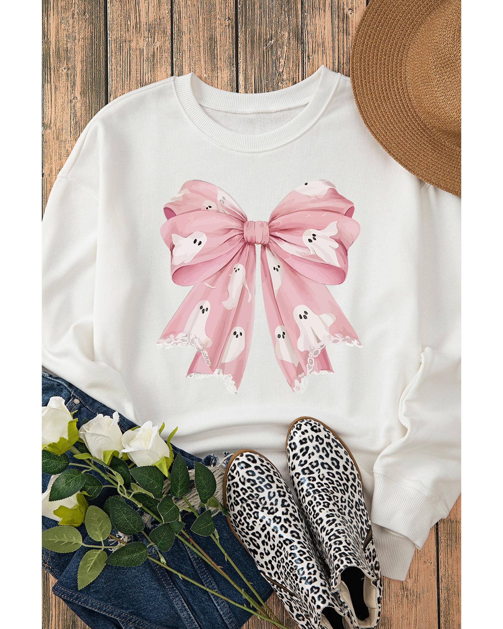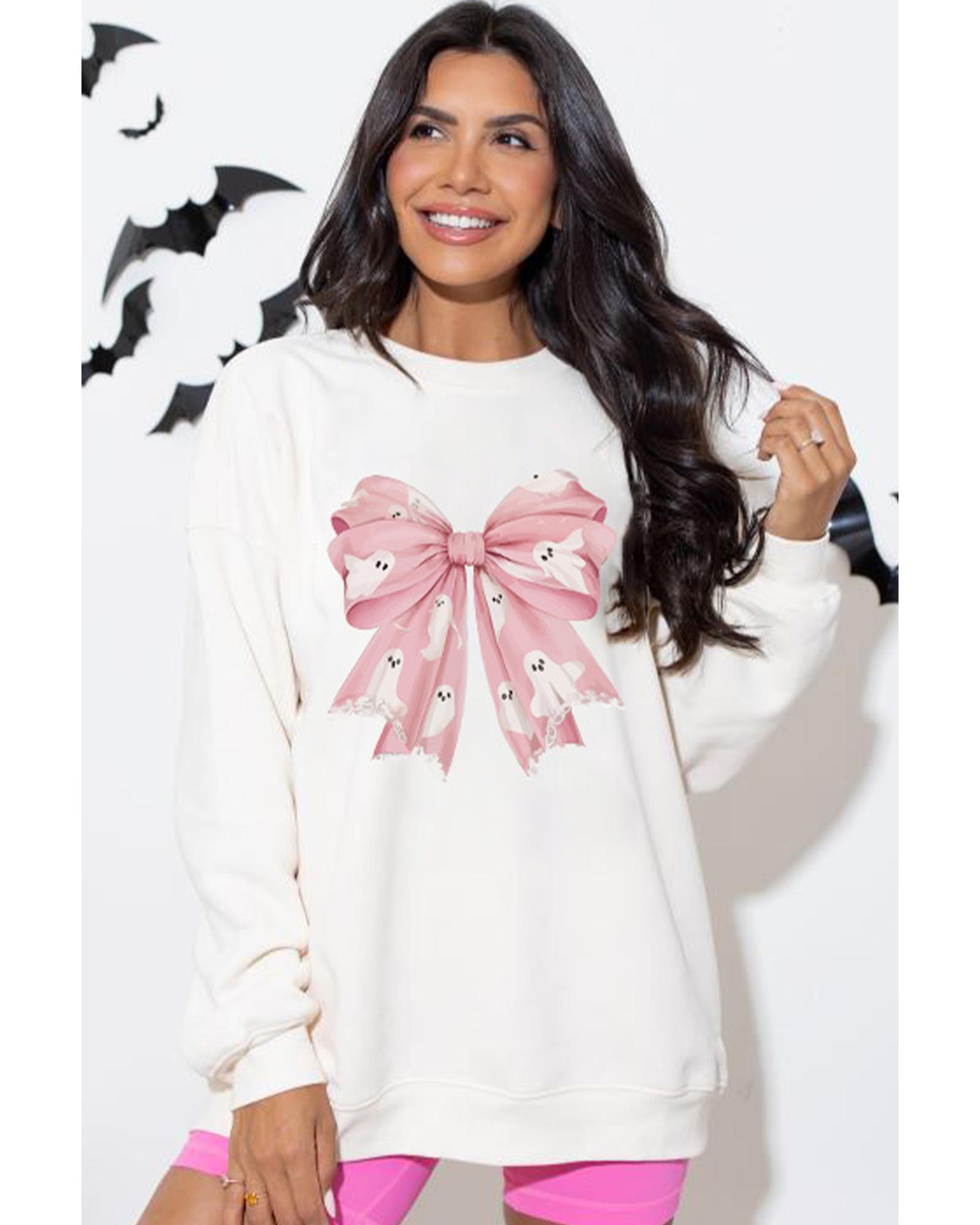 • Beige Ghost Bowknot Graphic Crew Neck Drop Shoulder Sweatshirt