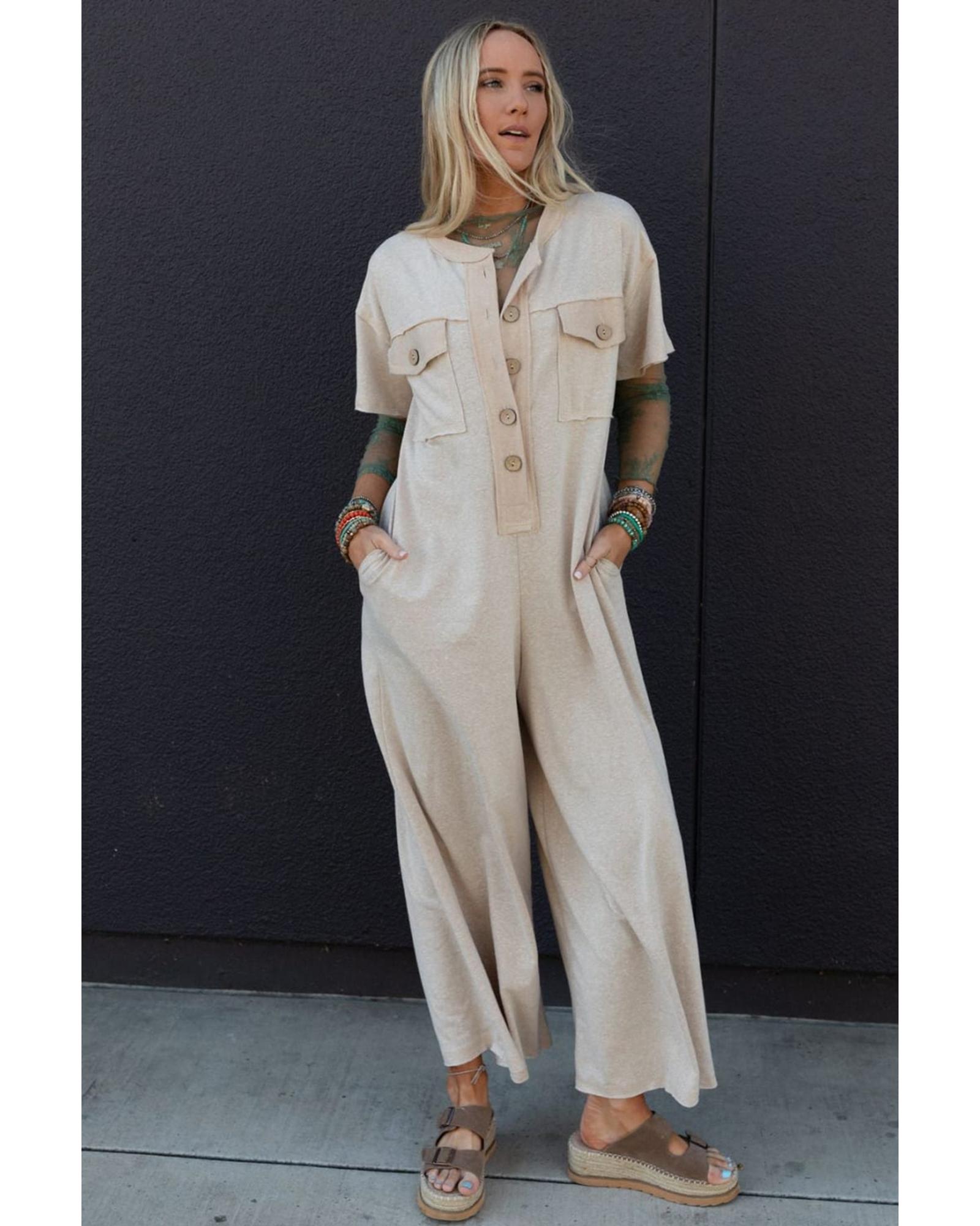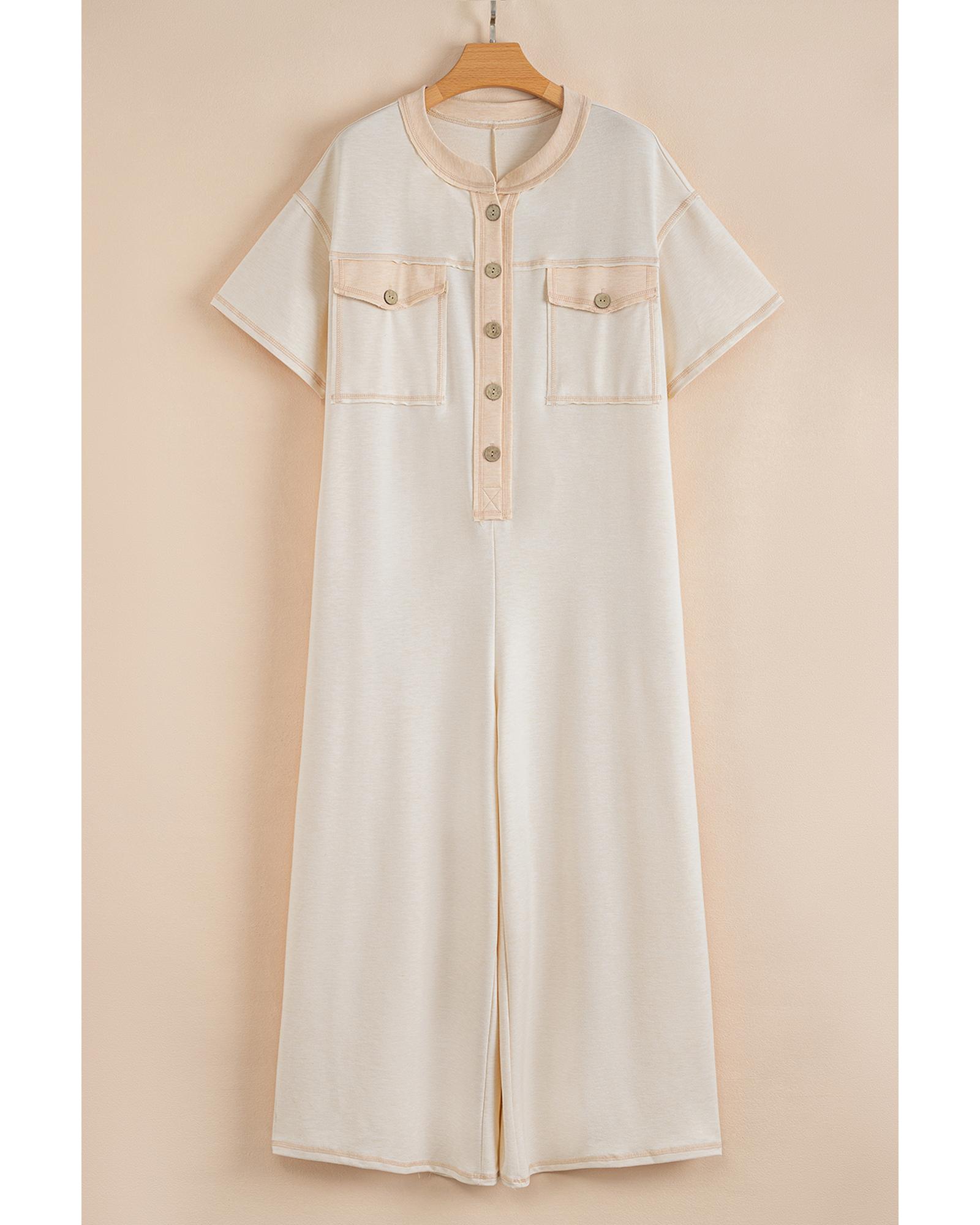 Beige Half Placket Chest Pockets Short Sleeve Wide Leg Jumpsuit – L