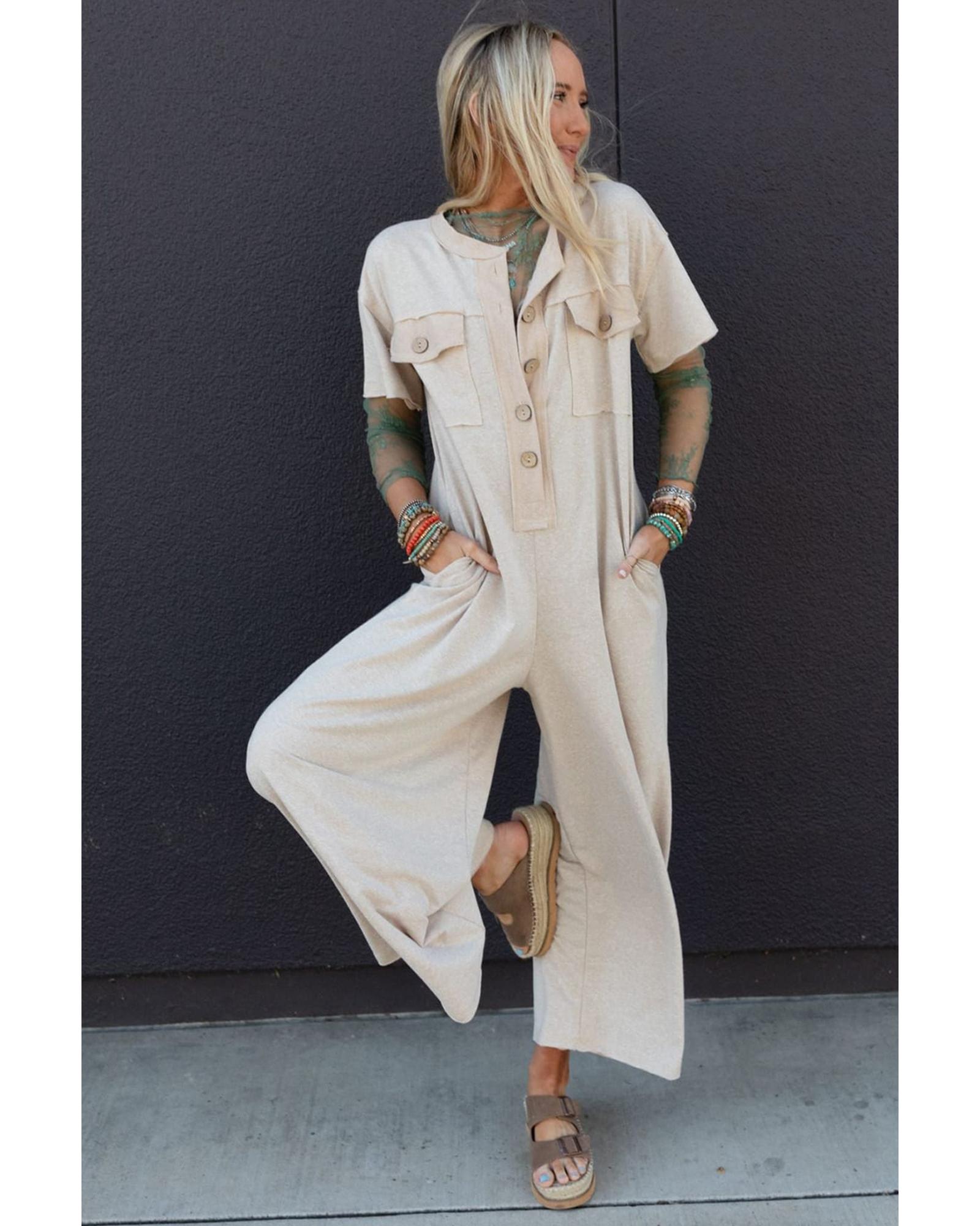 Beige Half Placket Chest Pockets Short Sleeve Wide Leg Jumpsuit – S
