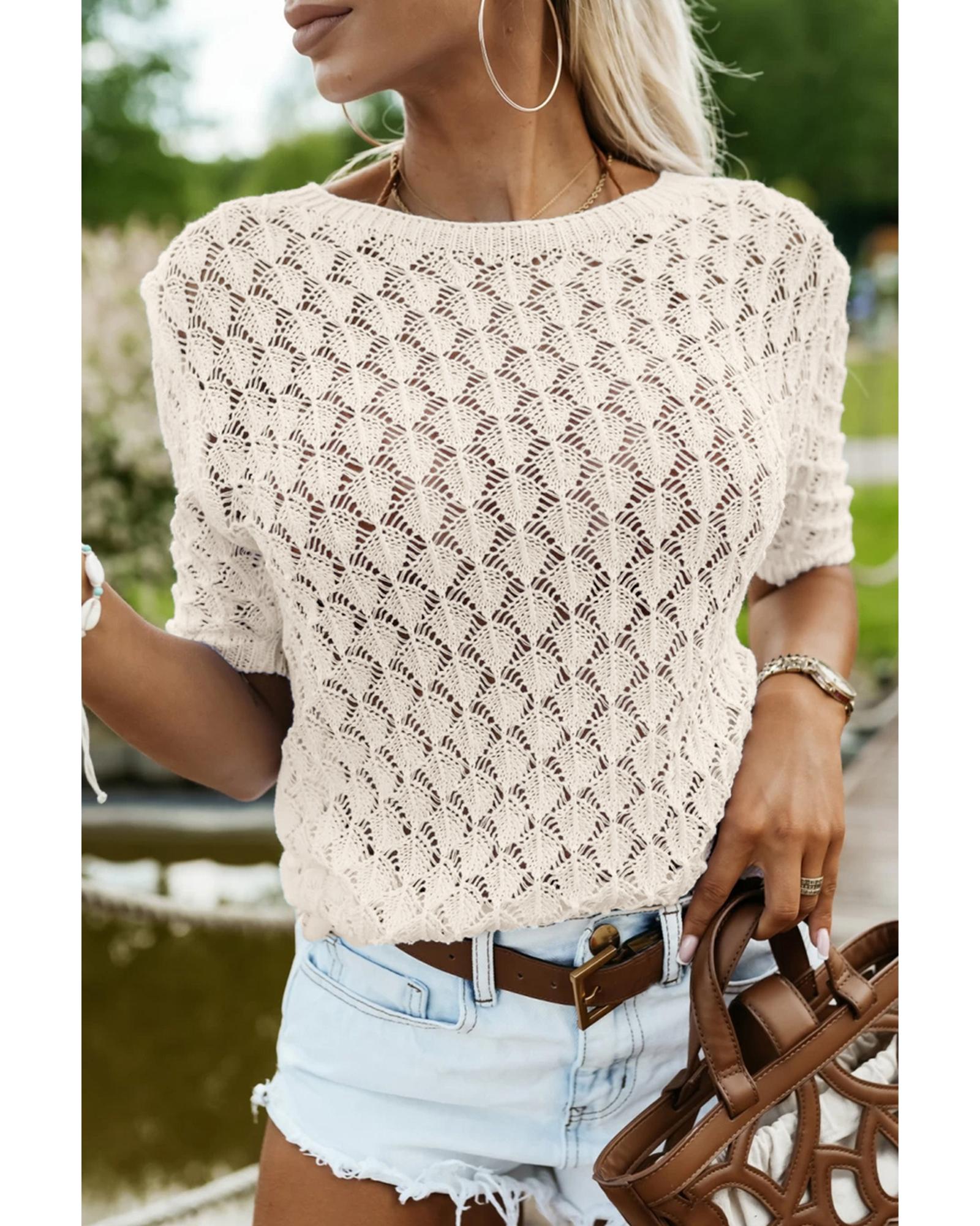 - Beige Hollow Out Crochet O Neck Short Sleeve Sweater Tee