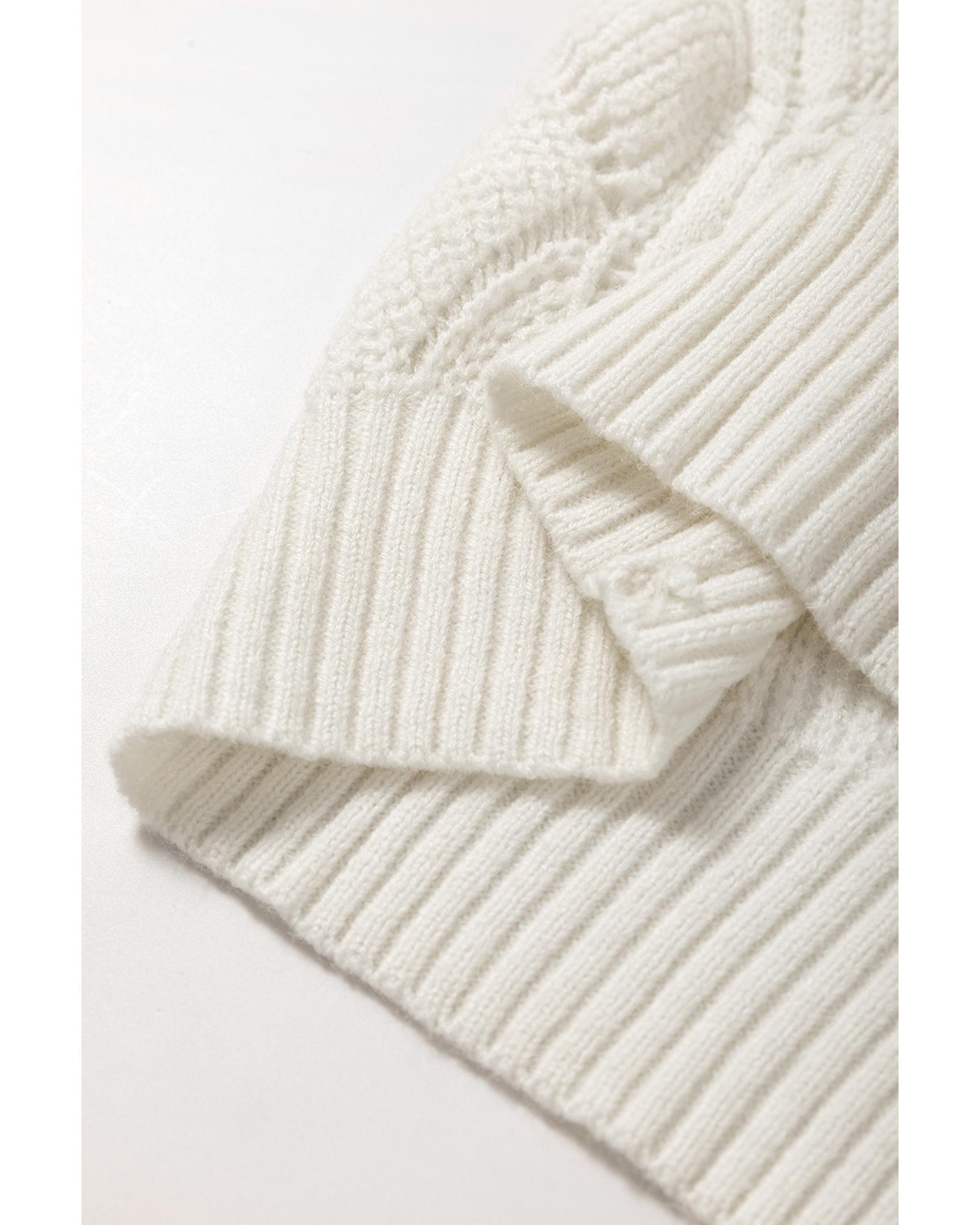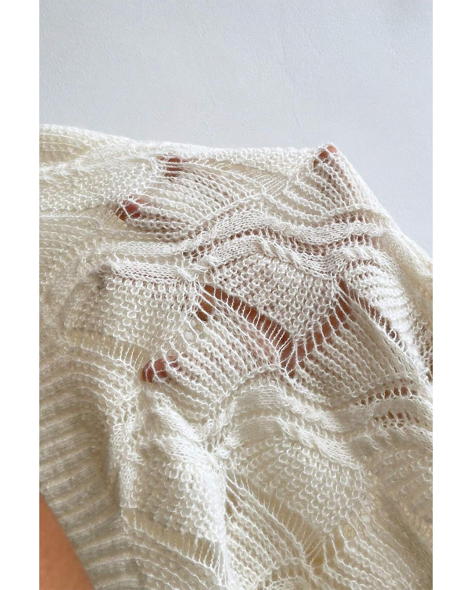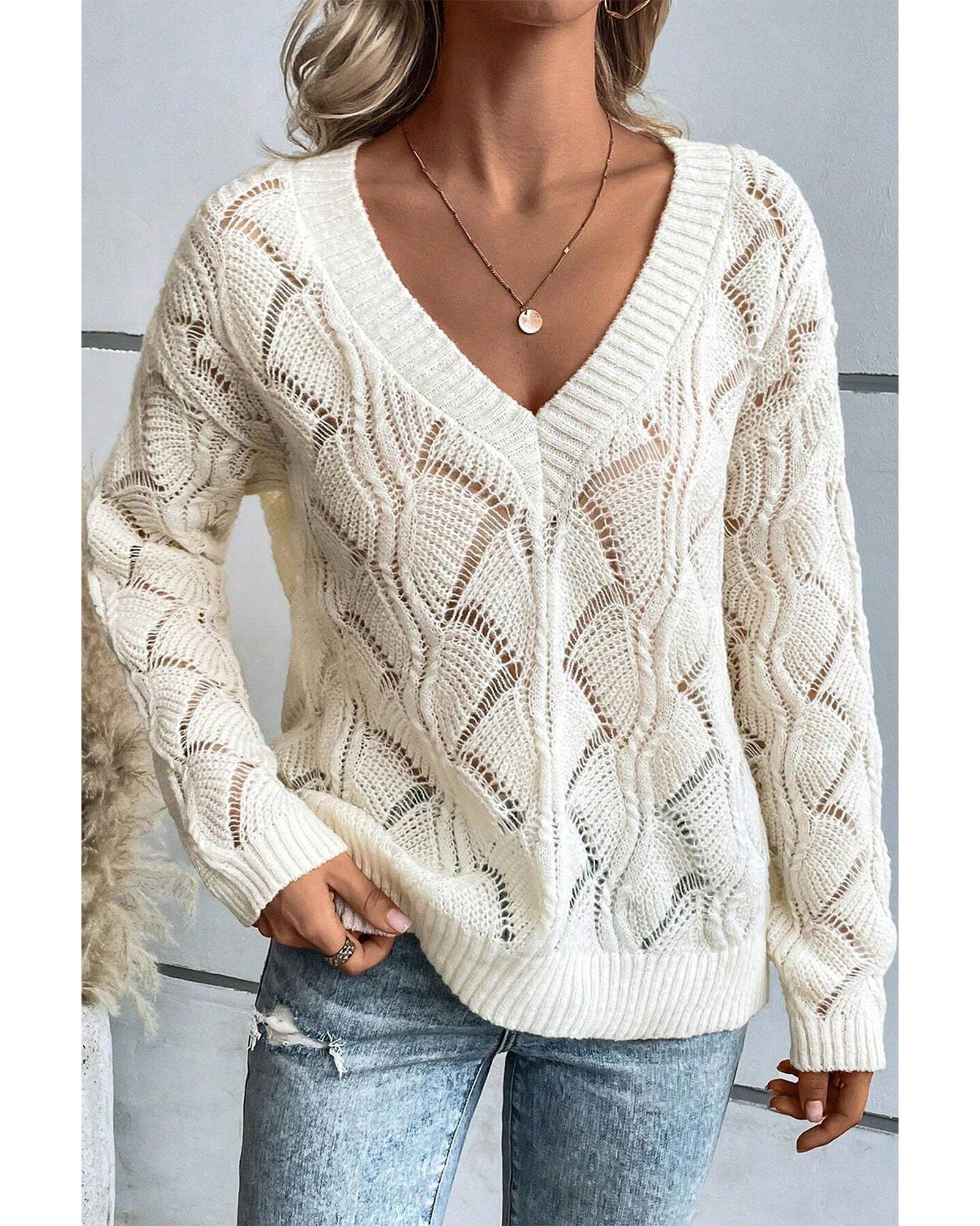 Beige Hollow Out Knit V Neck Drop Shoulder Sweater – M