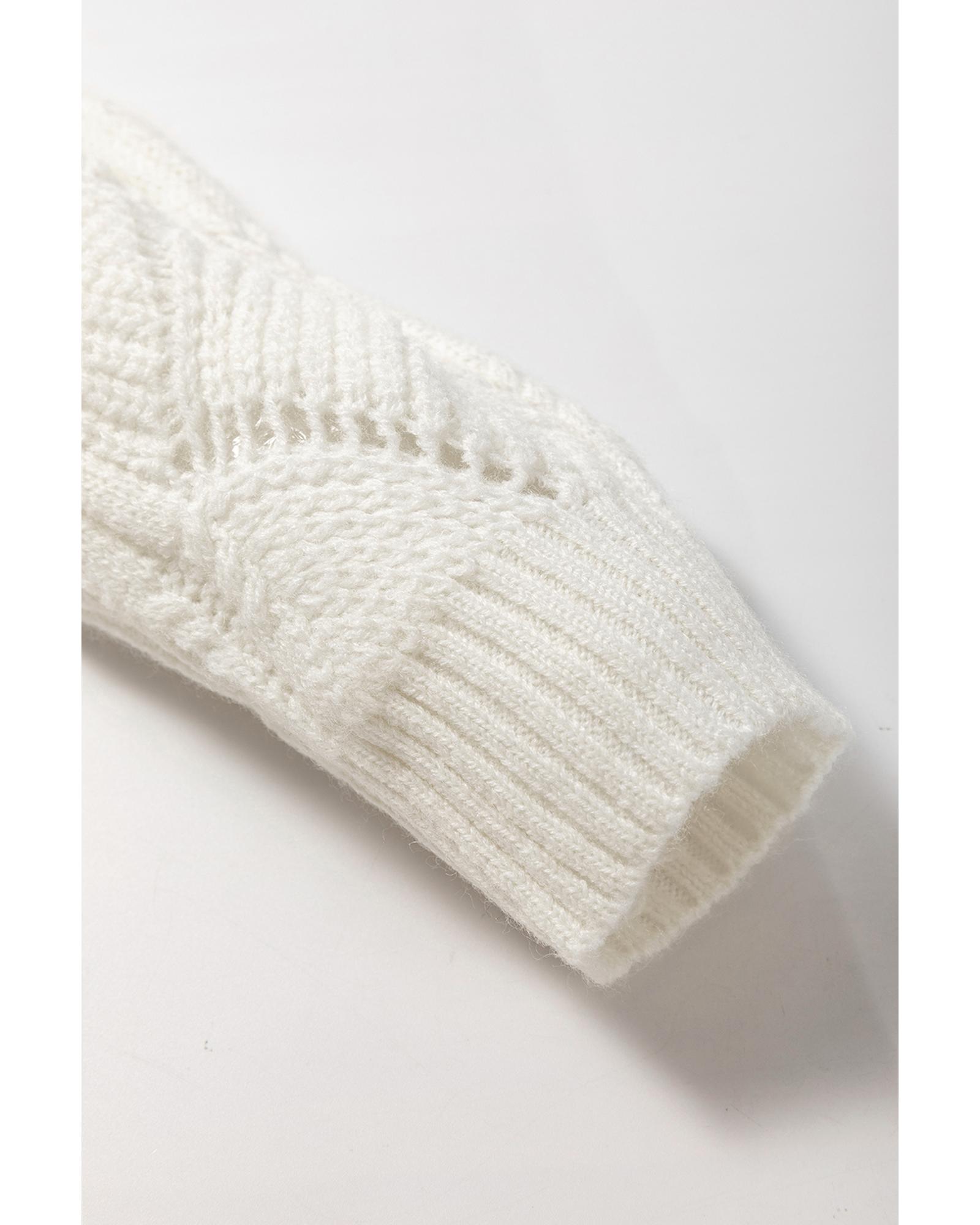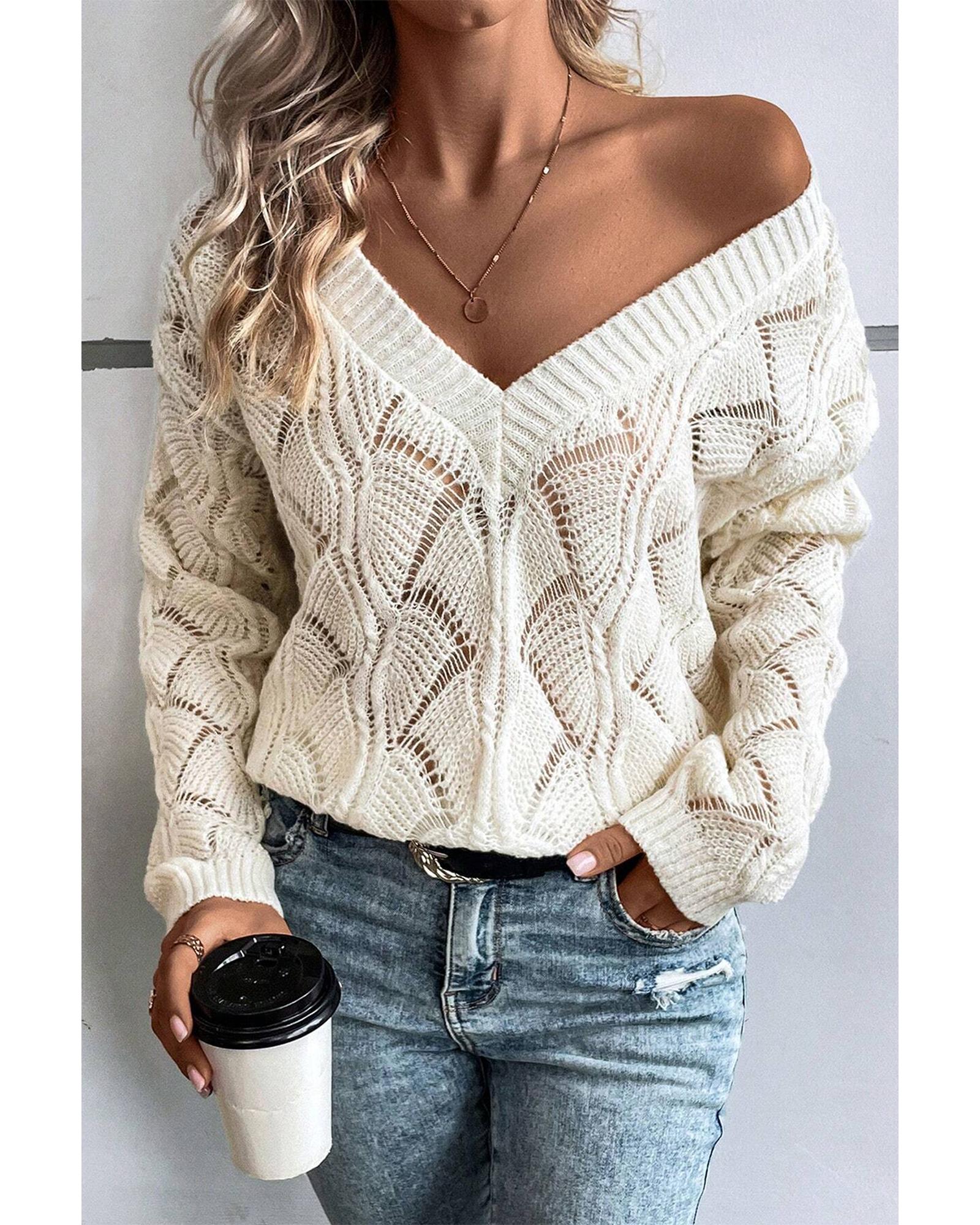 Beige Hollow Out Knit V Neck Drop Shoulder Sweater – XL