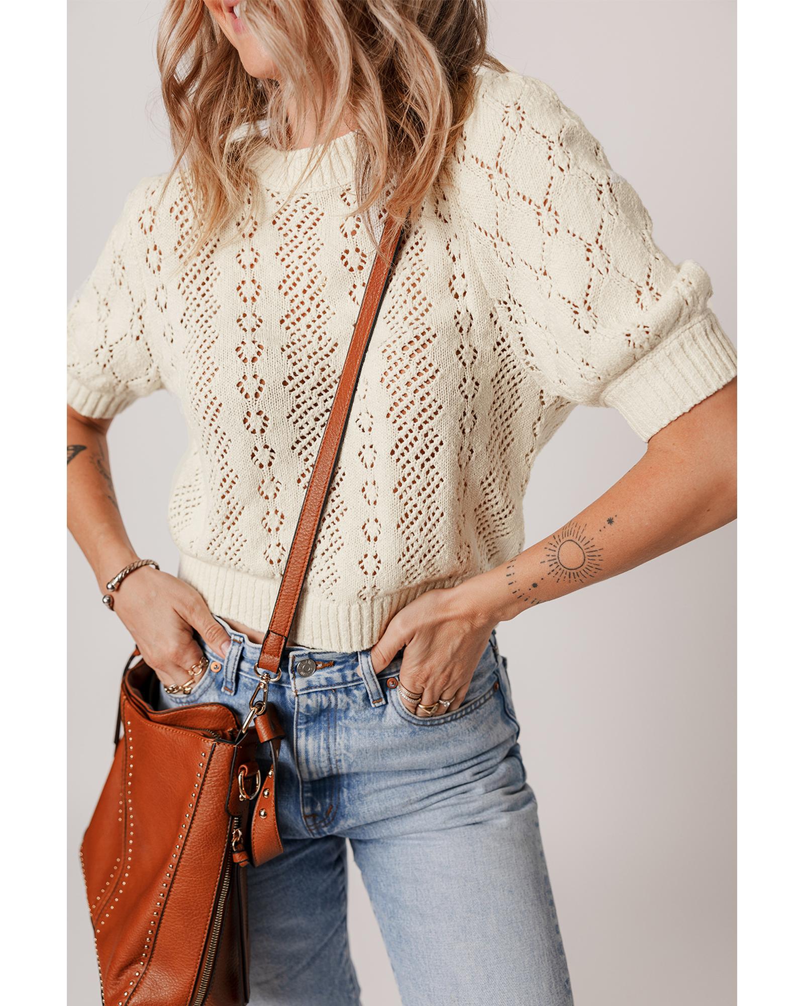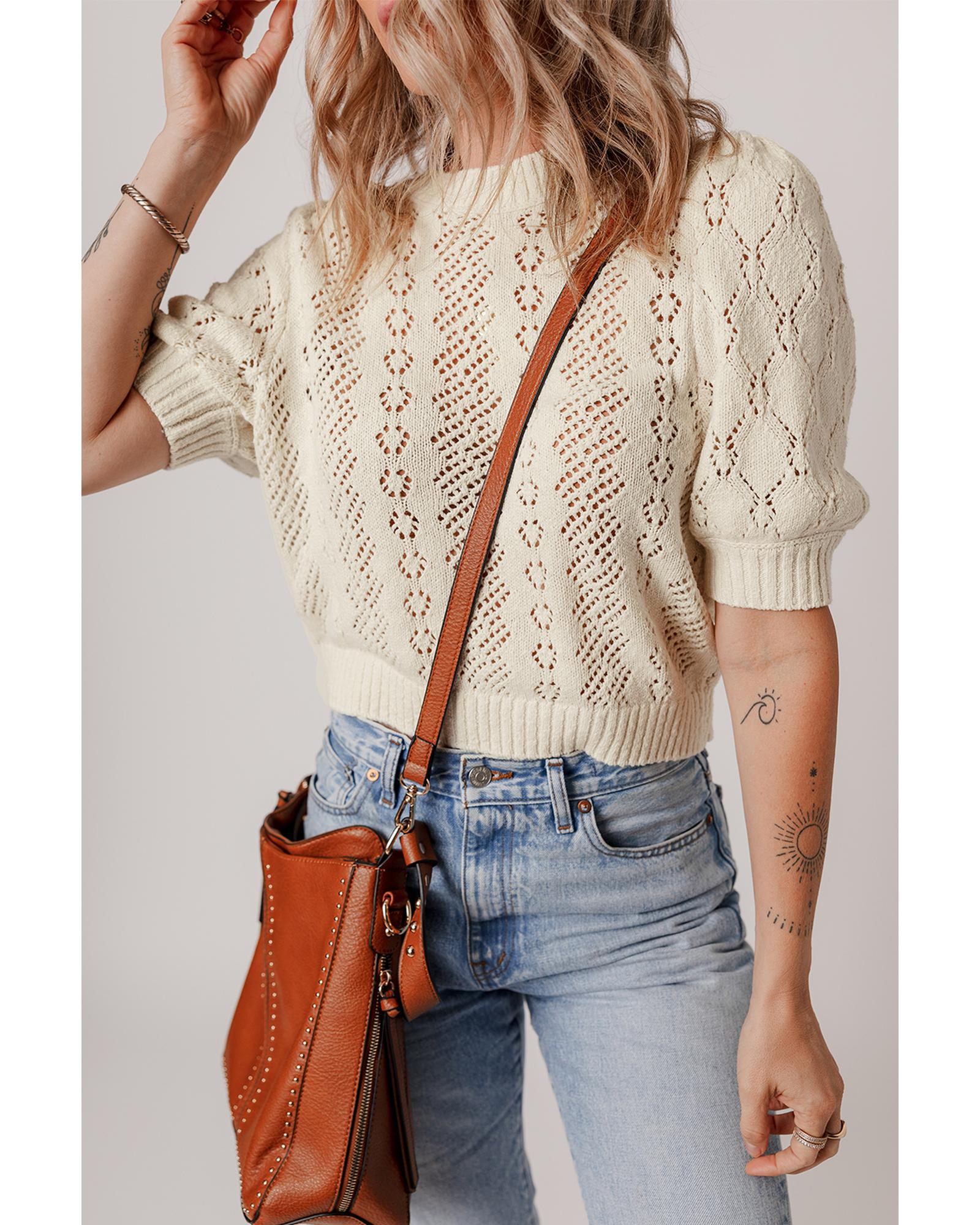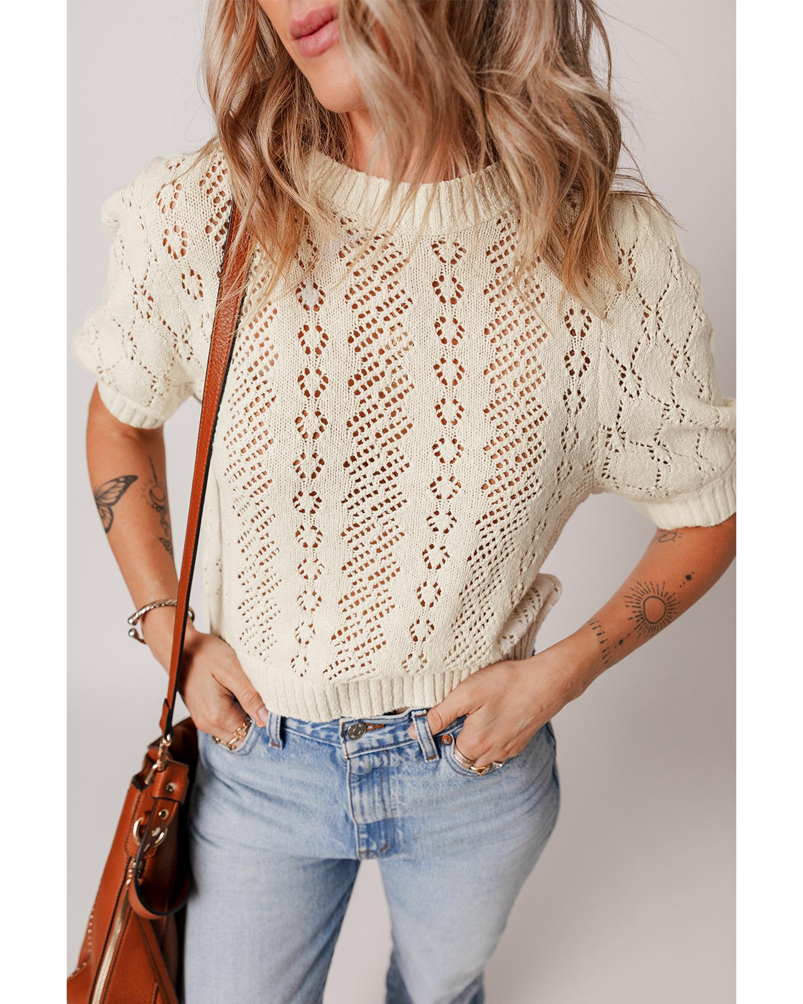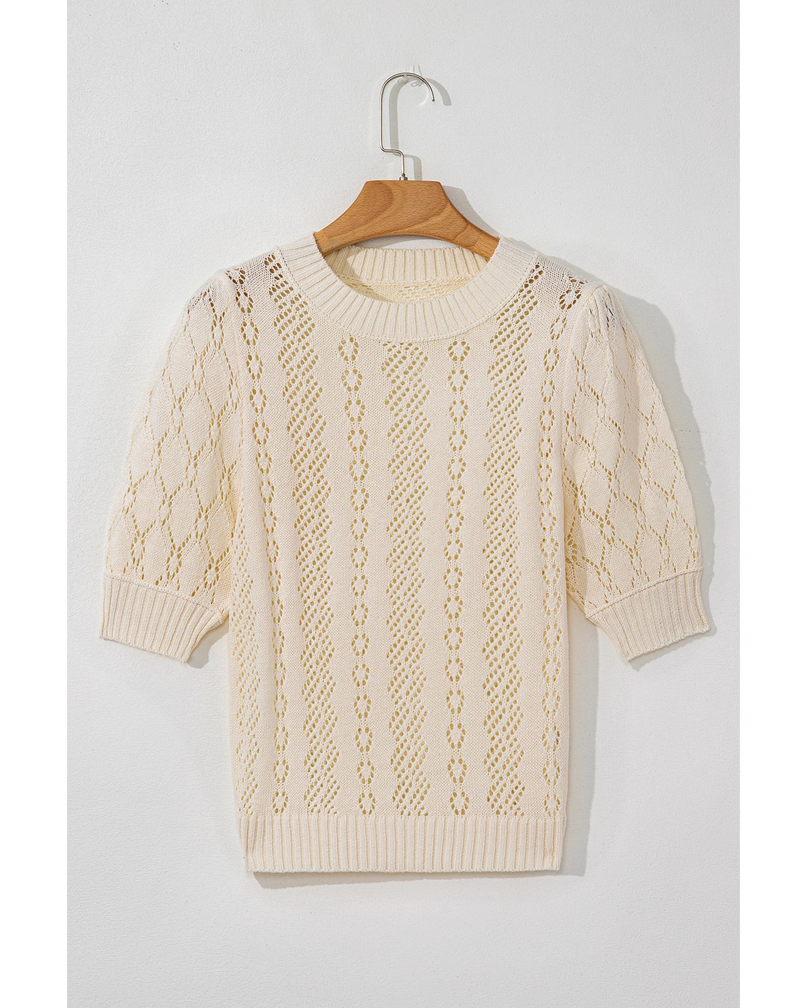 Beige Hollowed Pattern Knit Short Puff Sleeve Sweater – XL