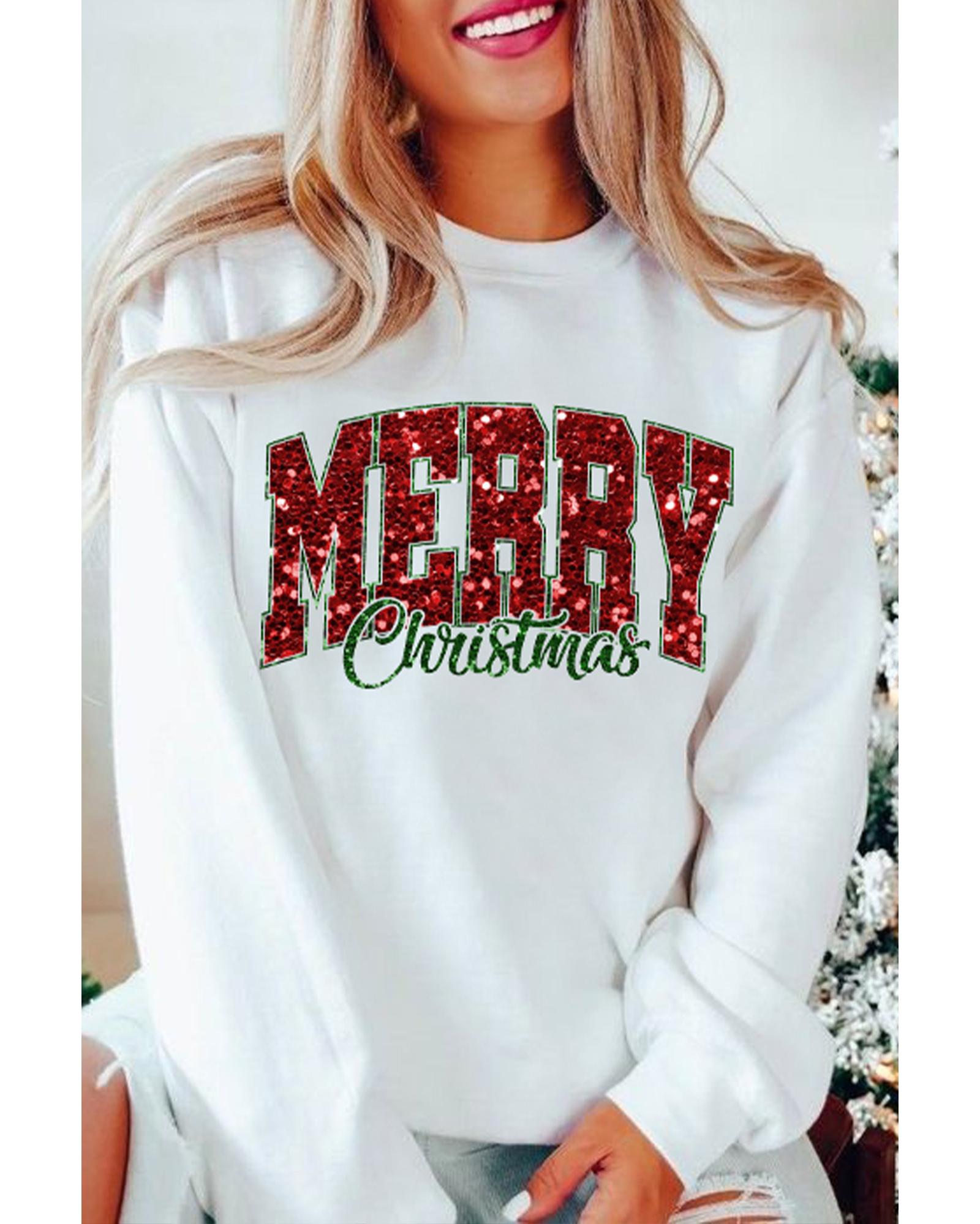 Beige MERRY Christmas Heat Transfer Printing Crewneck Pullover Sweatshirt – S