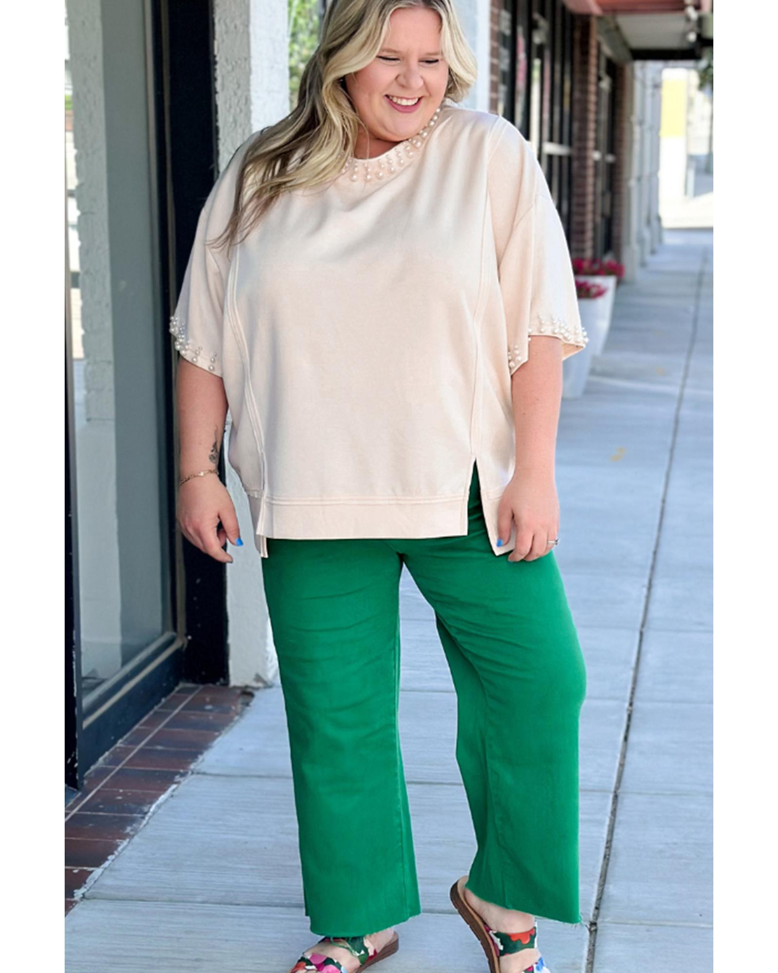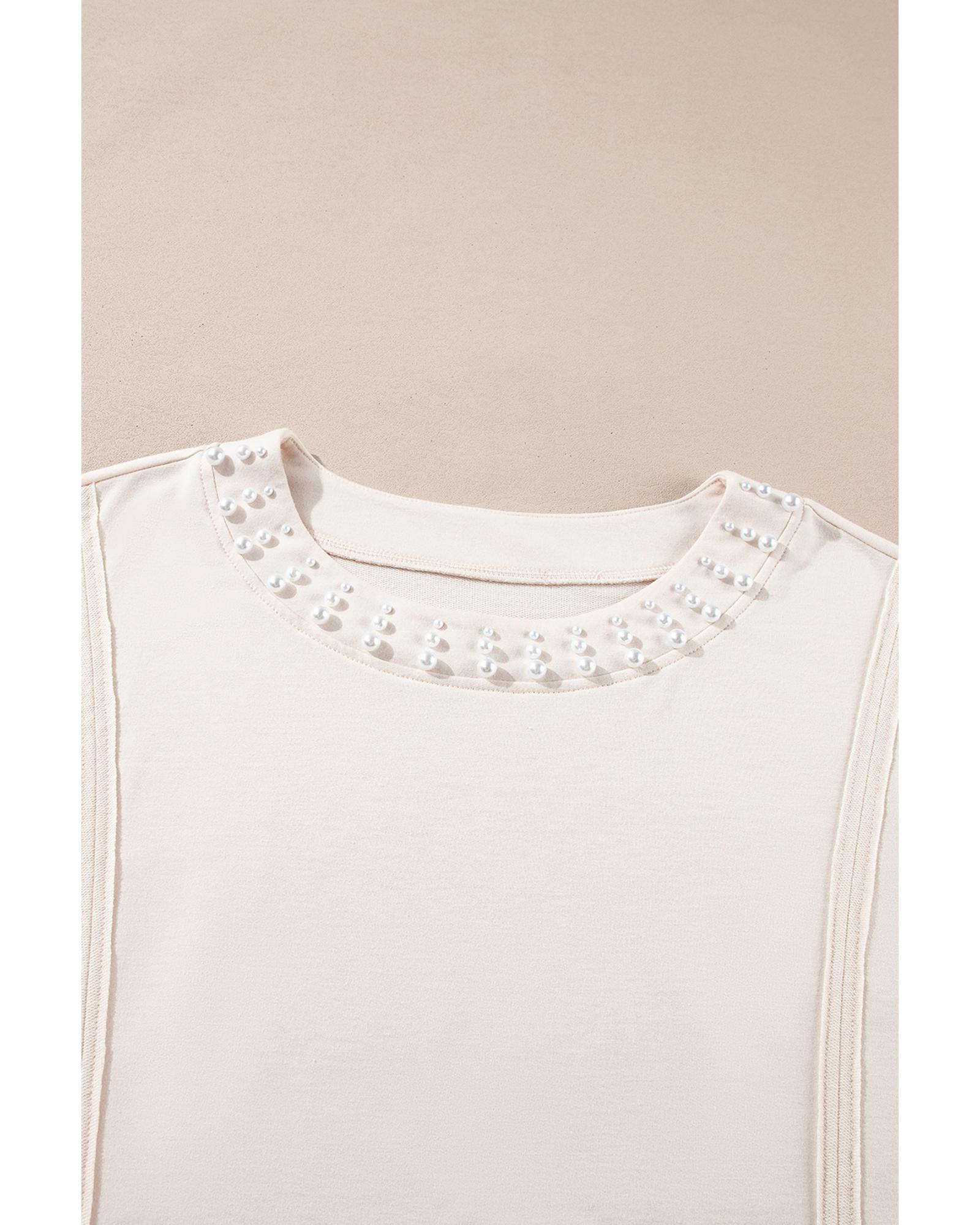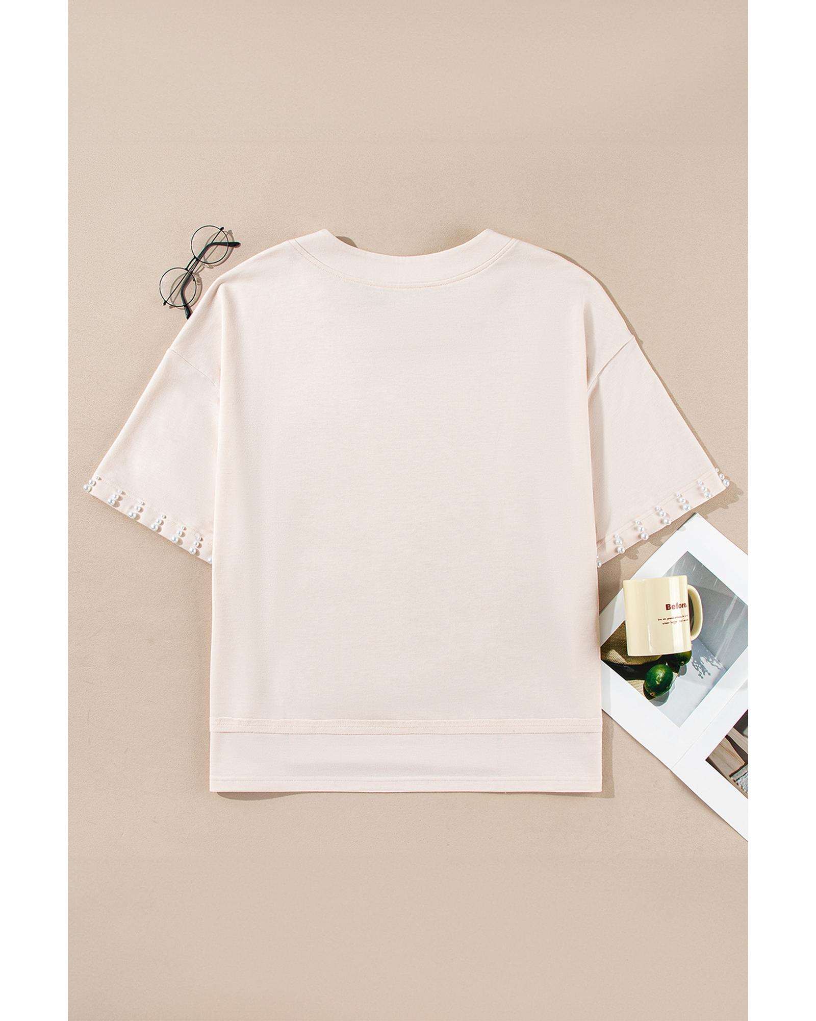 Beige Pearl Decor Crew Neck Half Sleeve Plus Size T Shirt – 3X