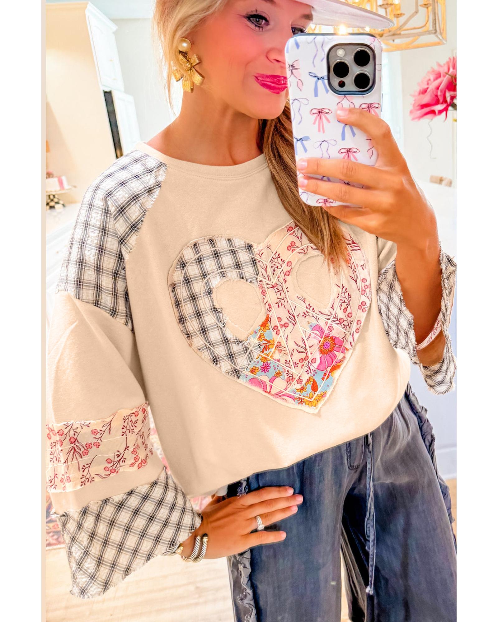 Beige Plaid Floral Peace Heart Graphic Wide Long Sleeve Top – 2XL