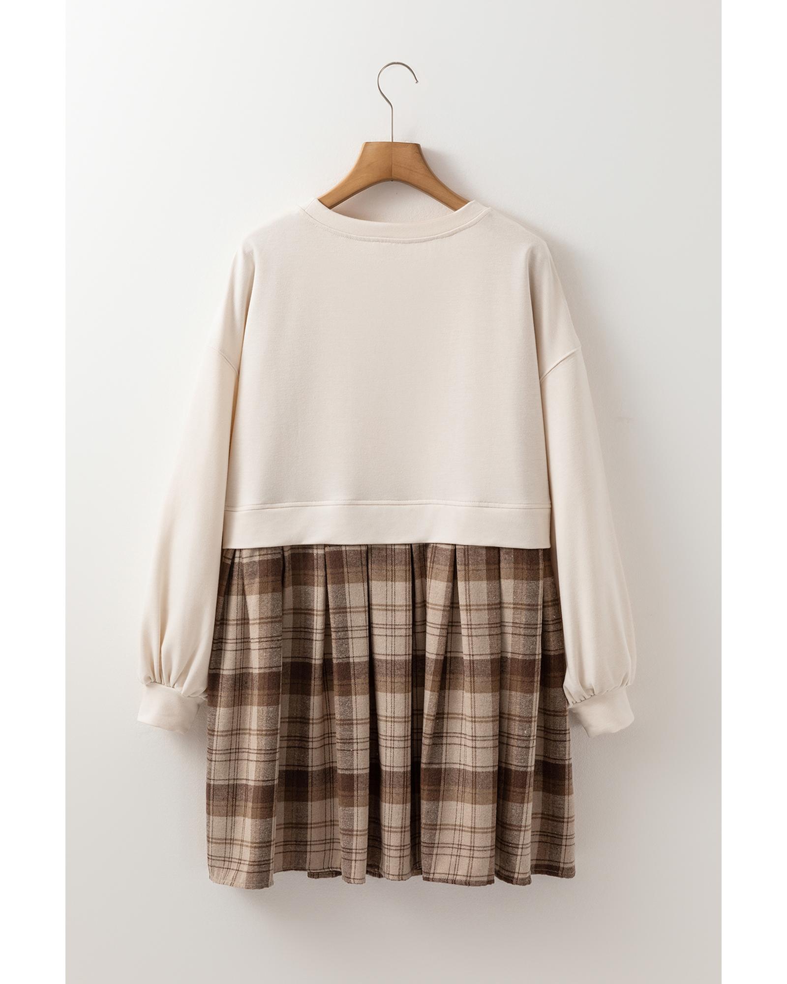 - Beige Plaid Patchwork High Waist Sweatshirt Mini Dress