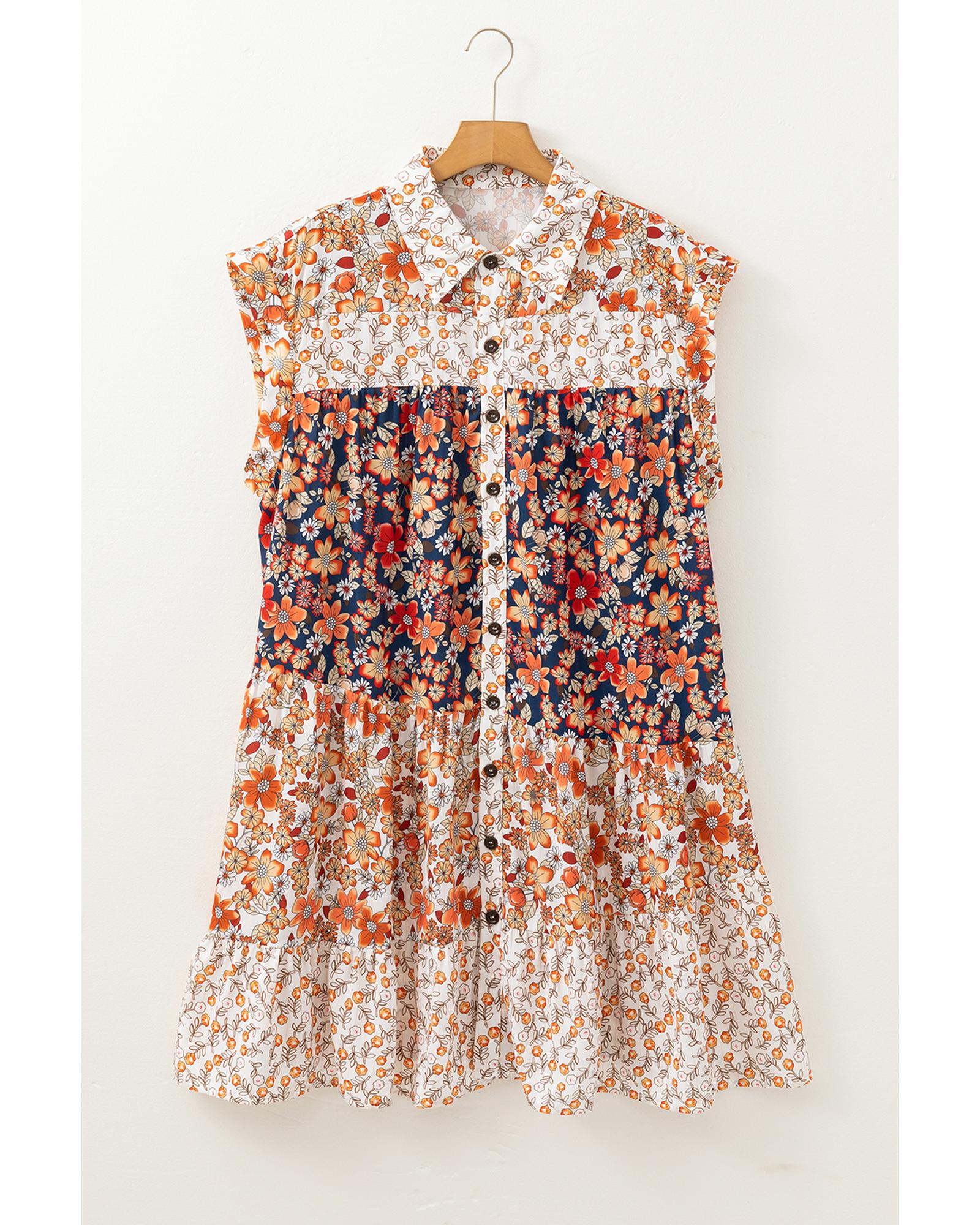 Beige Plus Size Floral Patchwork Button Front Collared Mini Dress – 1X
