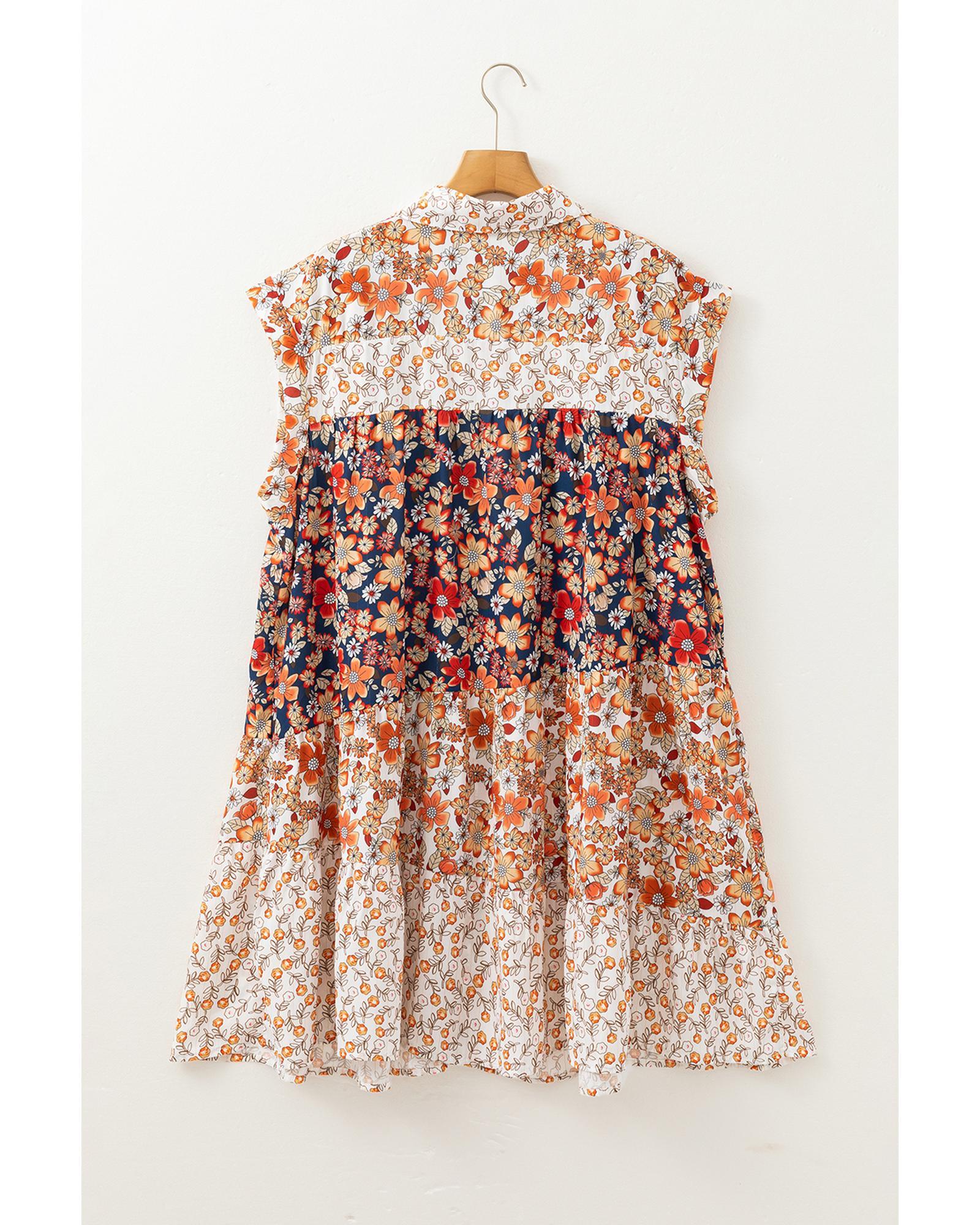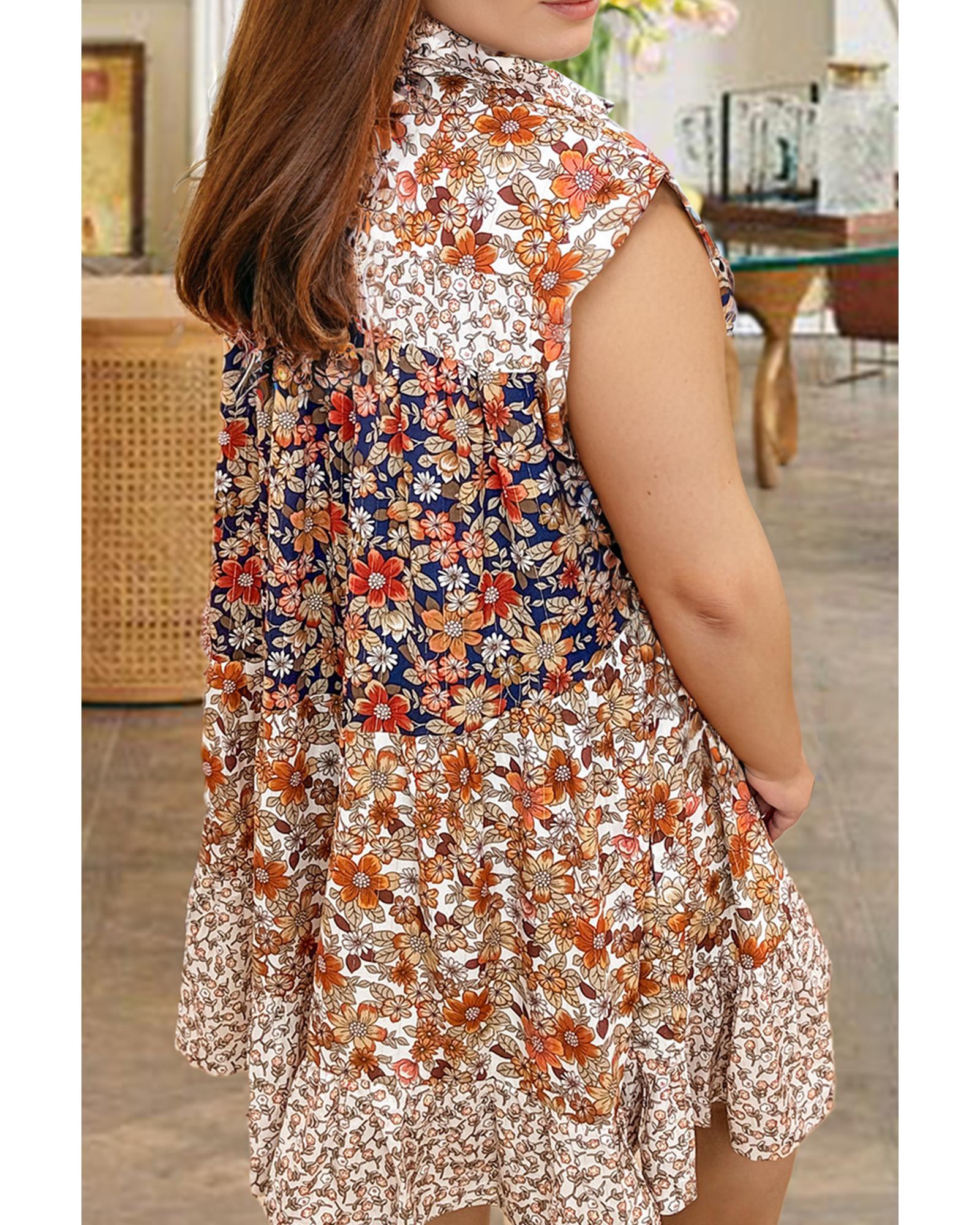 Beige Plus Size Floral Patchwork Button Front Collared Mini Dress – 2X