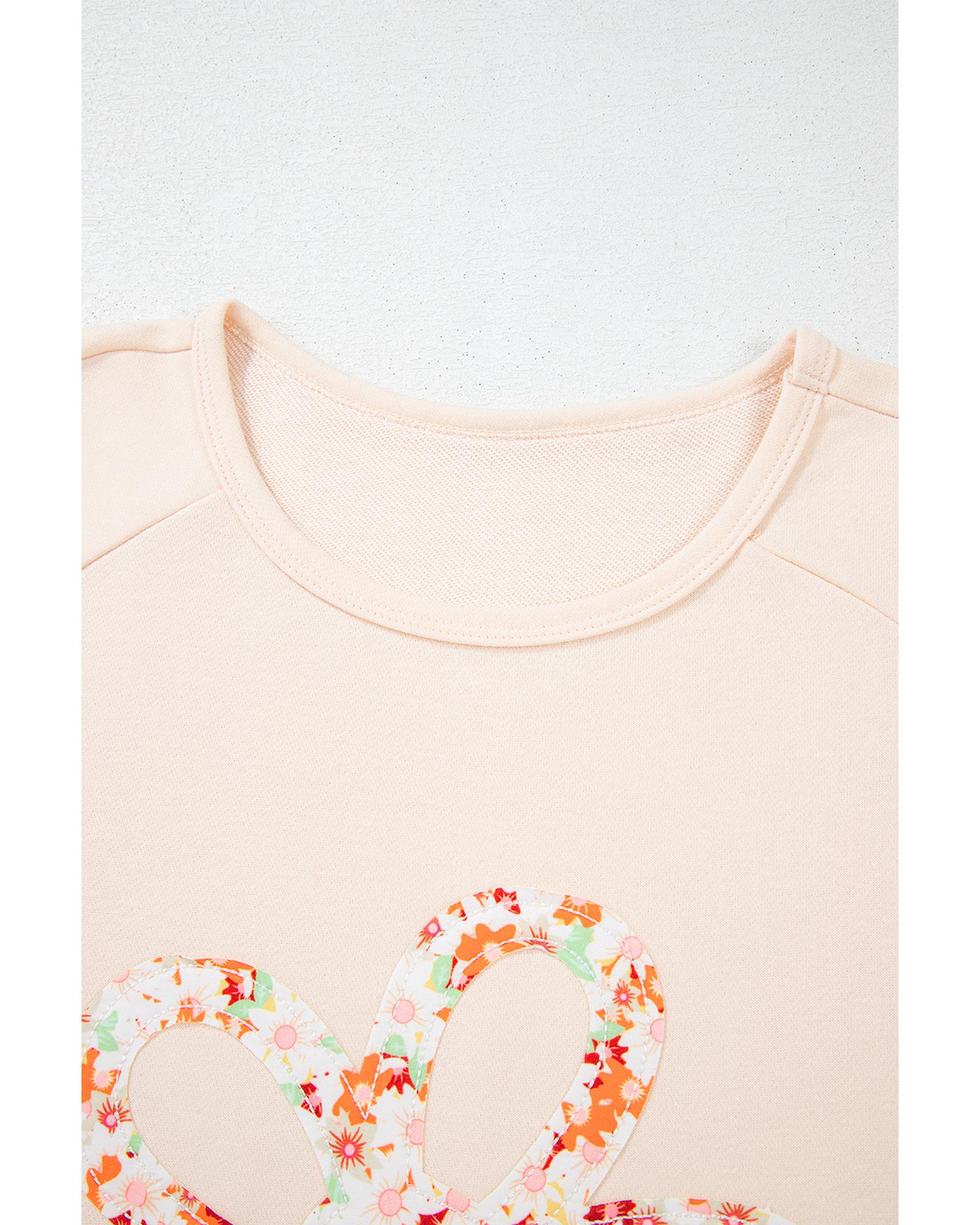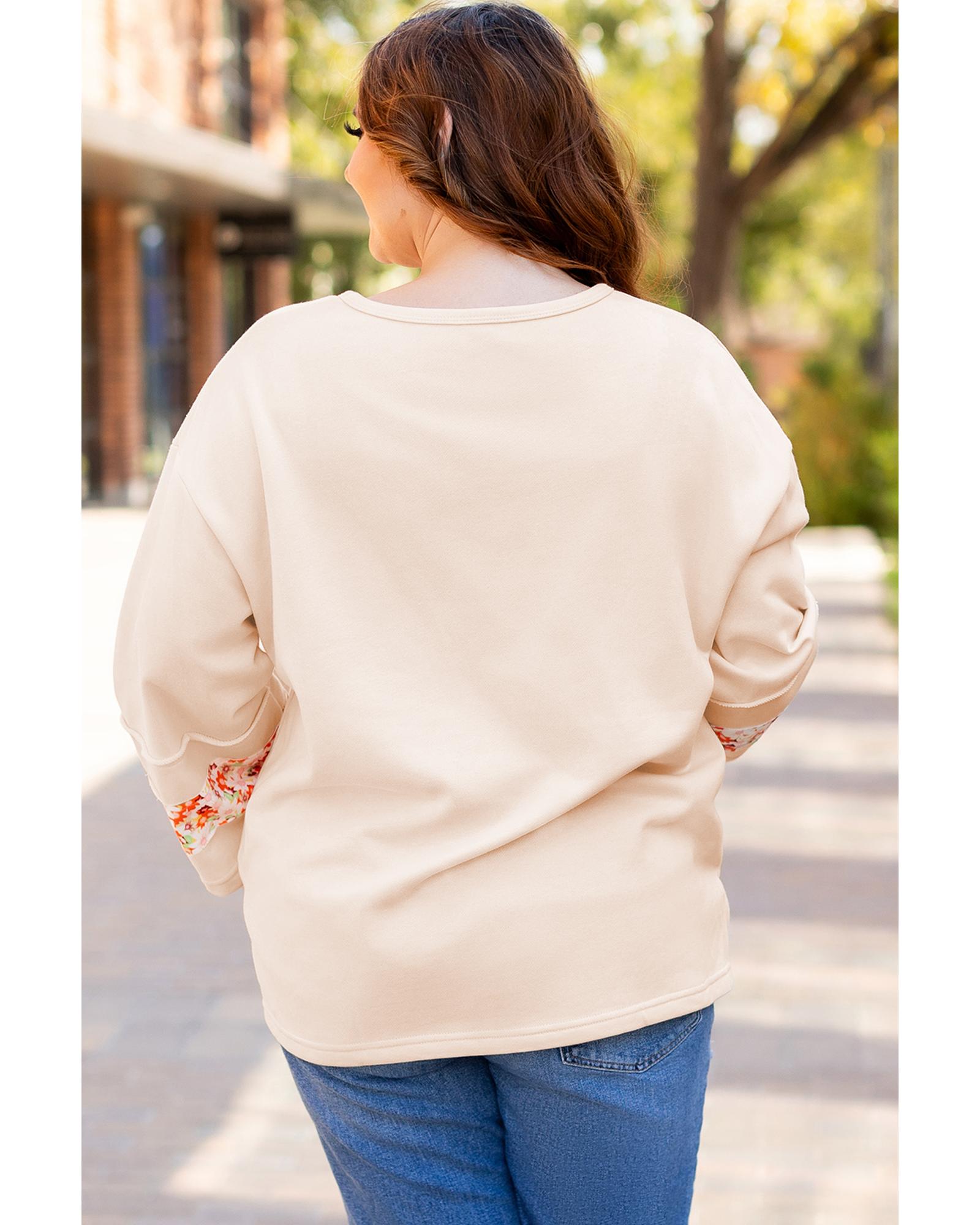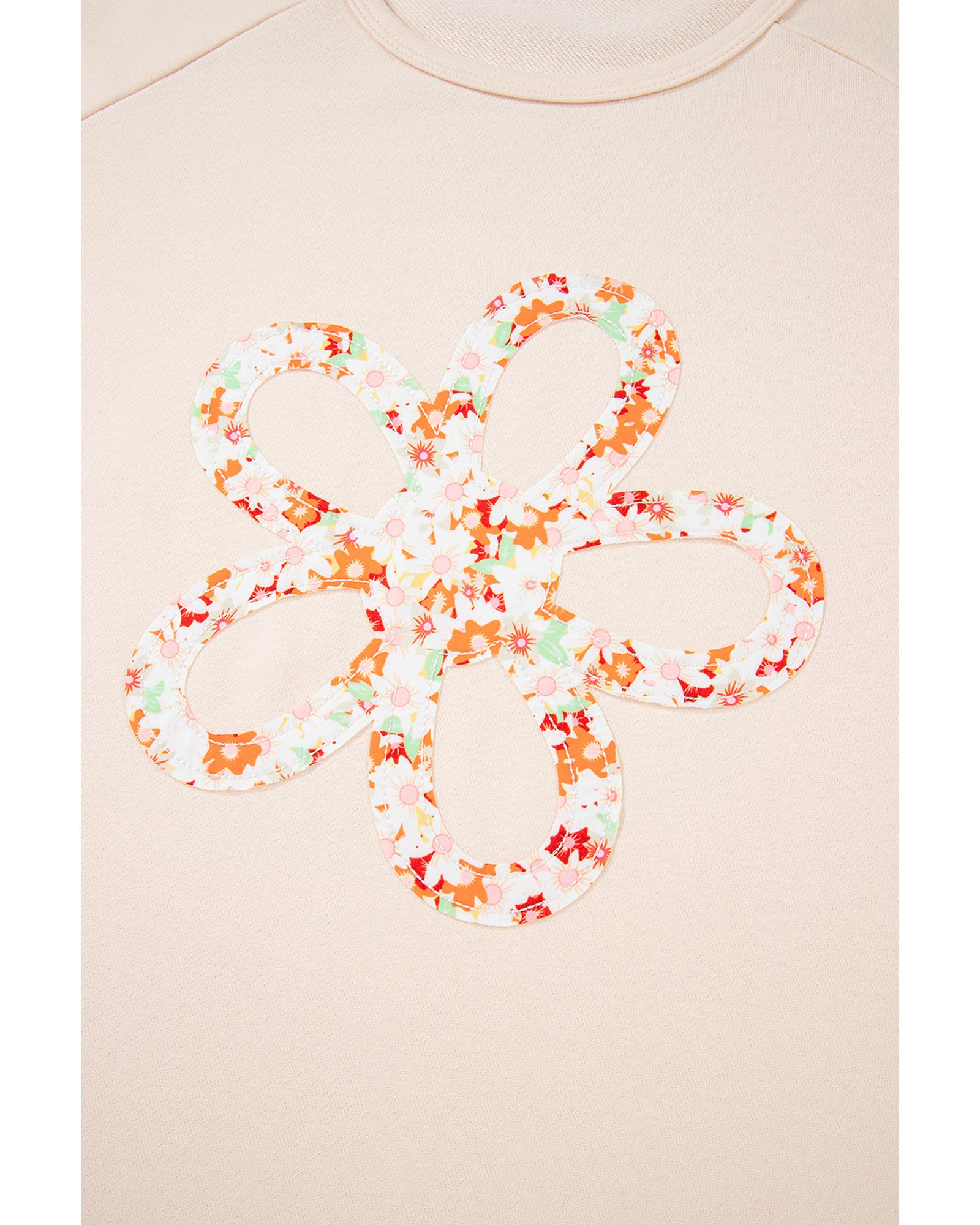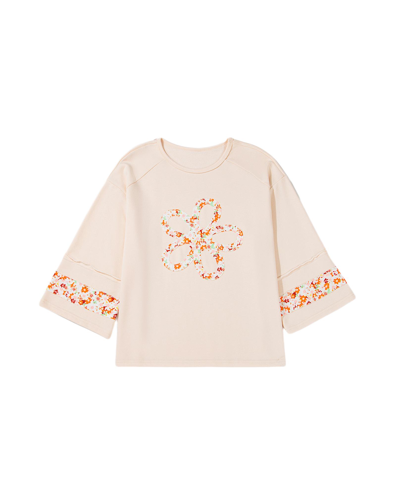 Beige Plus Size Flower Patched Side Slits Crewneck Top – 4X