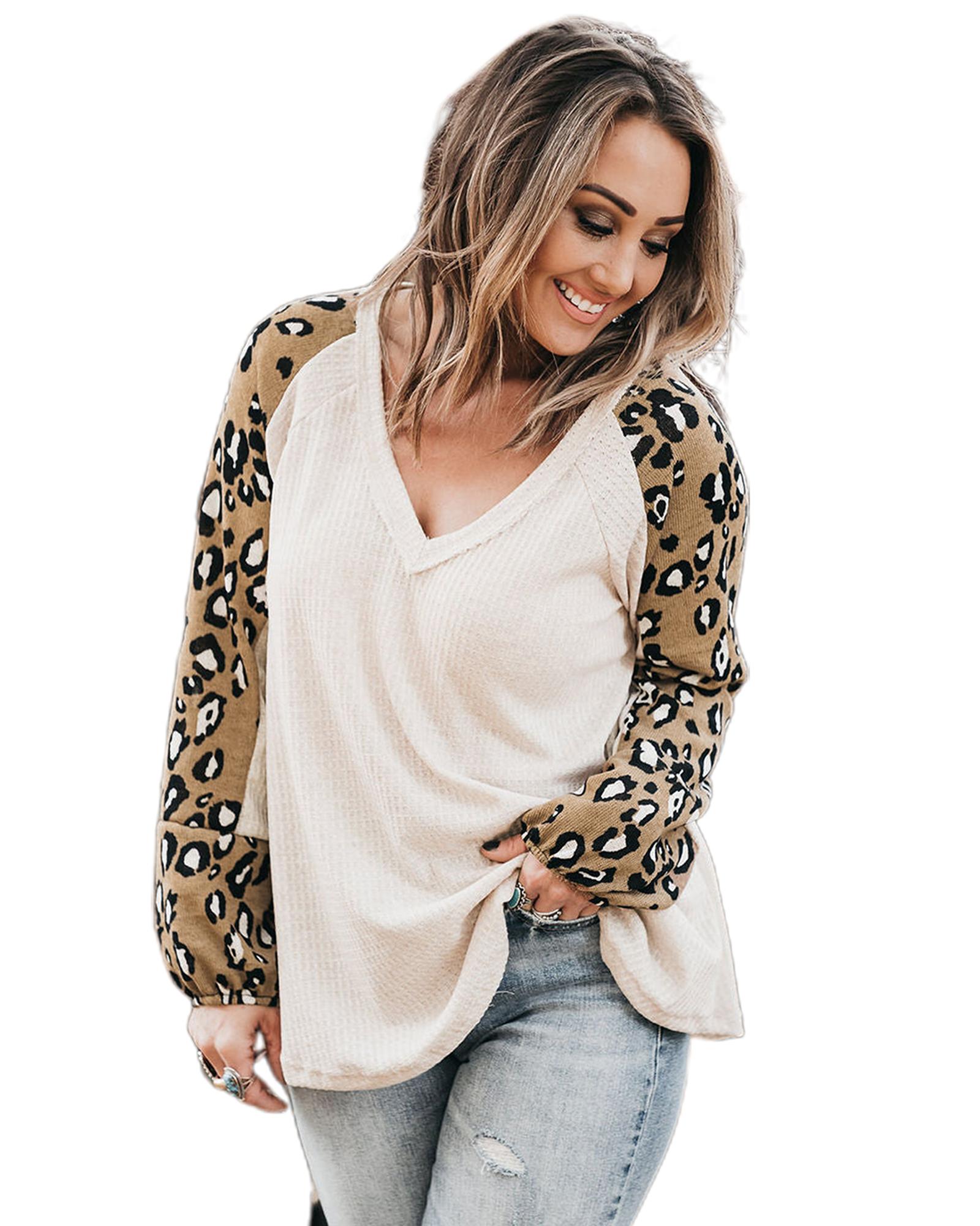 Beige Printed Plus Size Waffle Knit Contrast Leopard Long Sleeve Top – 1X