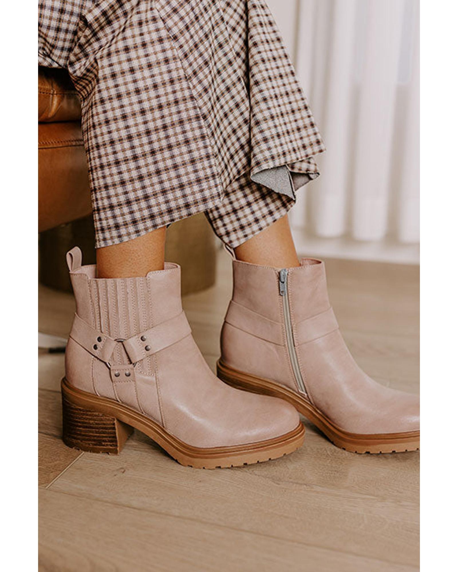 Beige Ring Linked Zipper Chunky Heel Ankle Boots - 40 EU