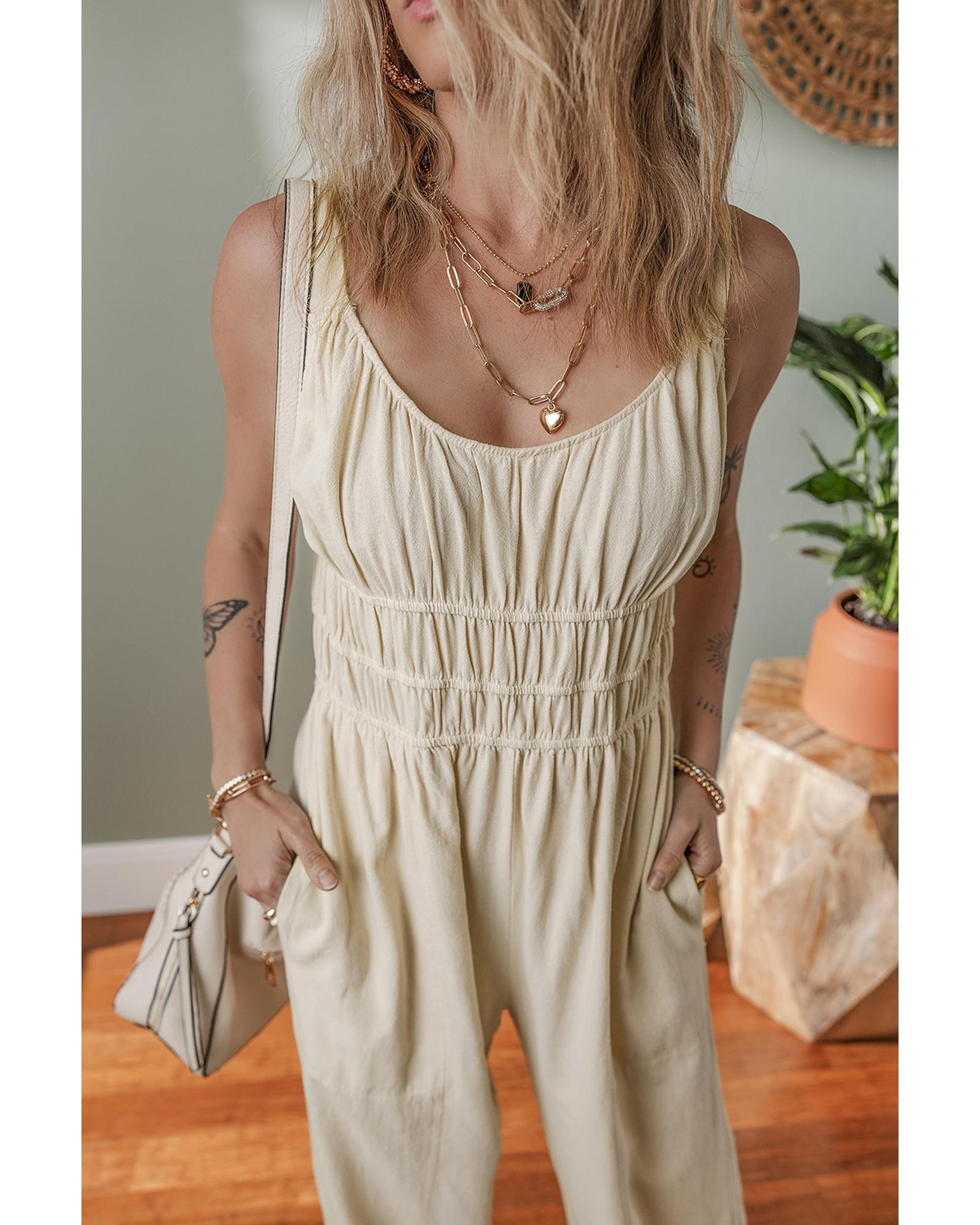 - Beige ruched high waist sleeveless wide leg jumpsuit