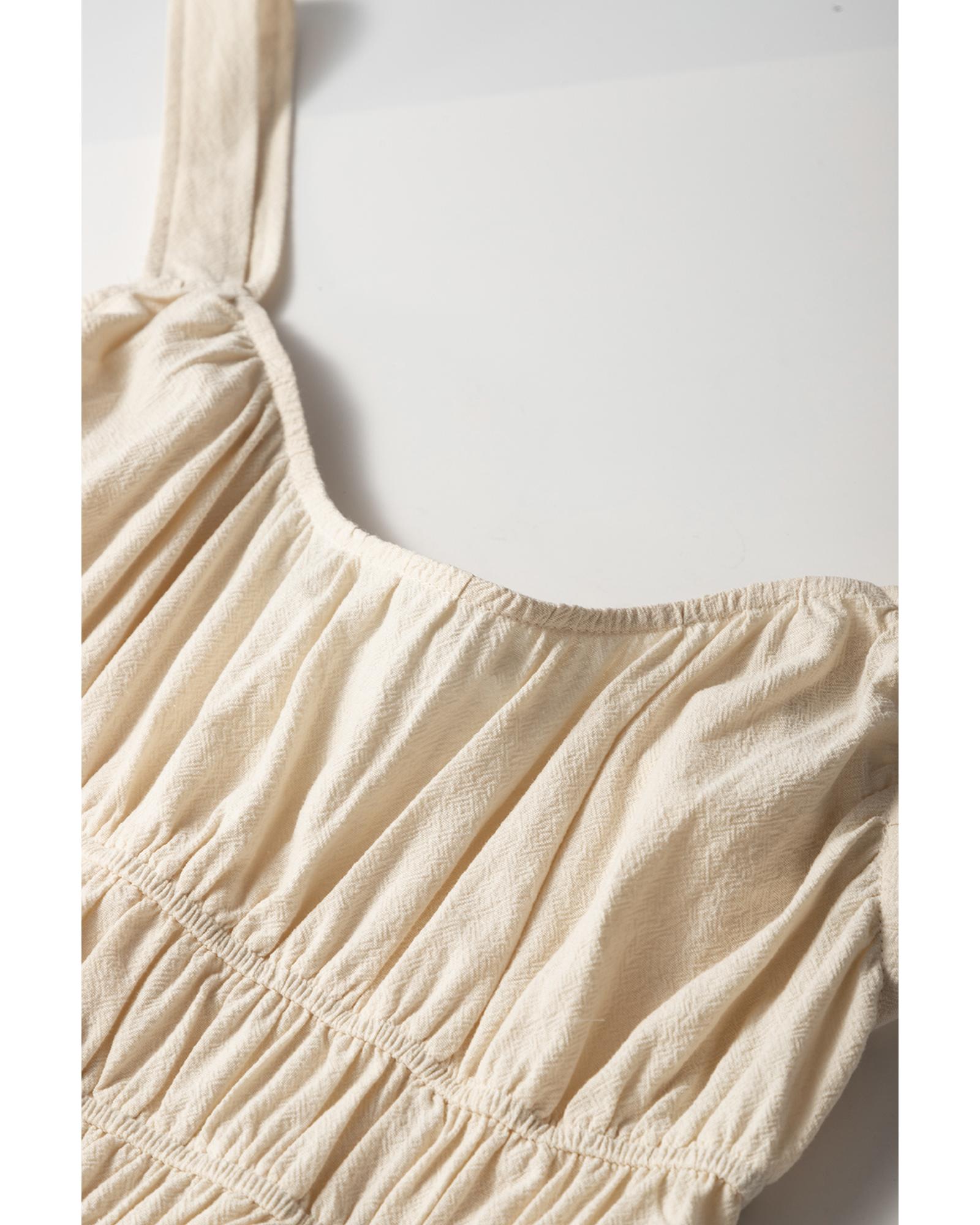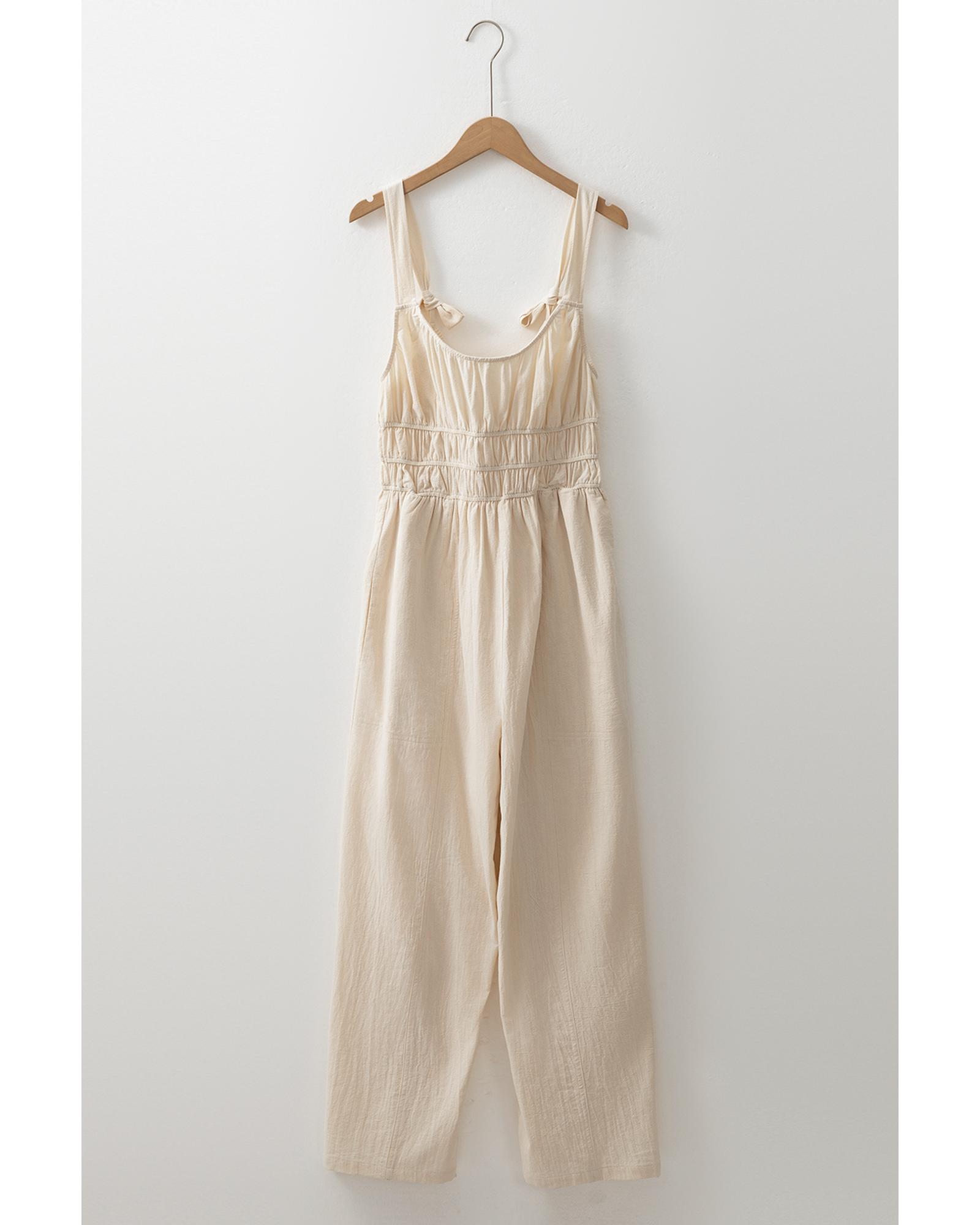 - Beige ruched high waist sleeveless wide leg jumpsuit