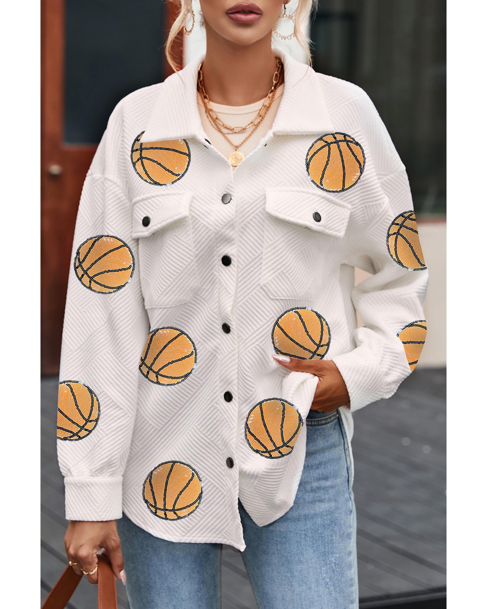 Beige Sequin Basketball Graphic Textured Snap Button Shacket – XL