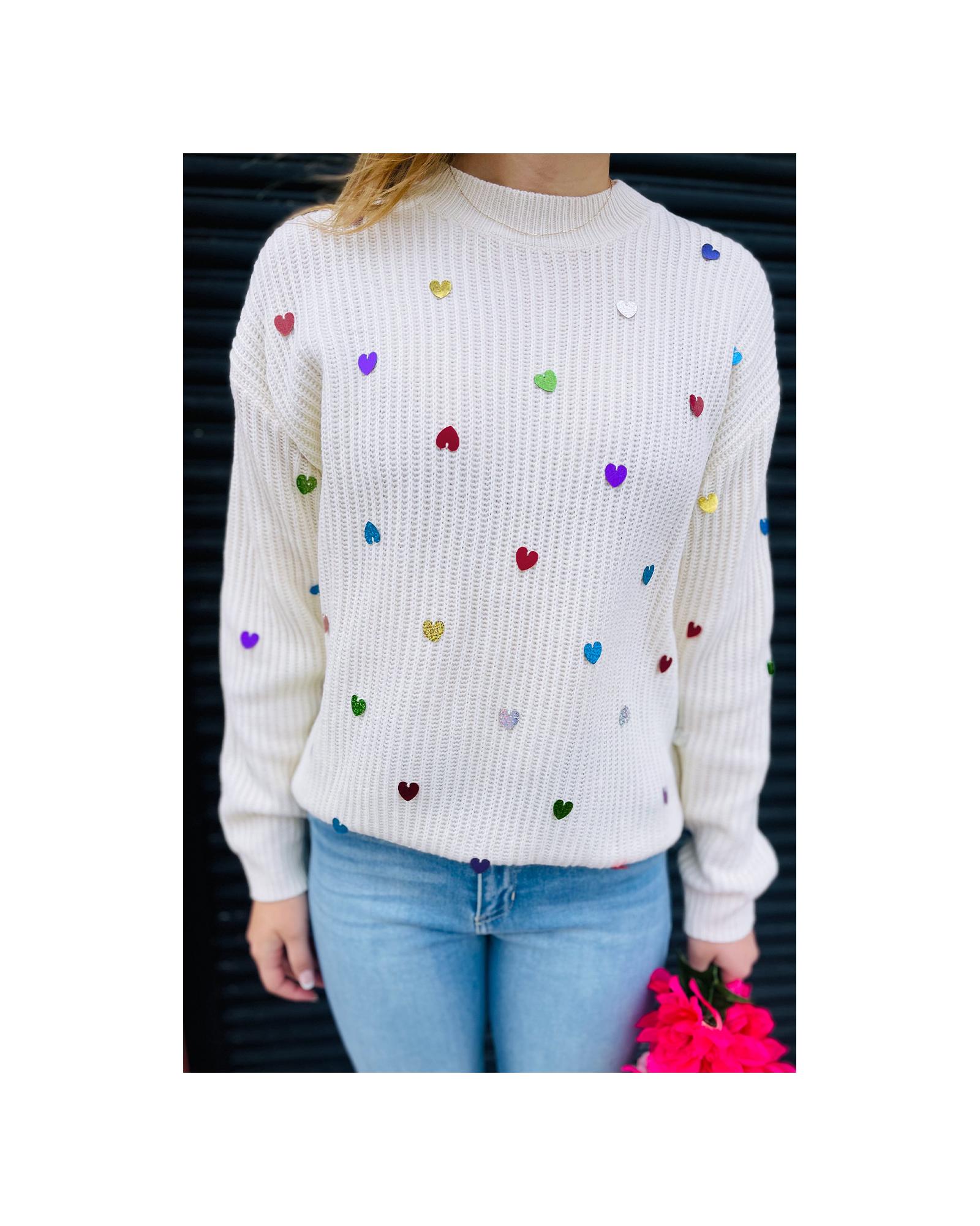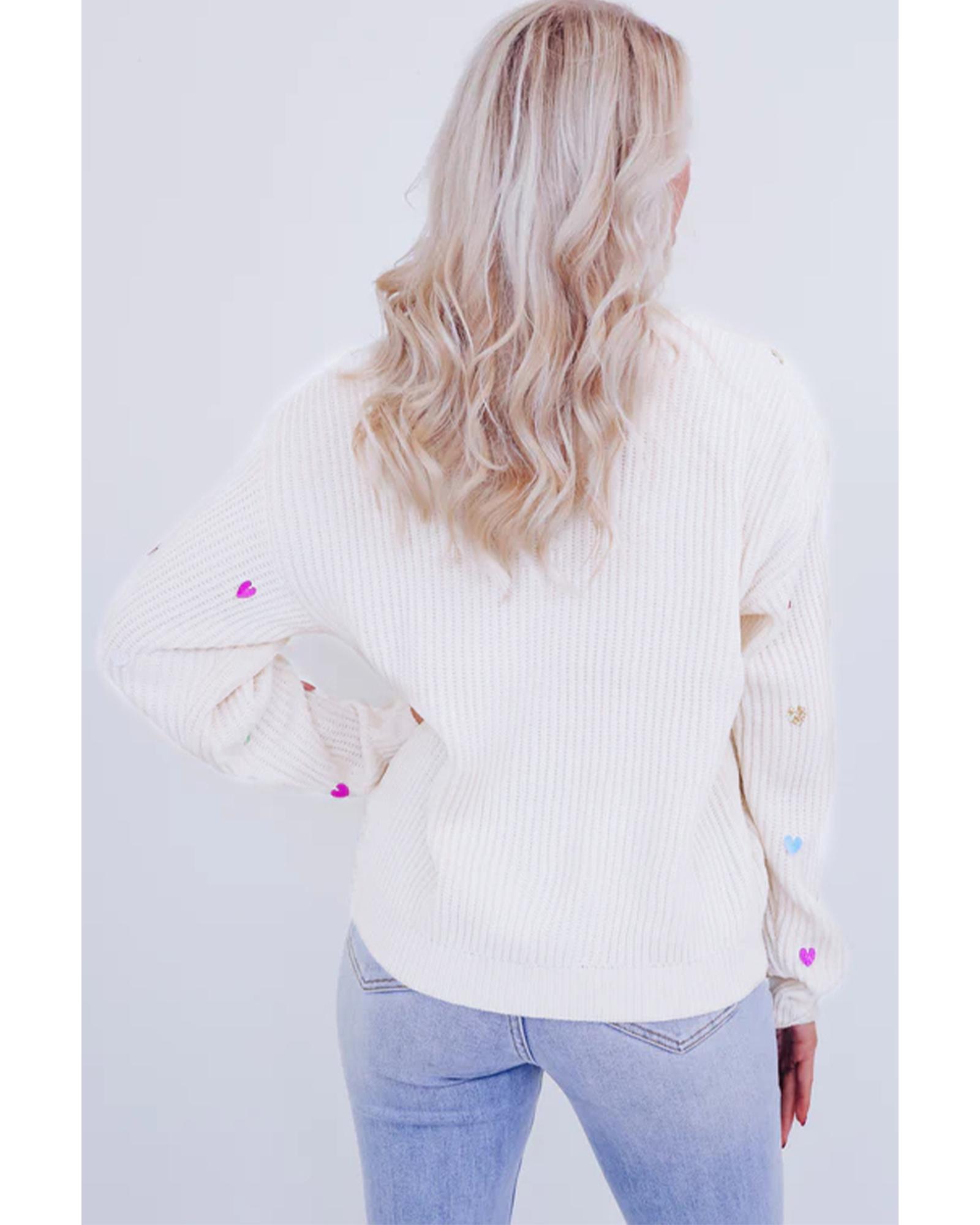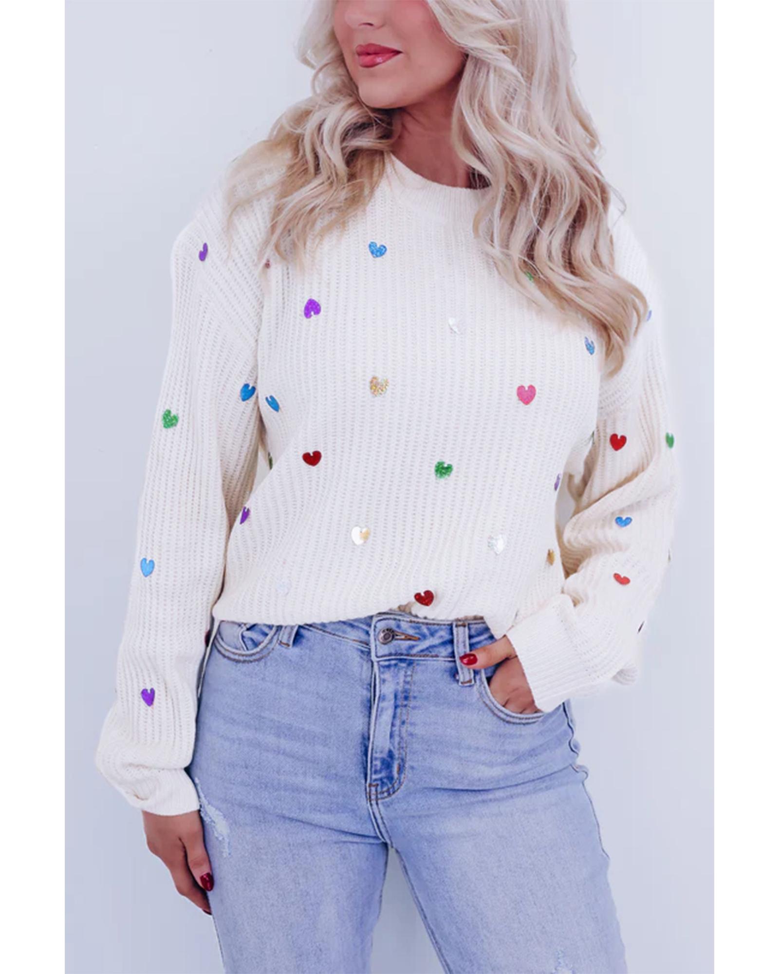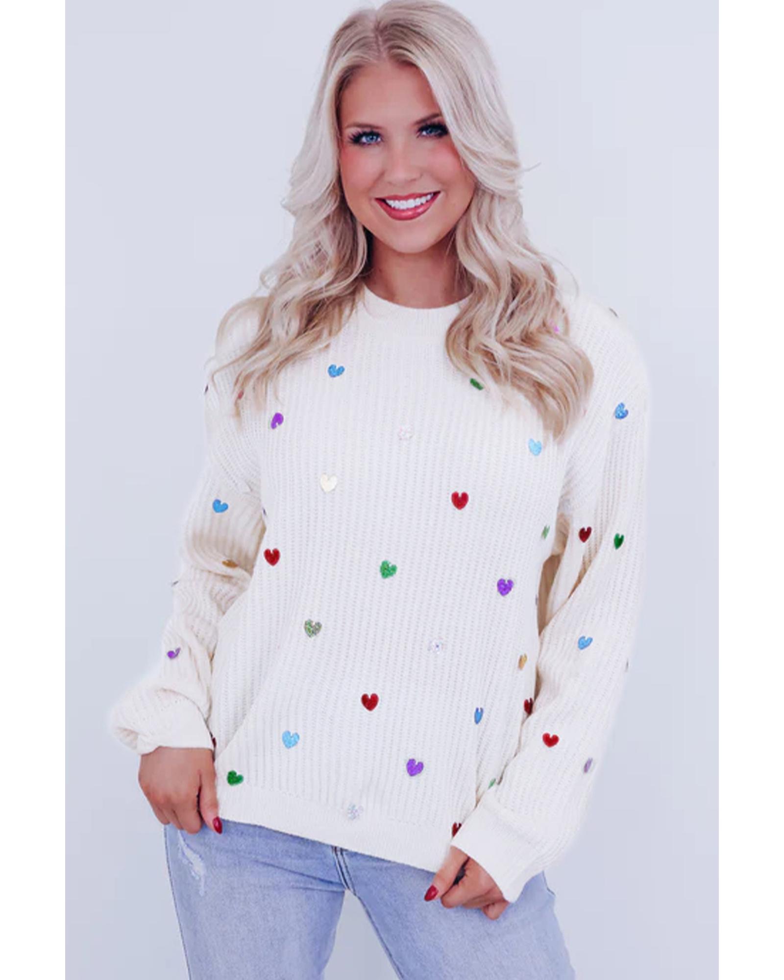 Beige Sequin Heart Shape Waffle Knit Round Neck Sweater – S