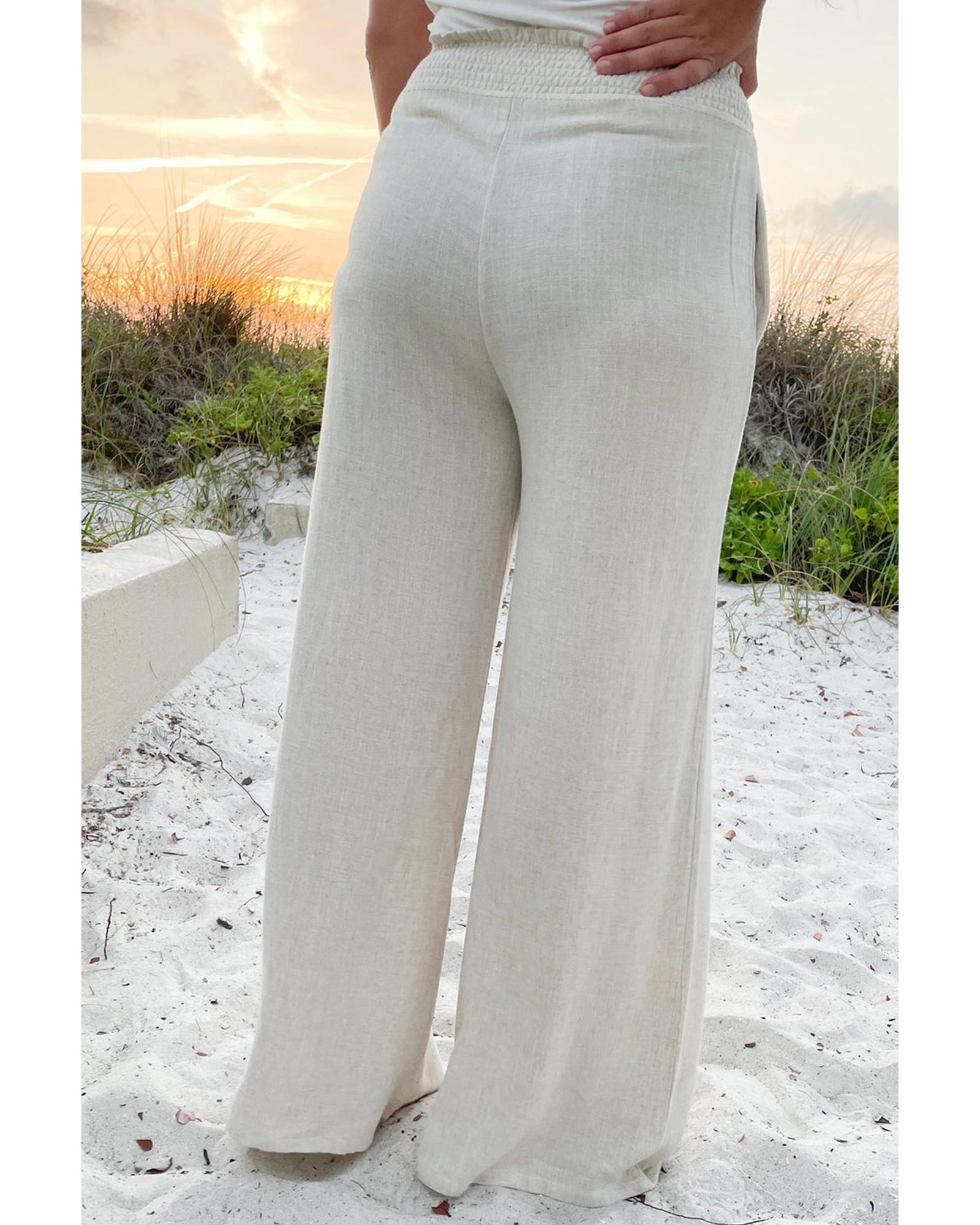 Beige Smocked High Waist Wide Leg Plus Size Pants – 3X