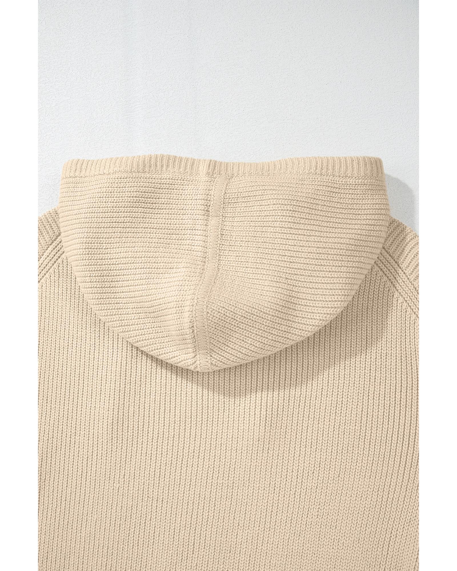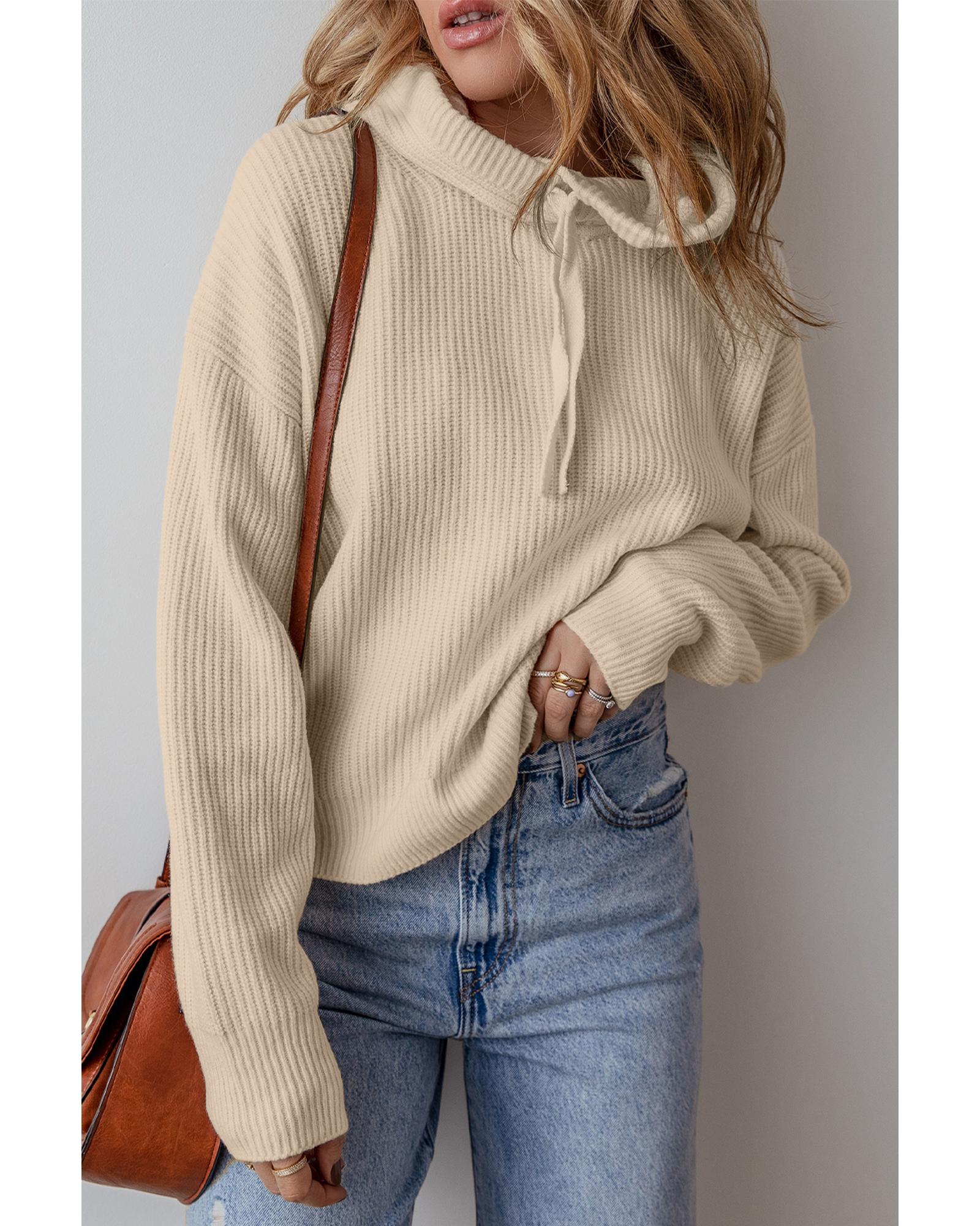 Beige Solid Color Drawstring Hooded Drop Shoulder Pullover Sweater – M
