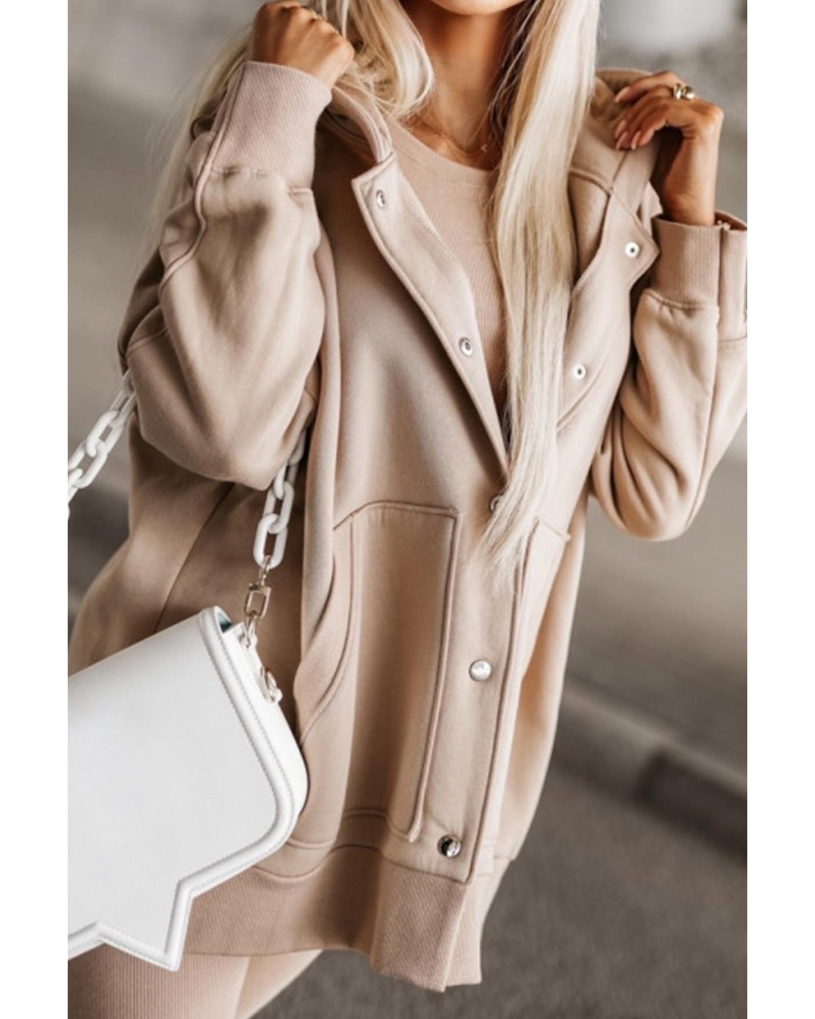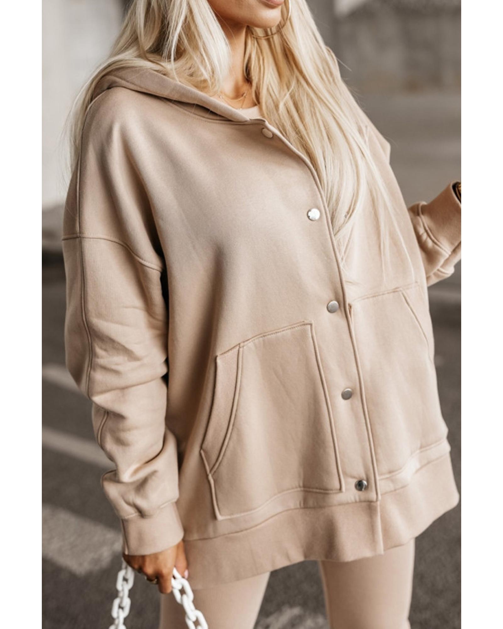 Beige Solid Color Pocketed Button Up Loose Hoodie – L