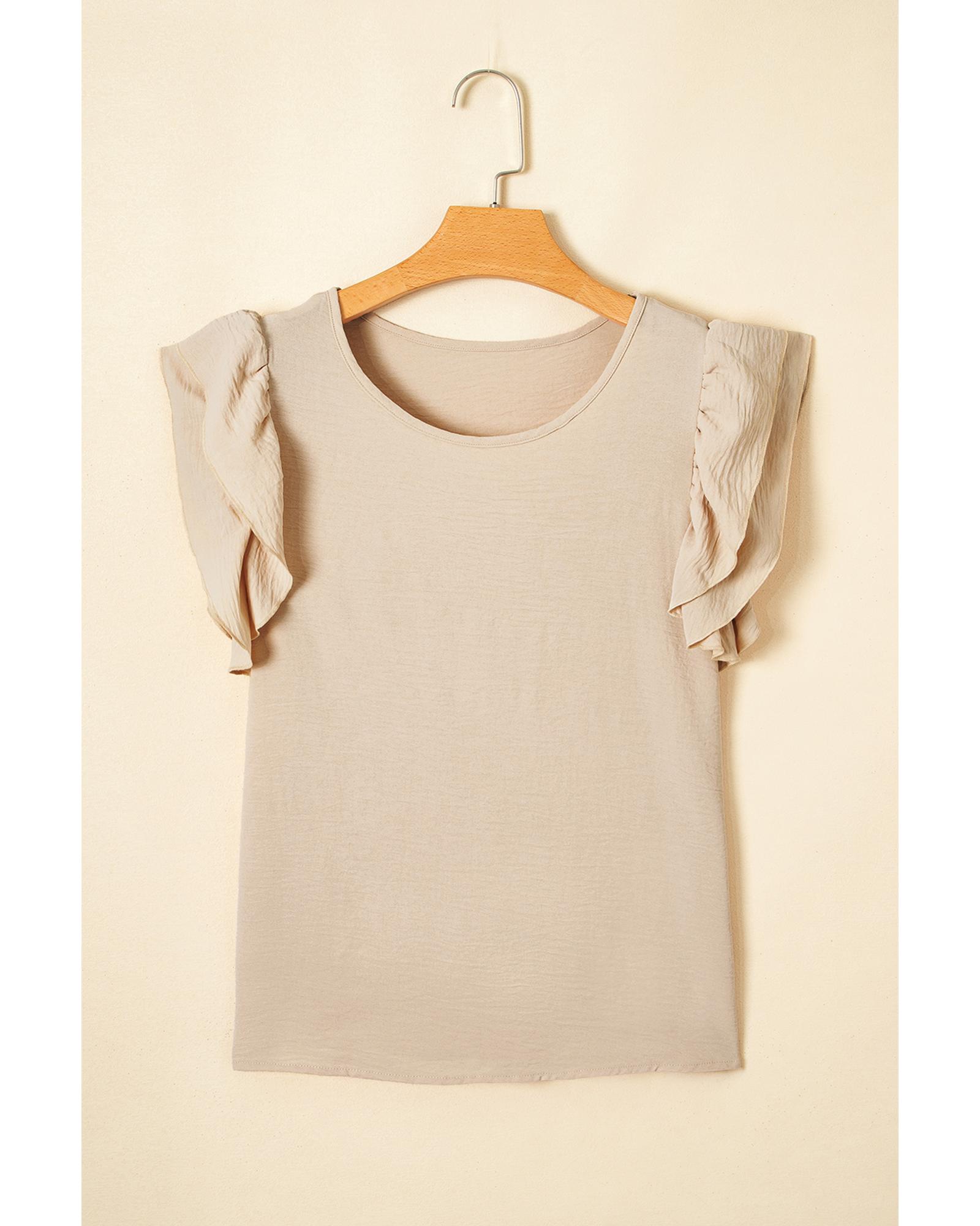 Beige Solid Color Ruffled Short Sleeve Casual Blouse – L