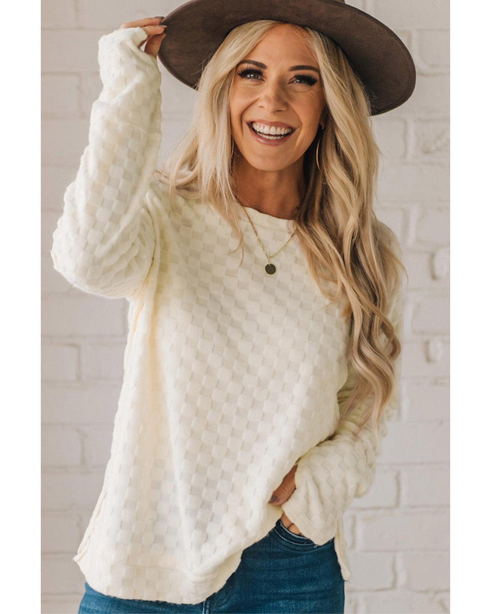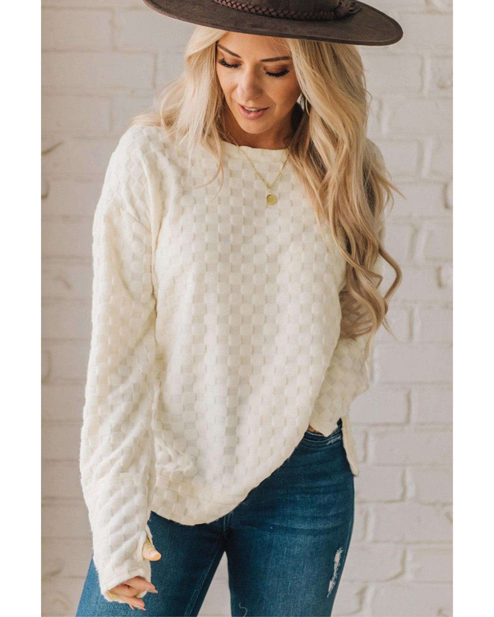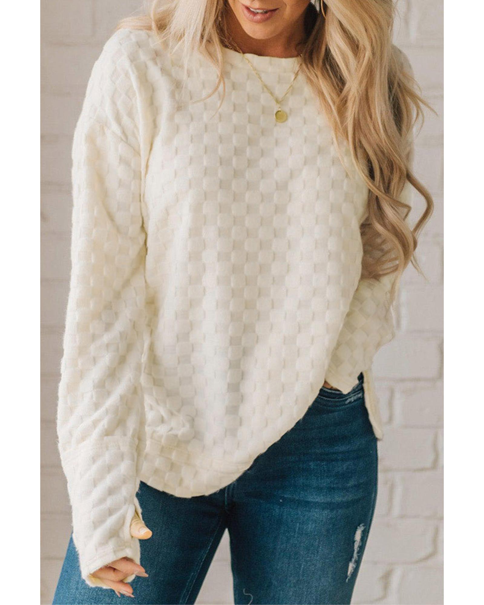 Beige solid textured thumbhole sleeve top Must - have item for autumn wardrobe Unique textured design for visual effect Crew neck thumbhole sleeves and side slits Versatile and suitable for most occasions