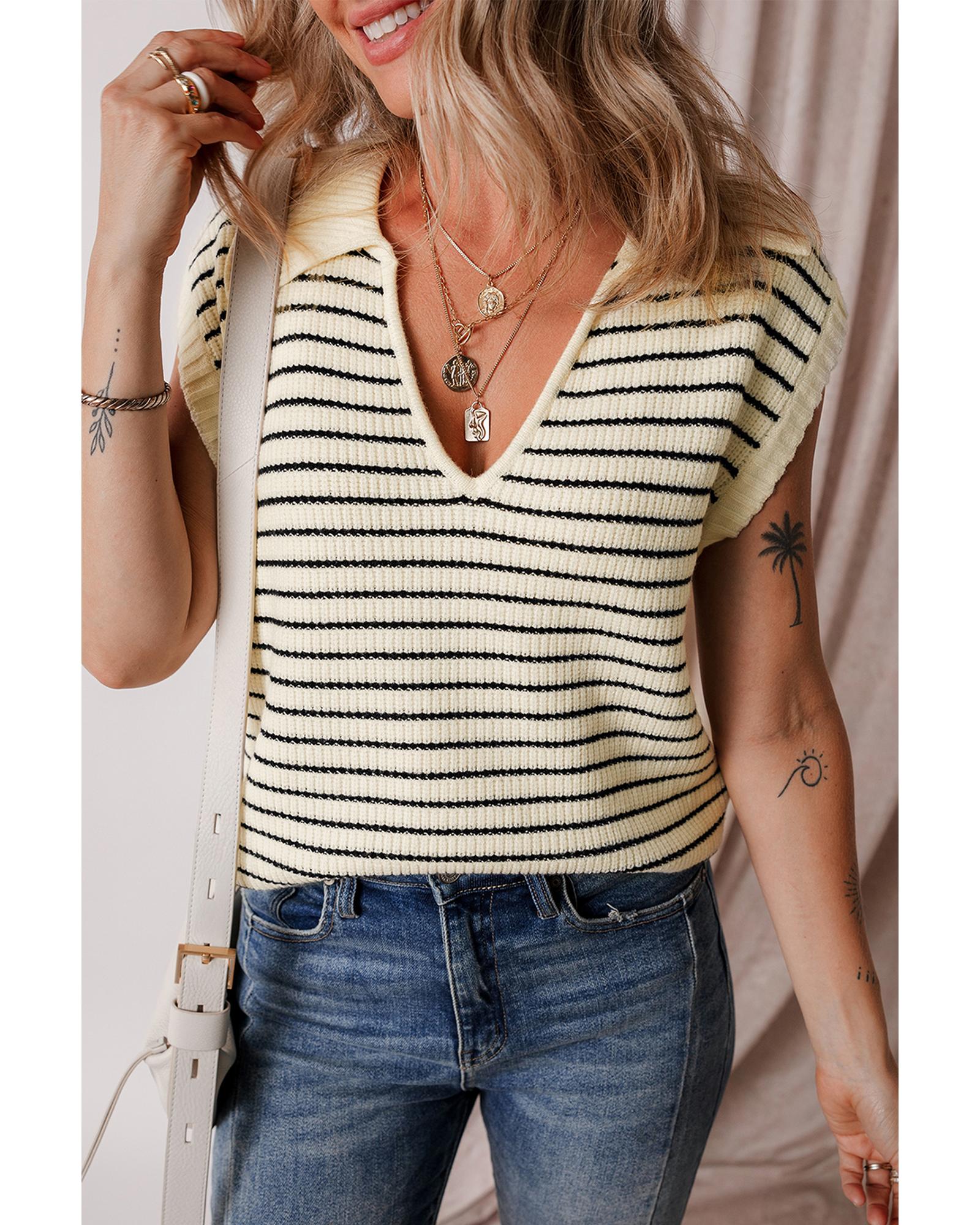 Beige Stripe Turn-down V Neck Sweater Tank Top – XL
