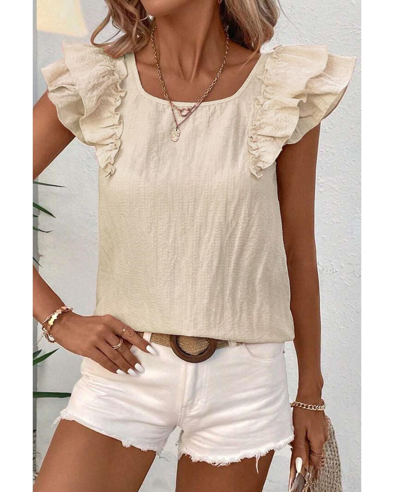 Beige Textured Bow Knot Frilled Butterfly Sleeve Blouse – L