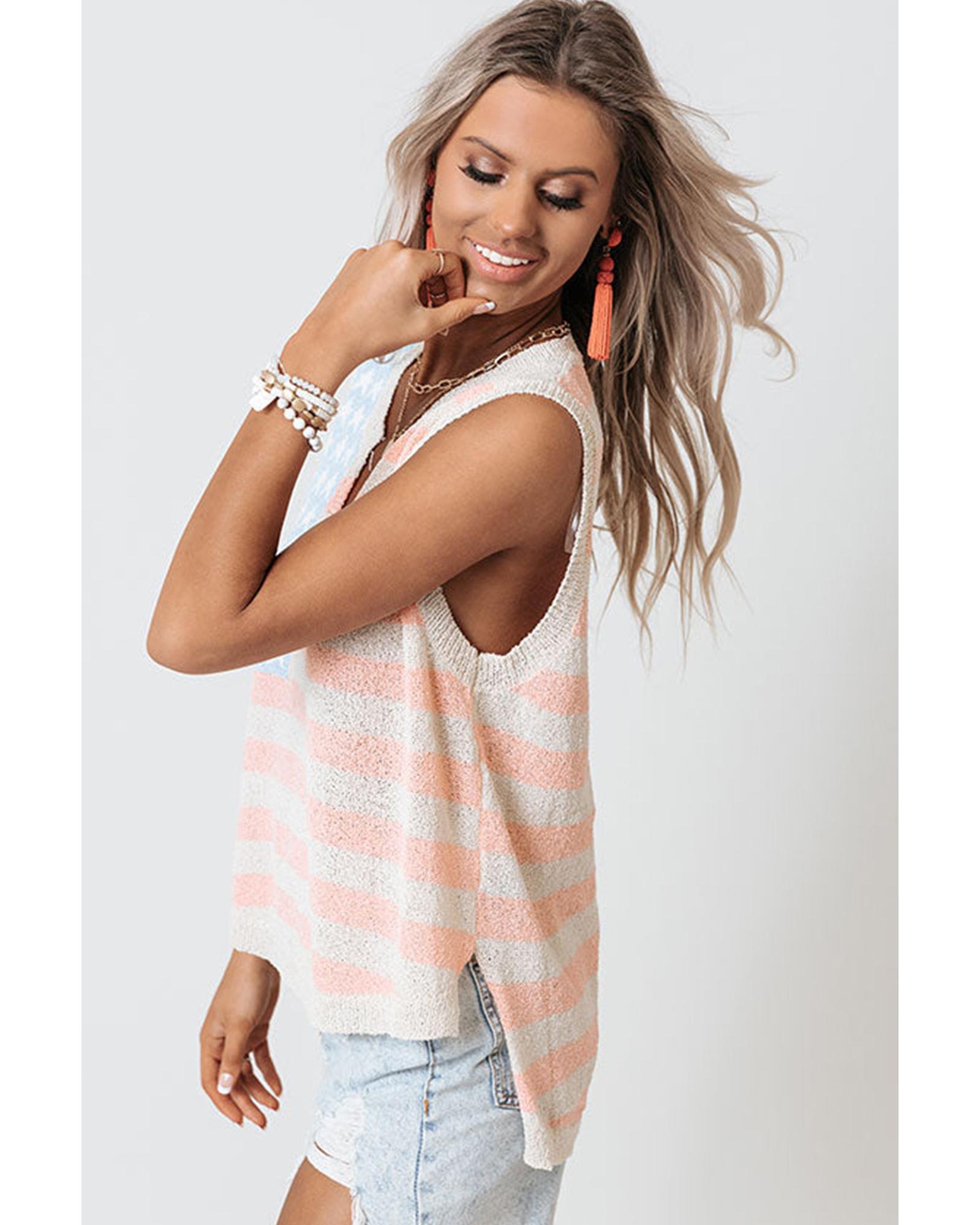 - Beige USA Flag Notched Neckline Loose Sweater Vest