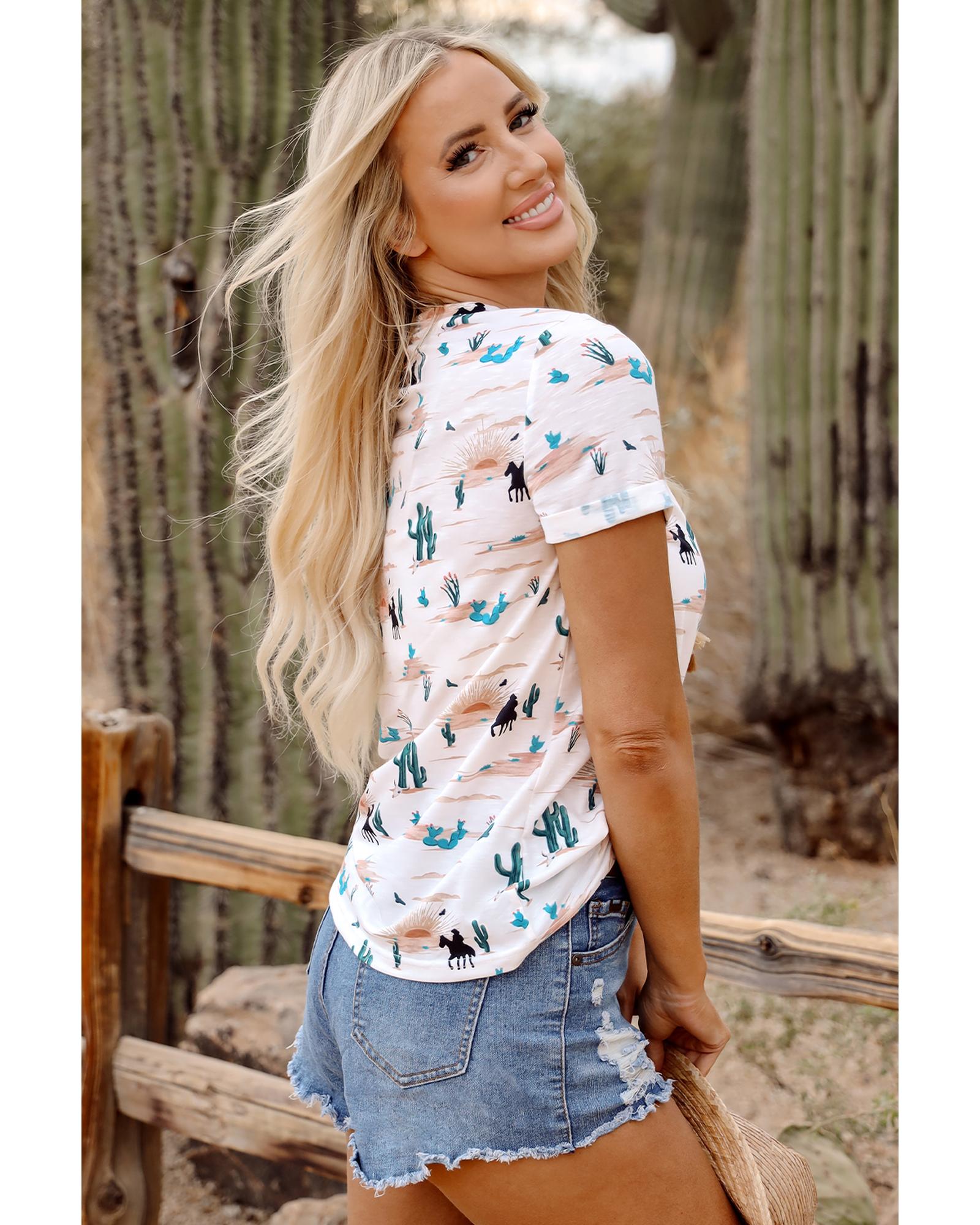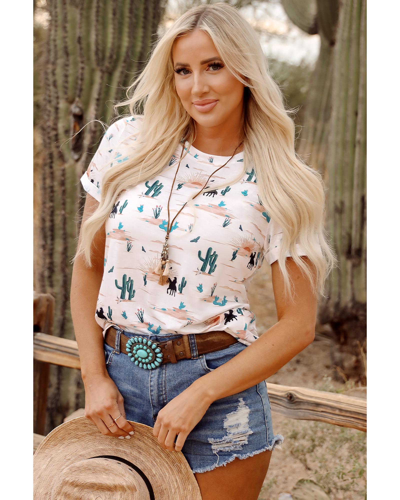 - Beige Western Cactus Print Crew Neck Short Sleeve Top