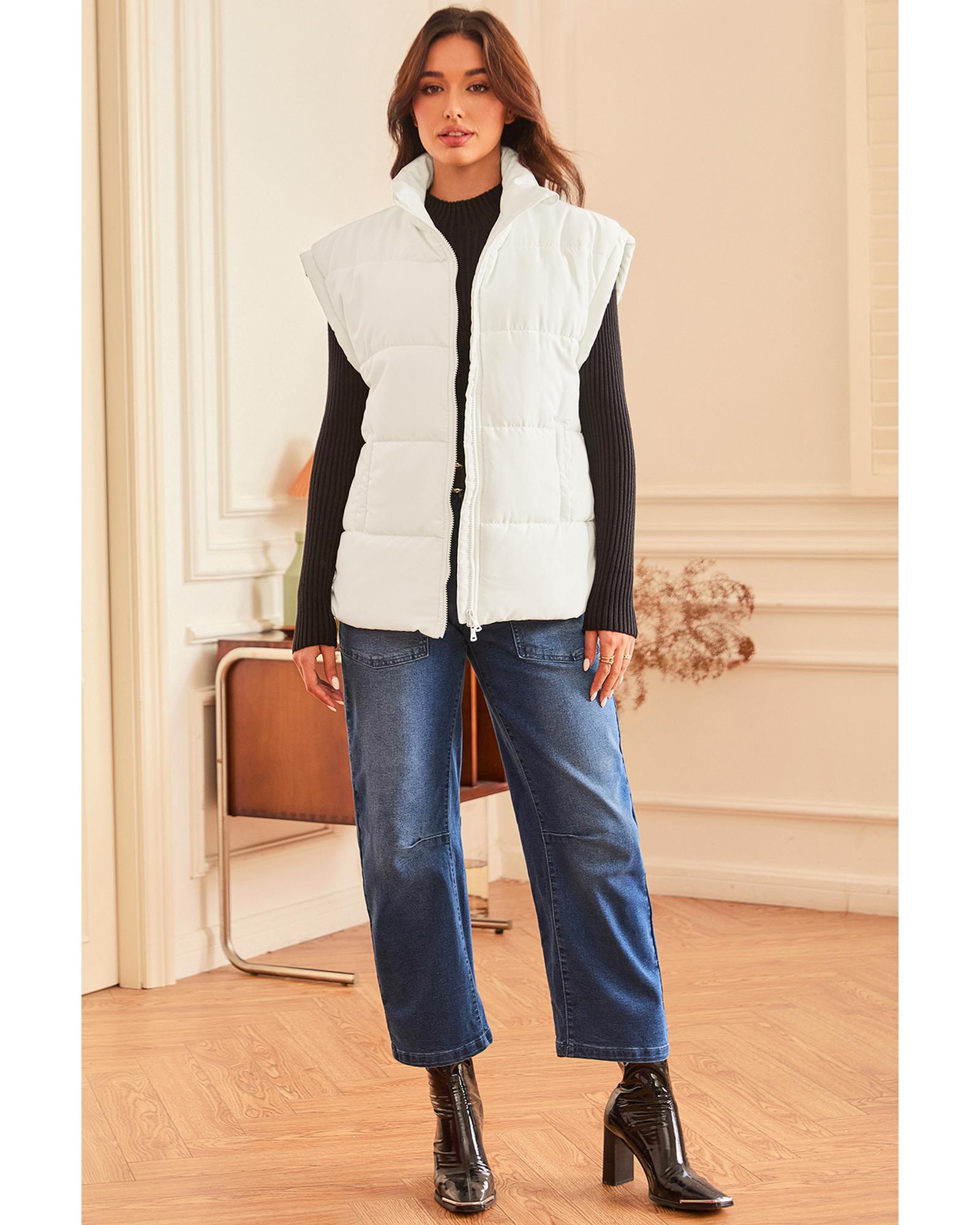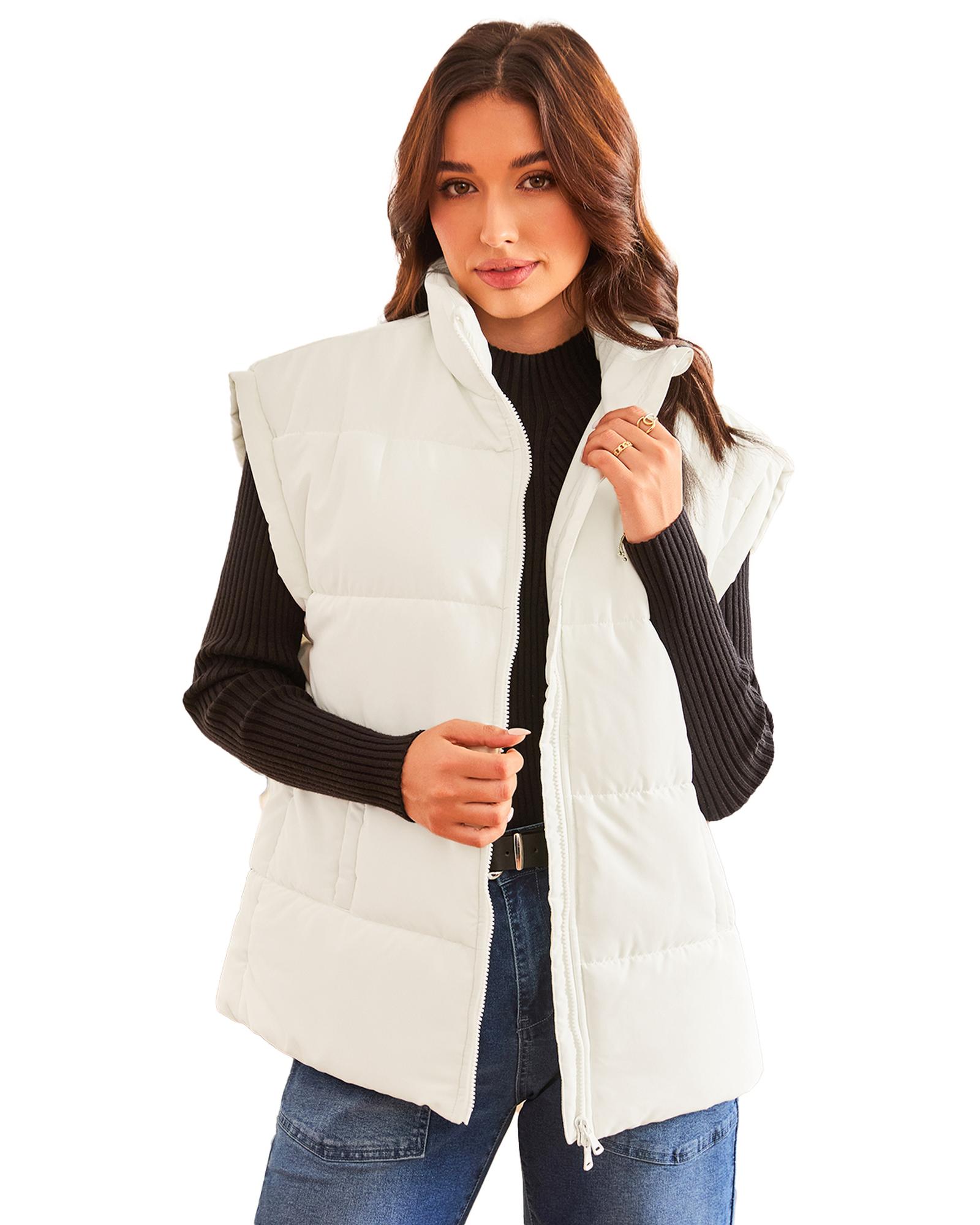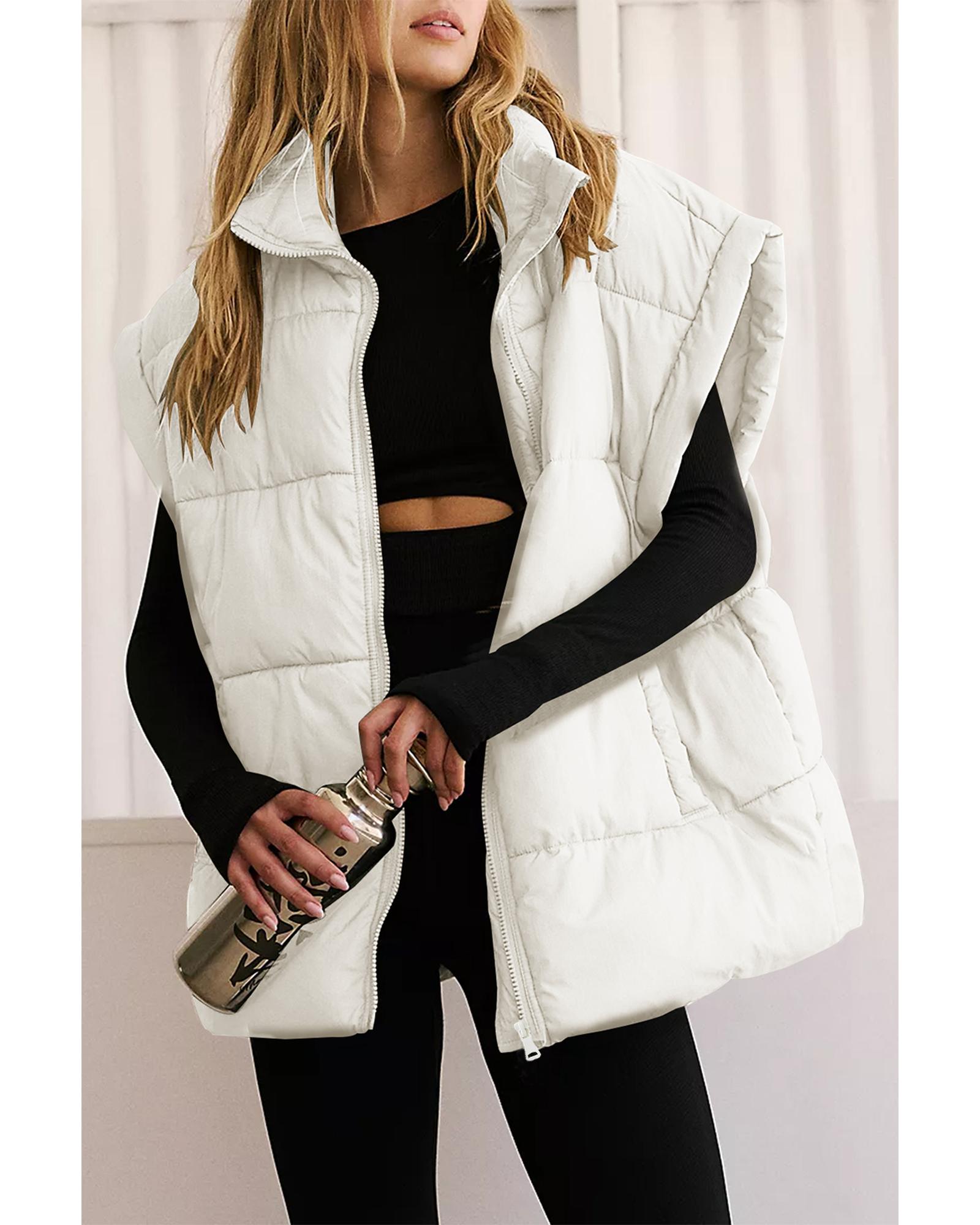 Beige Zipper Stand Neck Oversized Puffer Vest – M