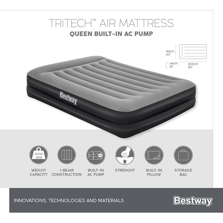 Bestway 2.03m x 1.52m x 46cm Tritech Air Mattress Queen Built-in AC pump