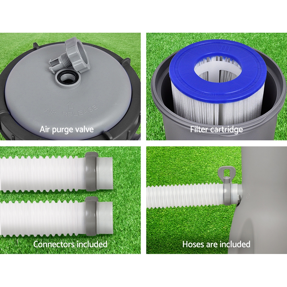 Designed to work specifically with Bestway above-ground swimming pools that use between 1,100 and 17,400 litres of water, the Bestway Filter Pump helps to filter and clean the pool water of dirt and contaminants. The pool water is pumped through a cartridge filter at a rate of 2006 litres/hour and returned filtered and cleaned. The pool system water flow rate is 530 gal/hour. Not least, an air purge valve helps to release air to prevent pressure build-up. Also included is a 10.6cm x 20.3cm filter cartridge and adaptors for pool valves.